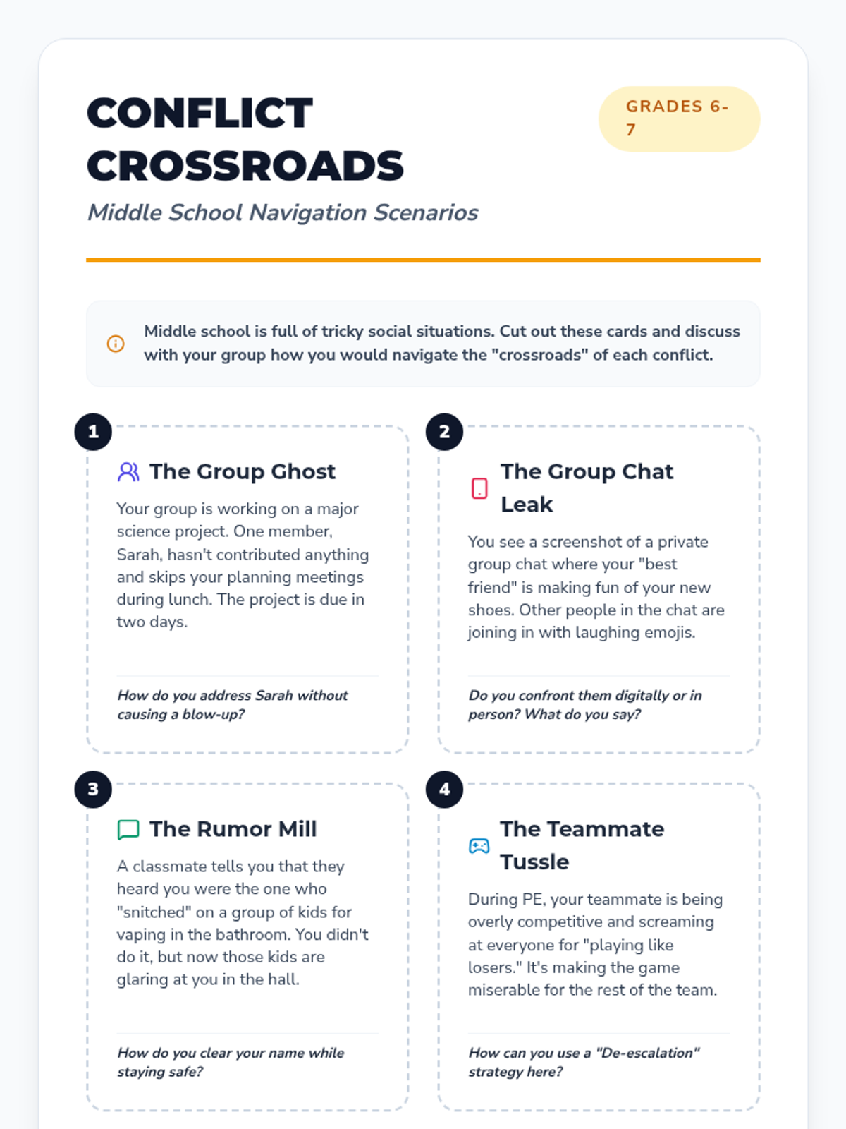 Engages middle schoolers in critical thinking and problem-solving through realistic social scenarios and structured conflict resolution frameworks.