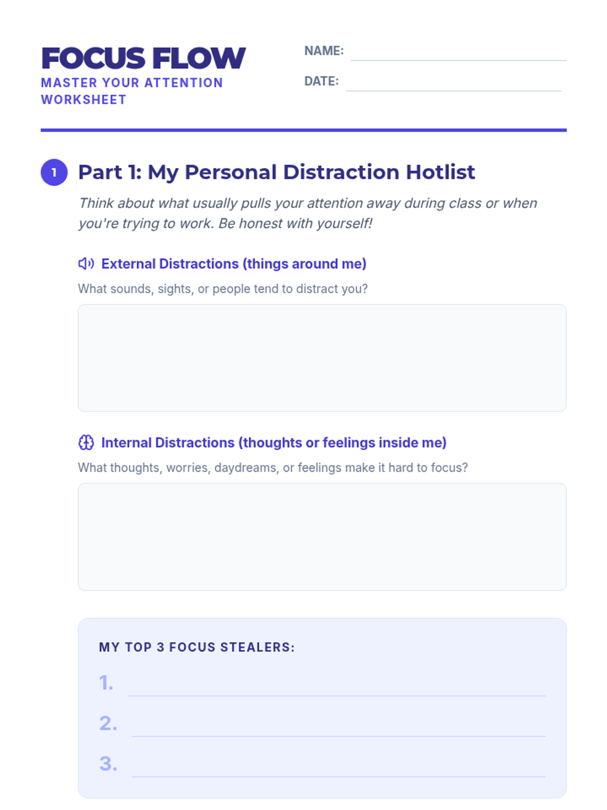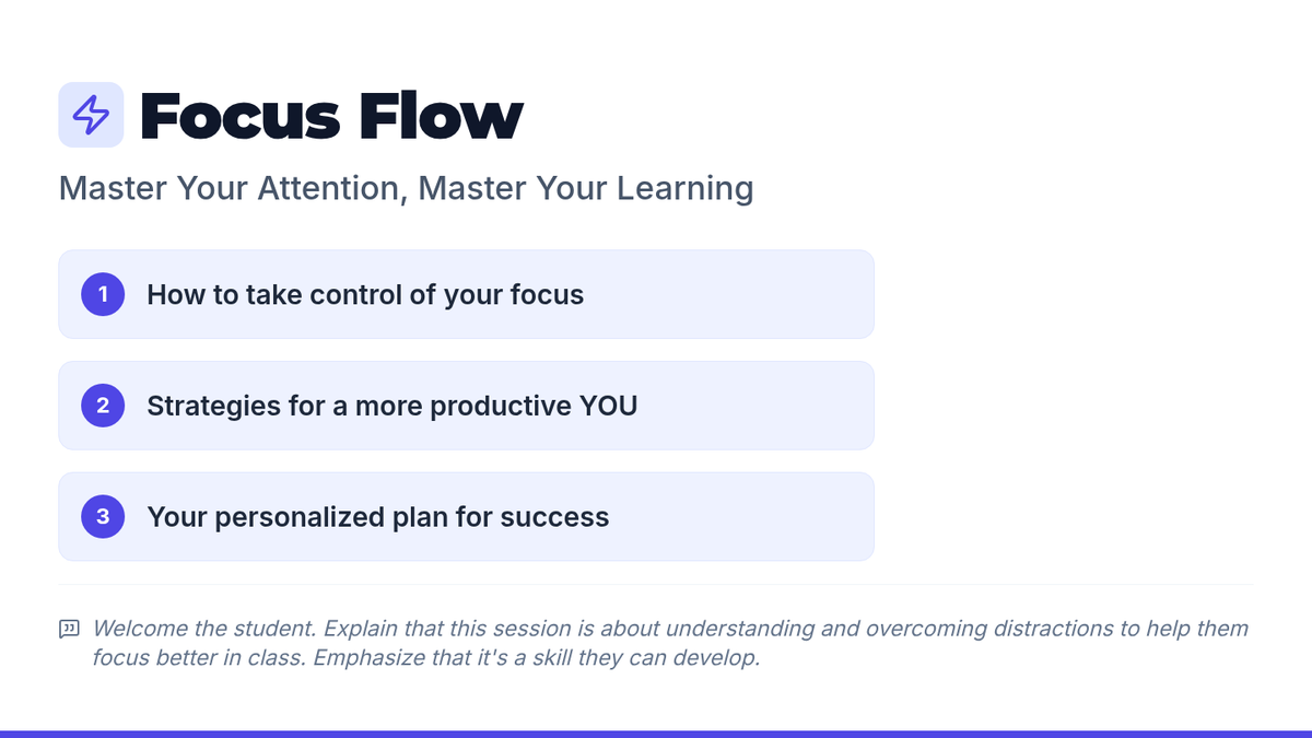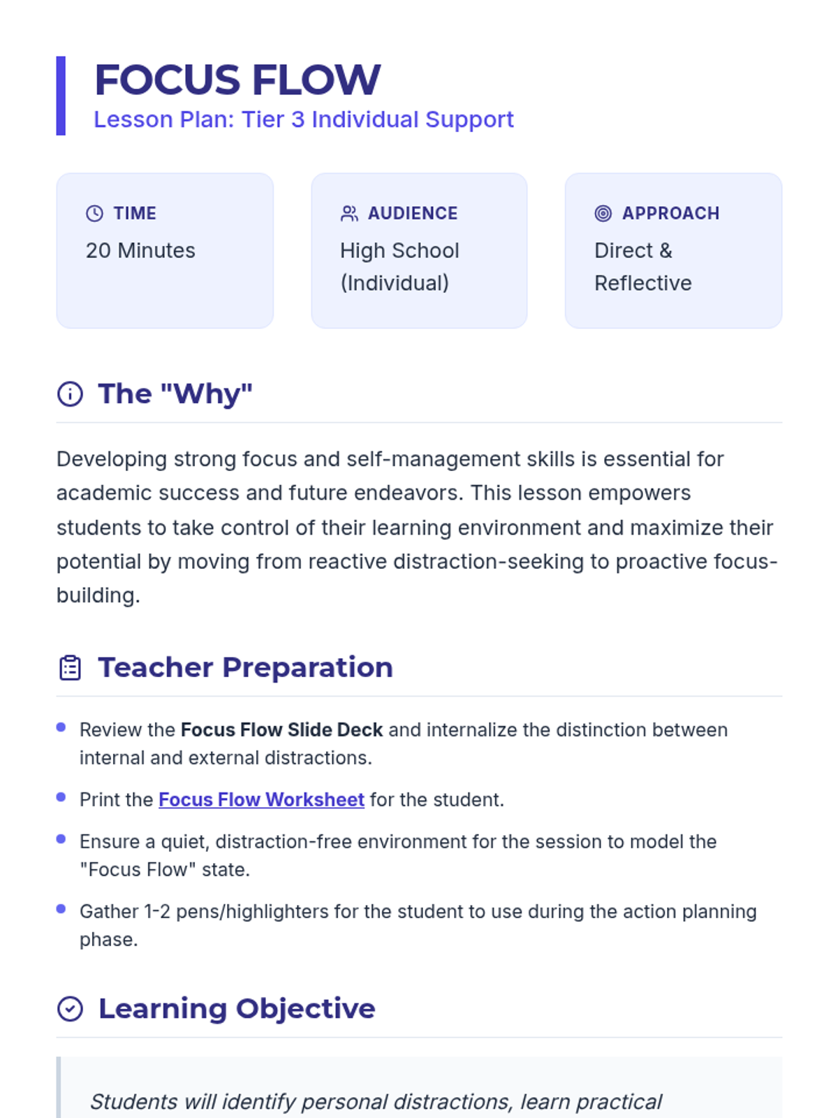 A 20-minute Tier 3 individual lesson for high school students focused on identifying distractions, learning focus strategies, and creating a personalized SMART action plan for classroom success.