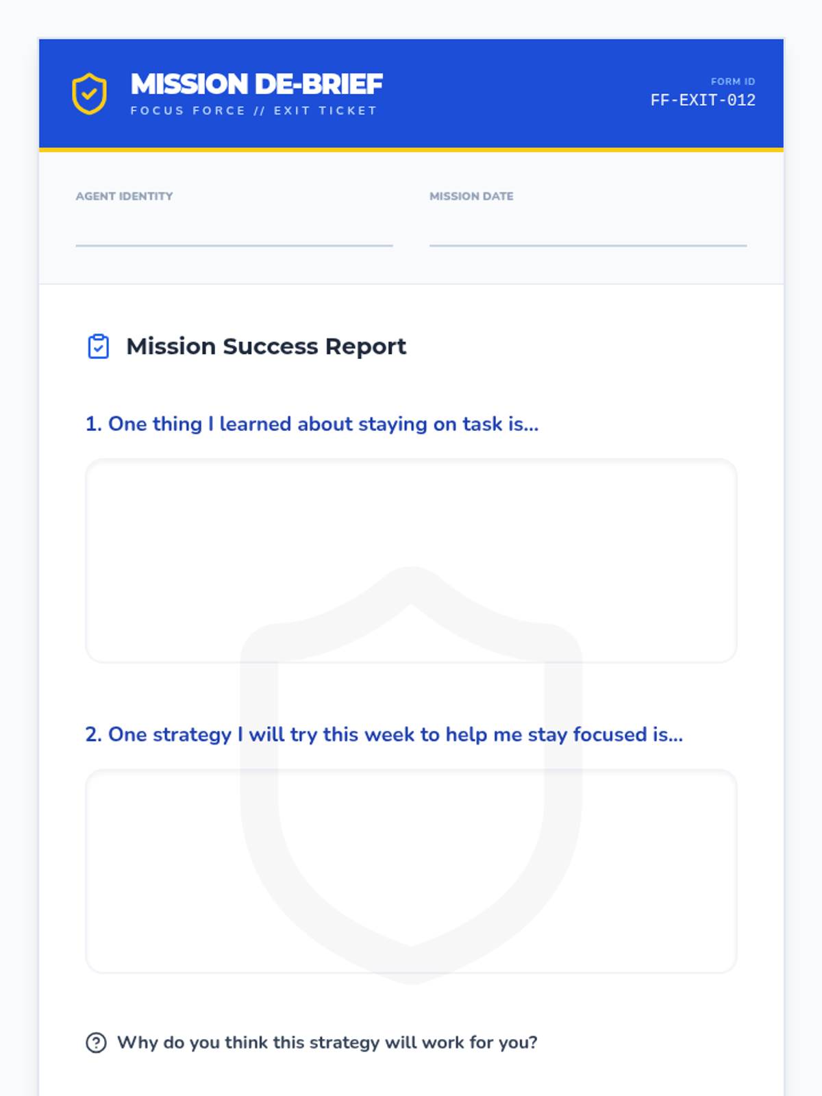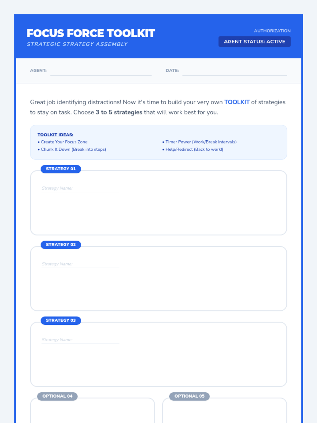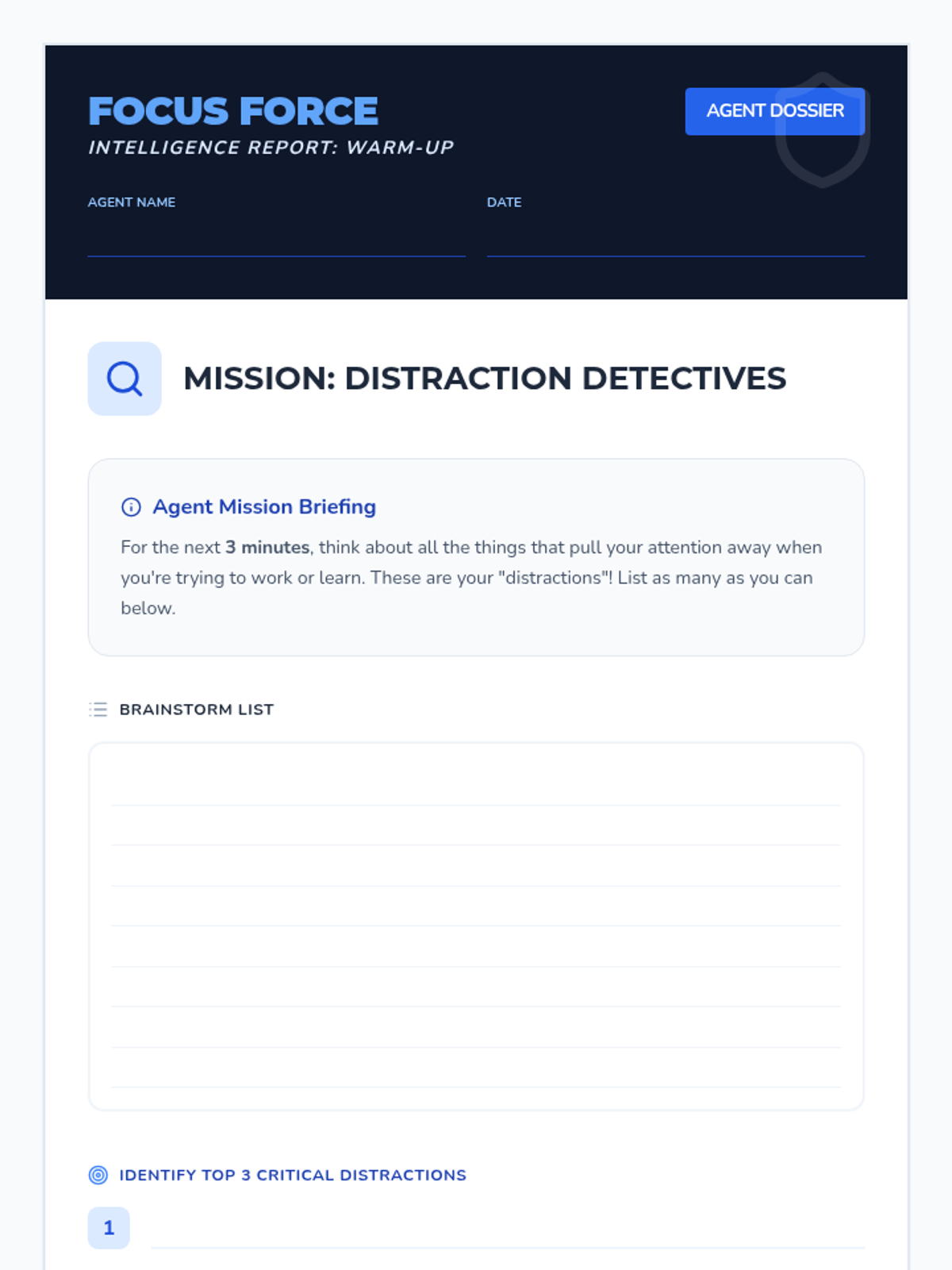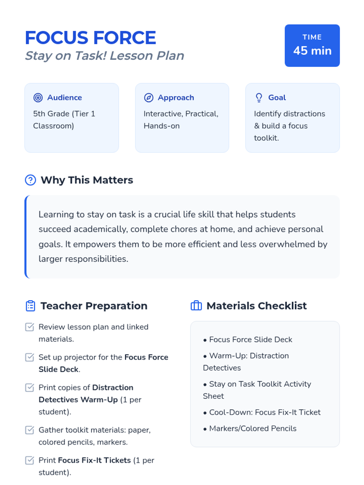 A 45-minute lesson for 5th graders to develop focus strategies, identify distractions, and build a personalized 'Focus Force Toolkit' for productivity.