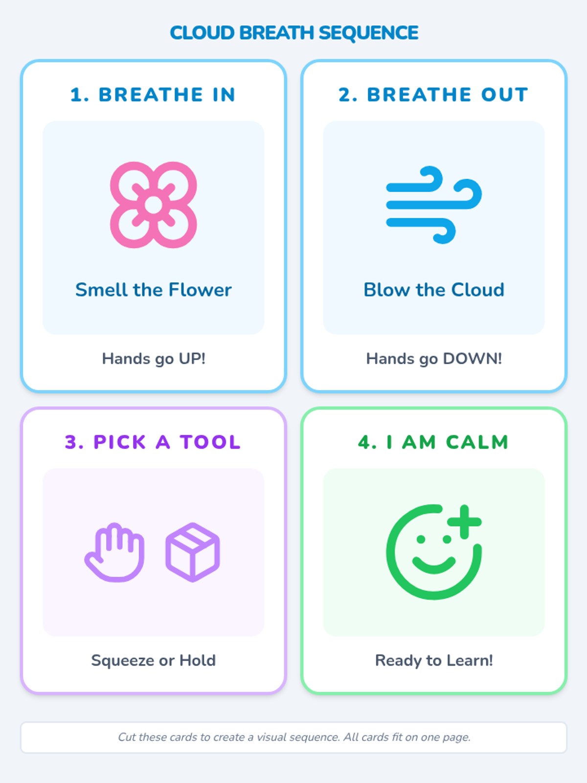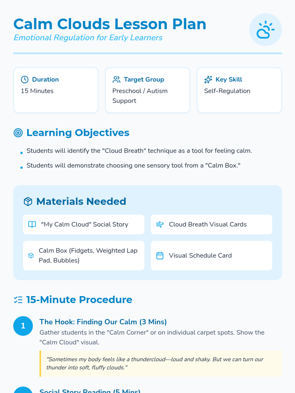 A 15-minute introductory lesson for preschool students with autism focusing on 'Cloud Breathing' and using sensory tools to regulate big emotions. The lesson includes a social story and visual aids to support predictable routines and clear expectations.