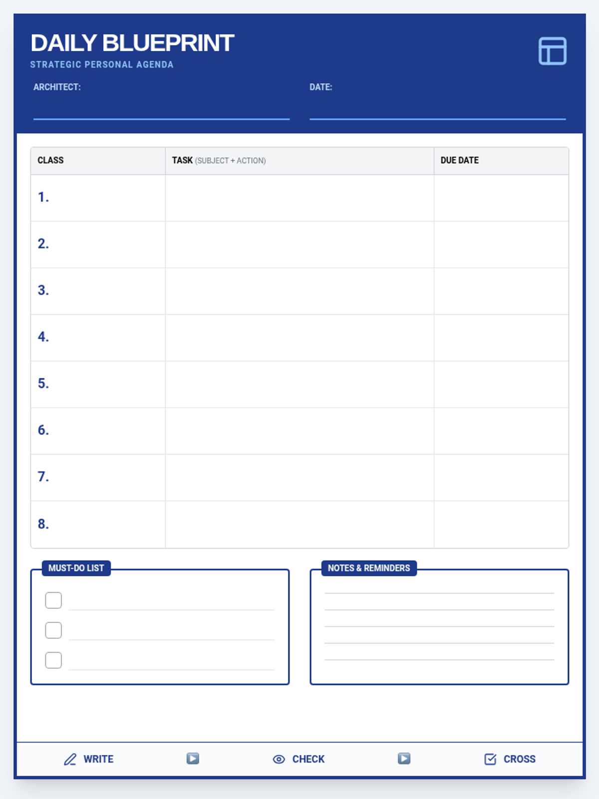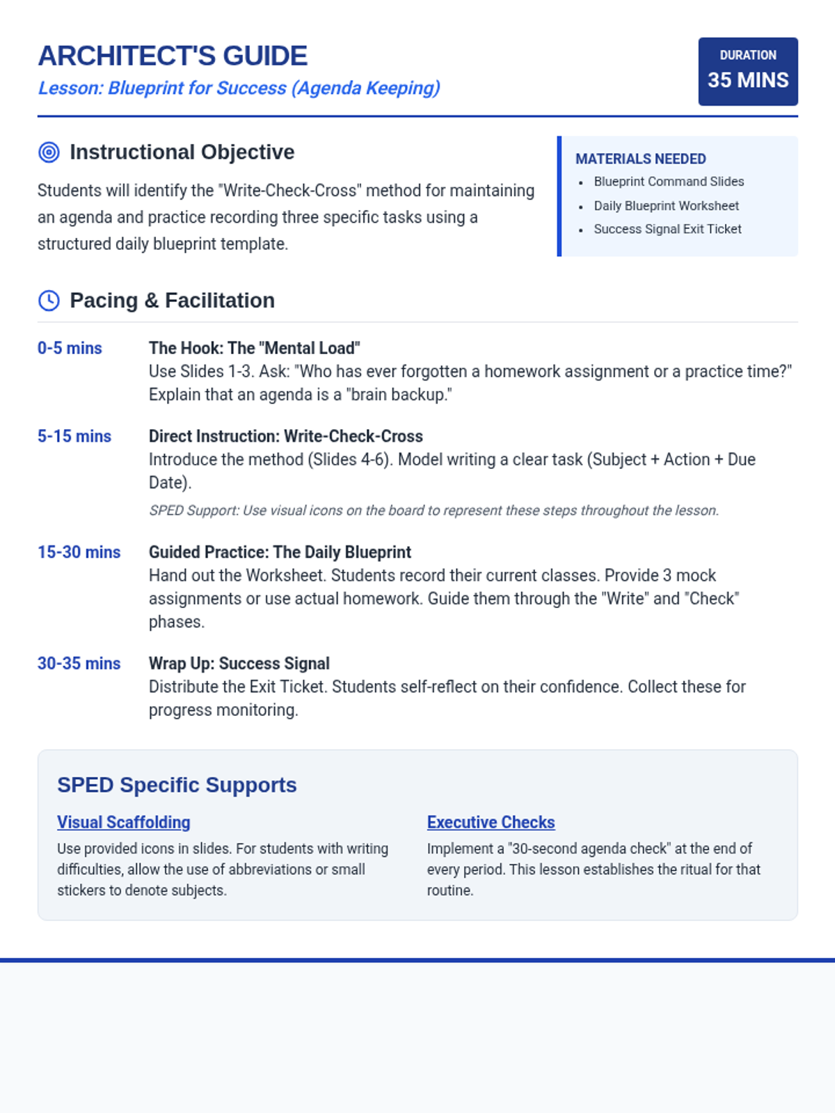 A 35-minute lesson focused on the executive functioning skill of maintaining an agenda, specifically designed for 10th-grade special education students using a "Blueprint" theme.