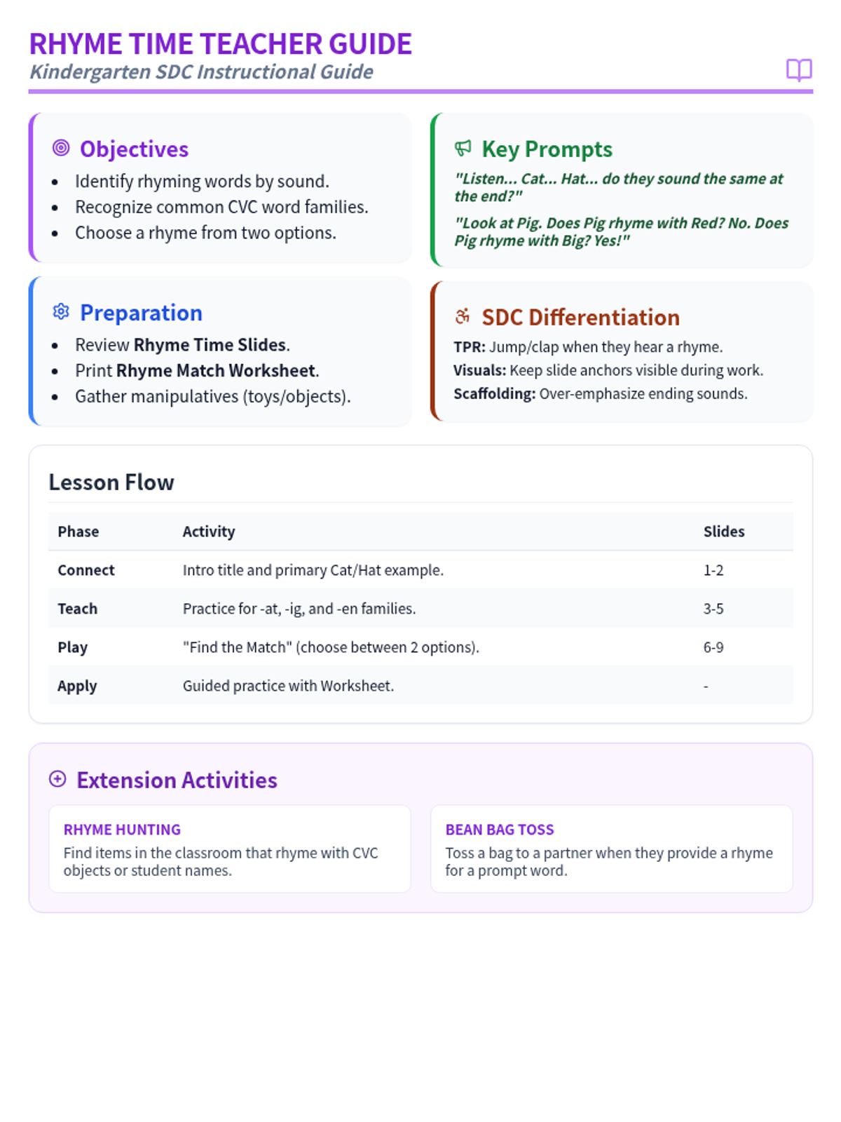An introductory lesson on rhyming concepts using CVC word families and sight words, specifically designed for Kindergarten SDC students.