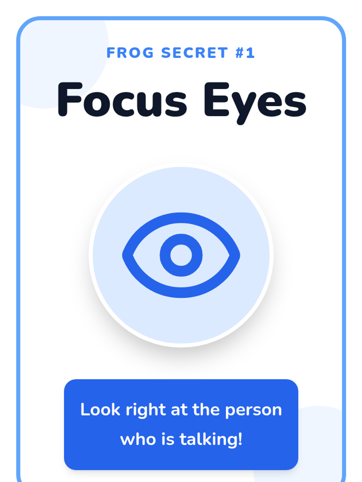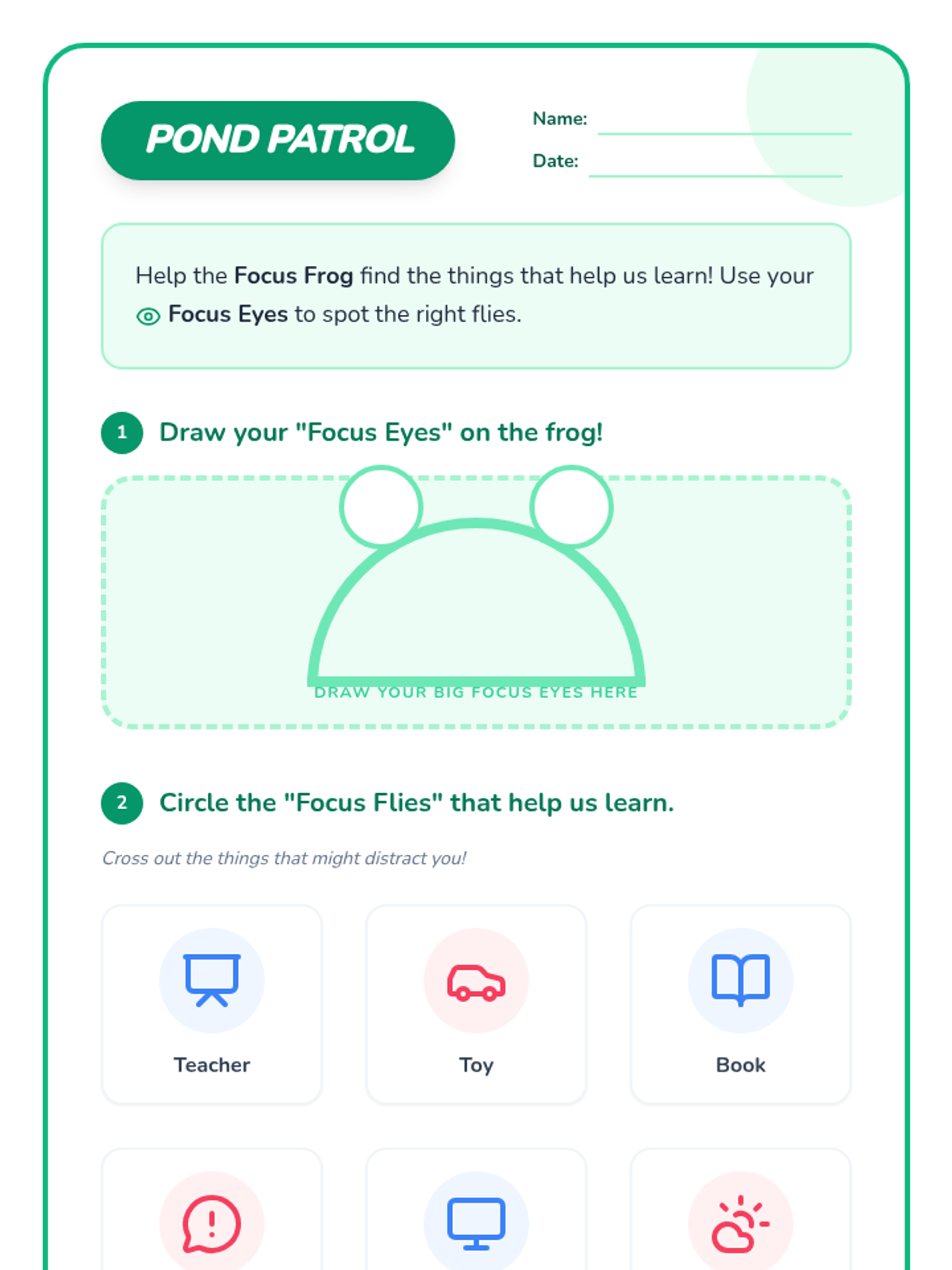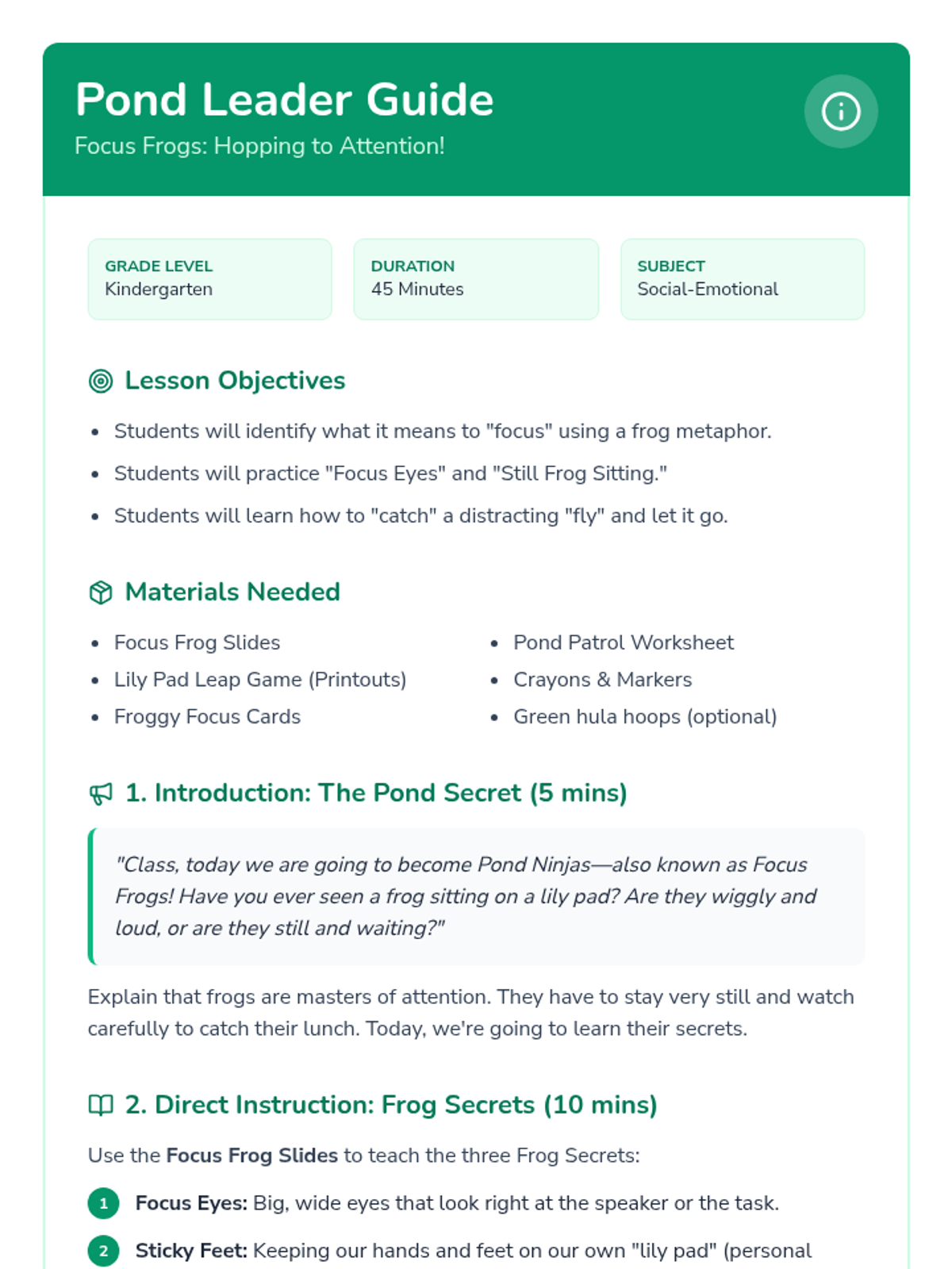 A Kindergarten lesson using a playful frog metaphor to teach attention skills and focusing strategies. Students learn to sit still like a frog, tune out distractions, and use 'focus eyes' to stay on task.
