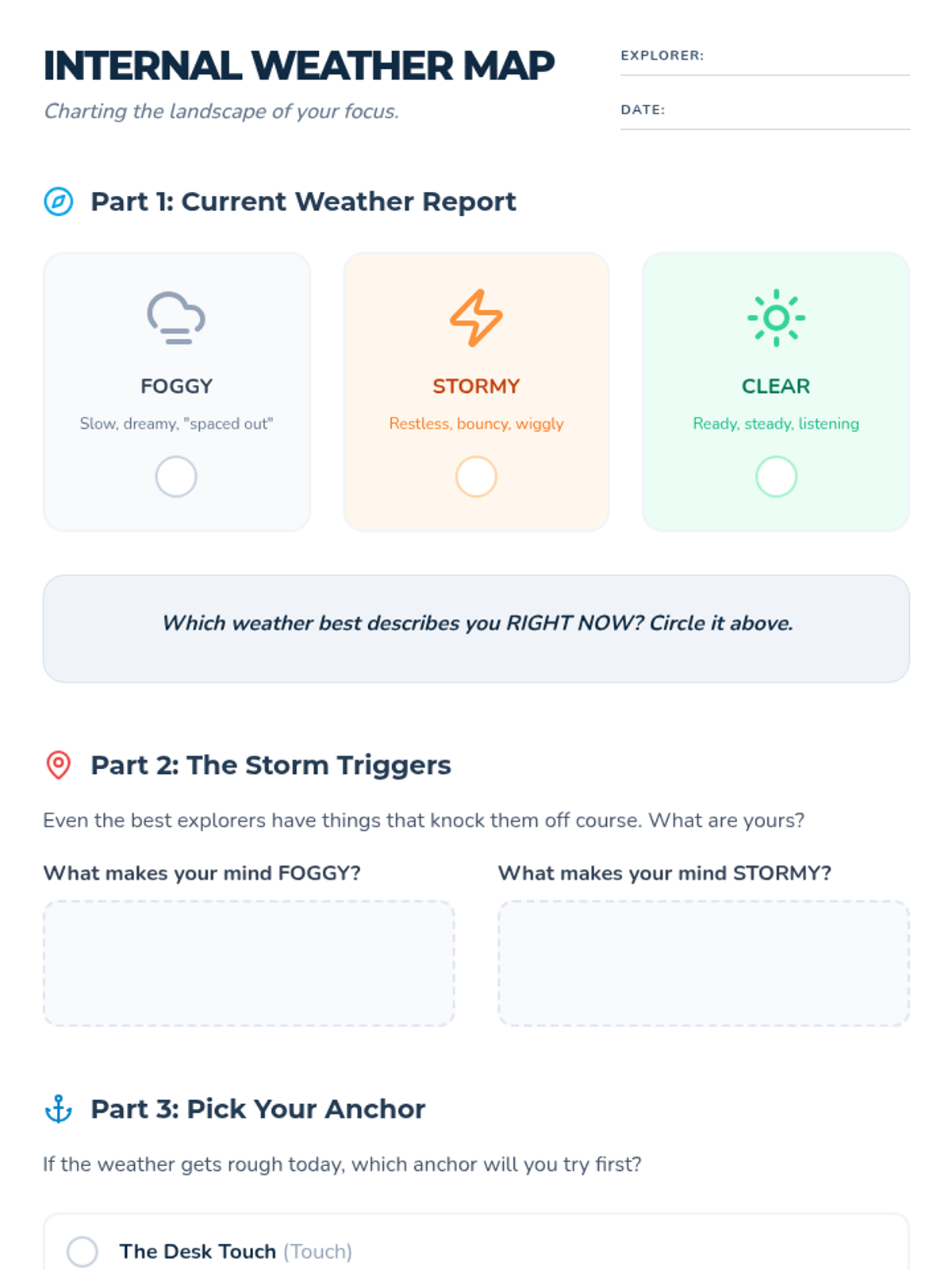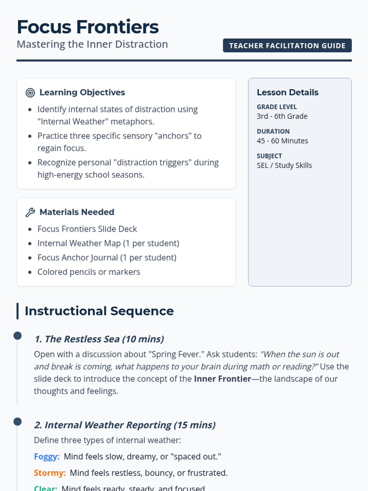 A social-emotional learning lesson for grades 3-6 focused on self-regulation and focus. Students learn to identify their 'internal weather' and use sensory anchors to navigate distractions during restless seasons.