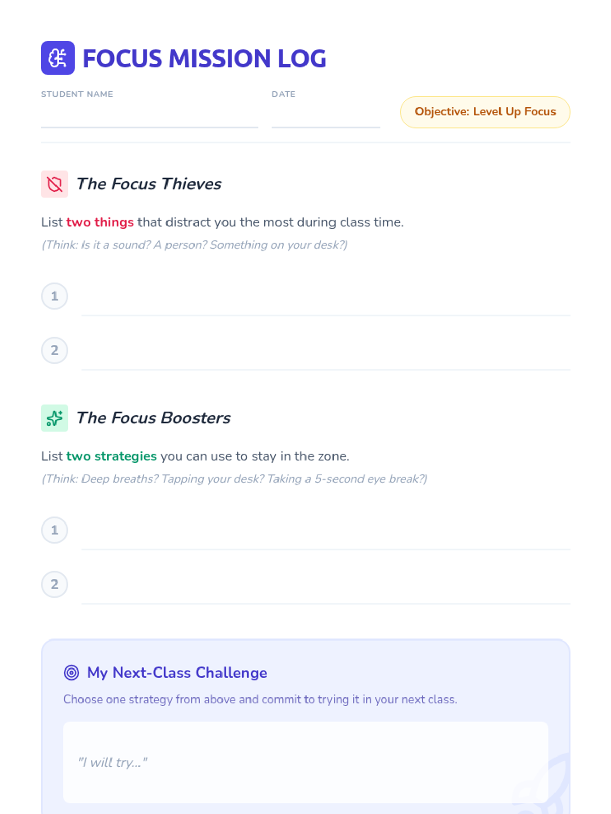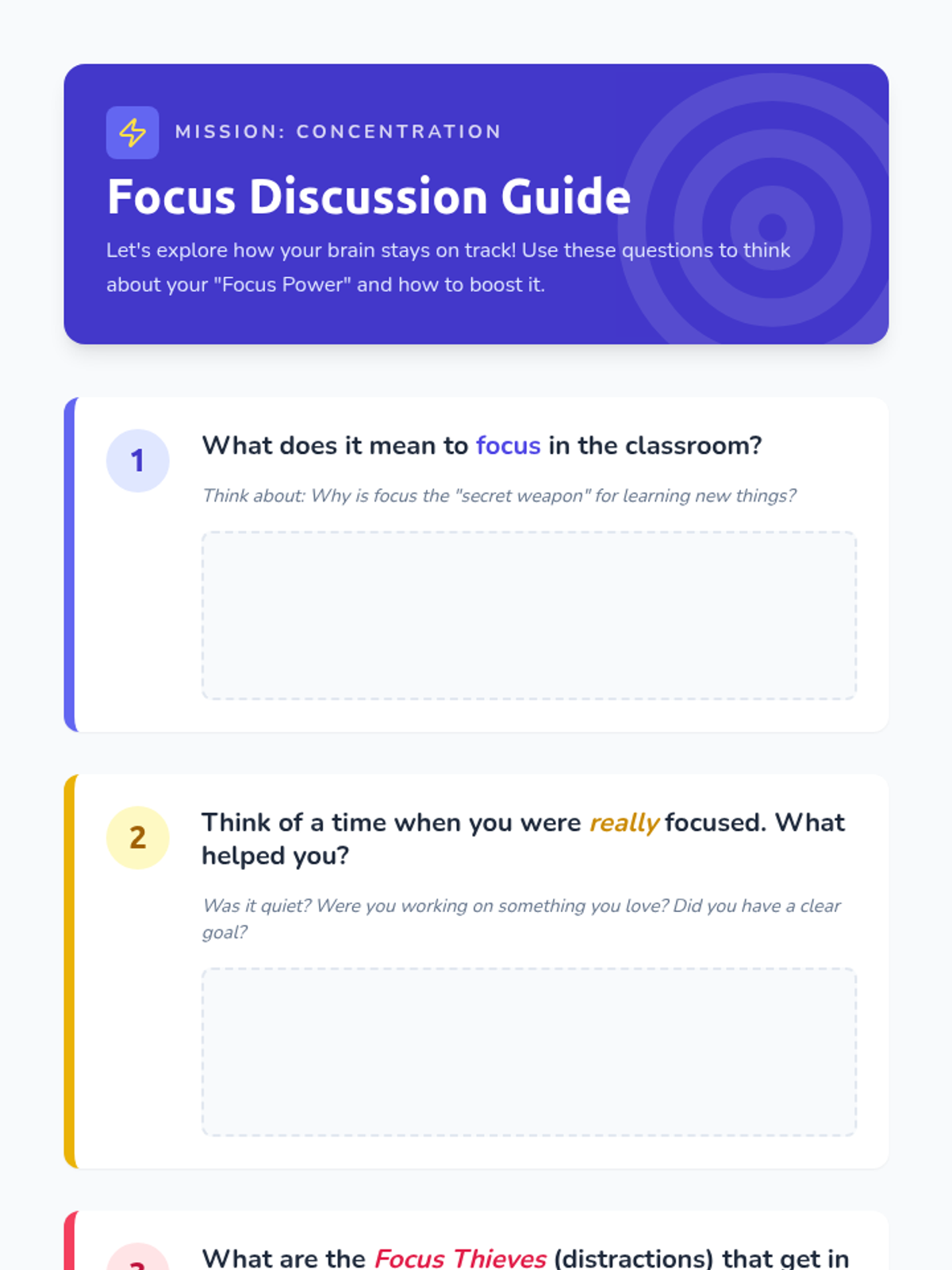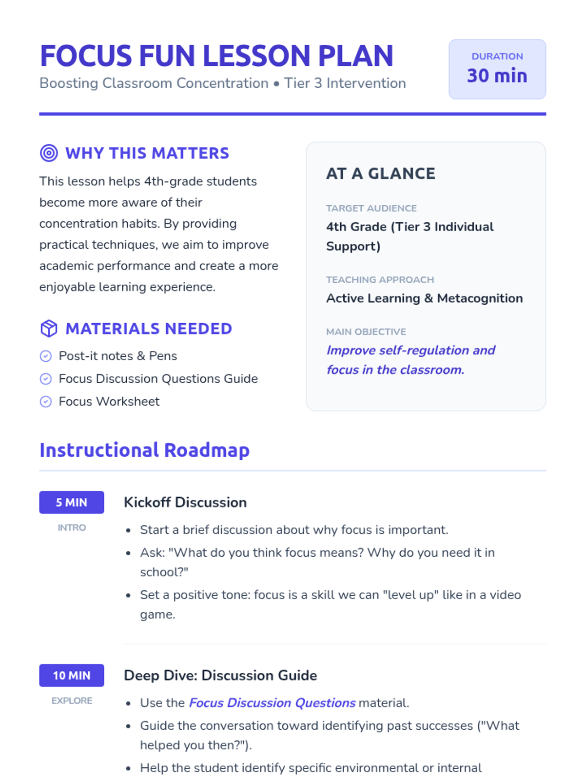 A Tier 3 intervention lesson designed for a 4th-grade student to improve classroom concentration through interactive discussion and self-reflection activities.
