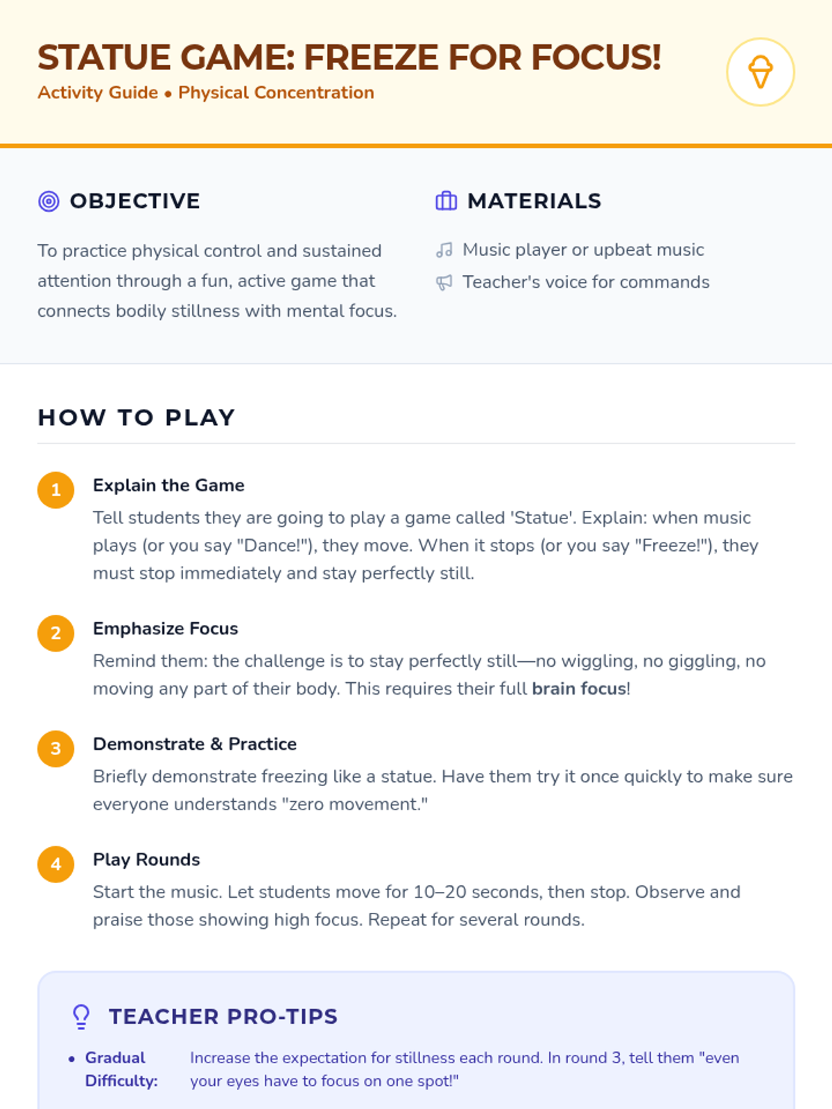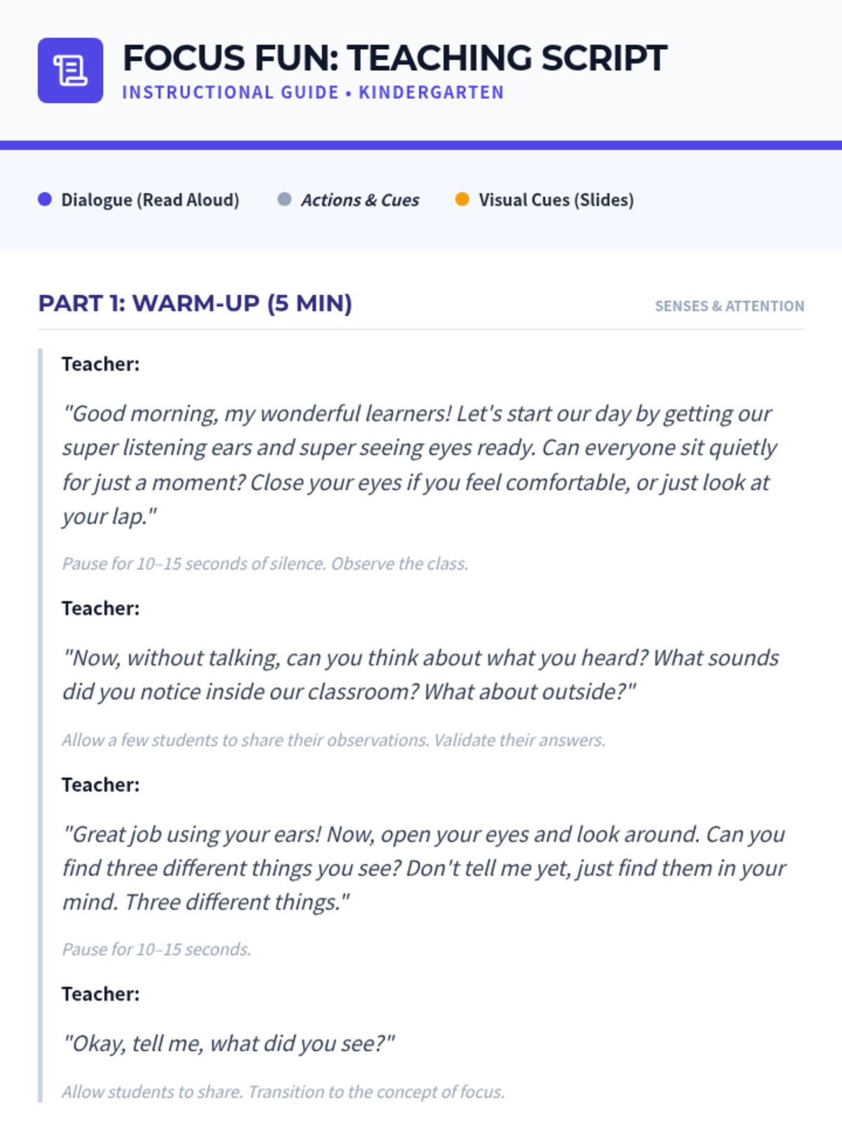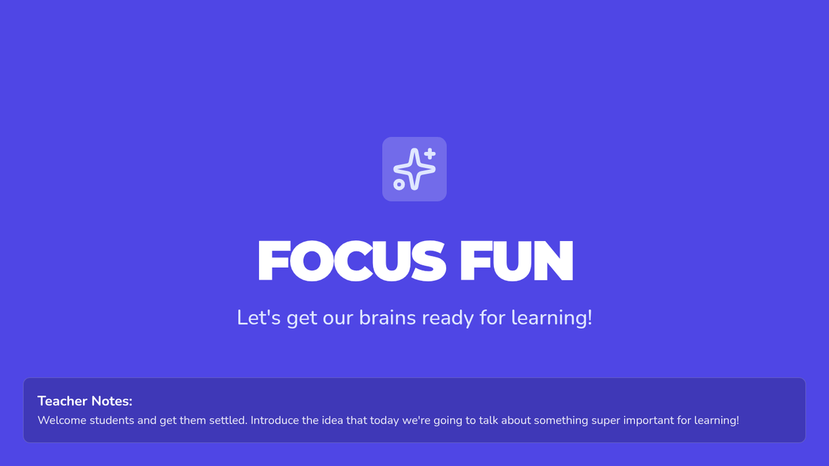 A high-energy, interactive lesson for Kindergarten students to learn the concept of 'focusing' through games and mindful activities, building foundational social-emotional and classroom skills.