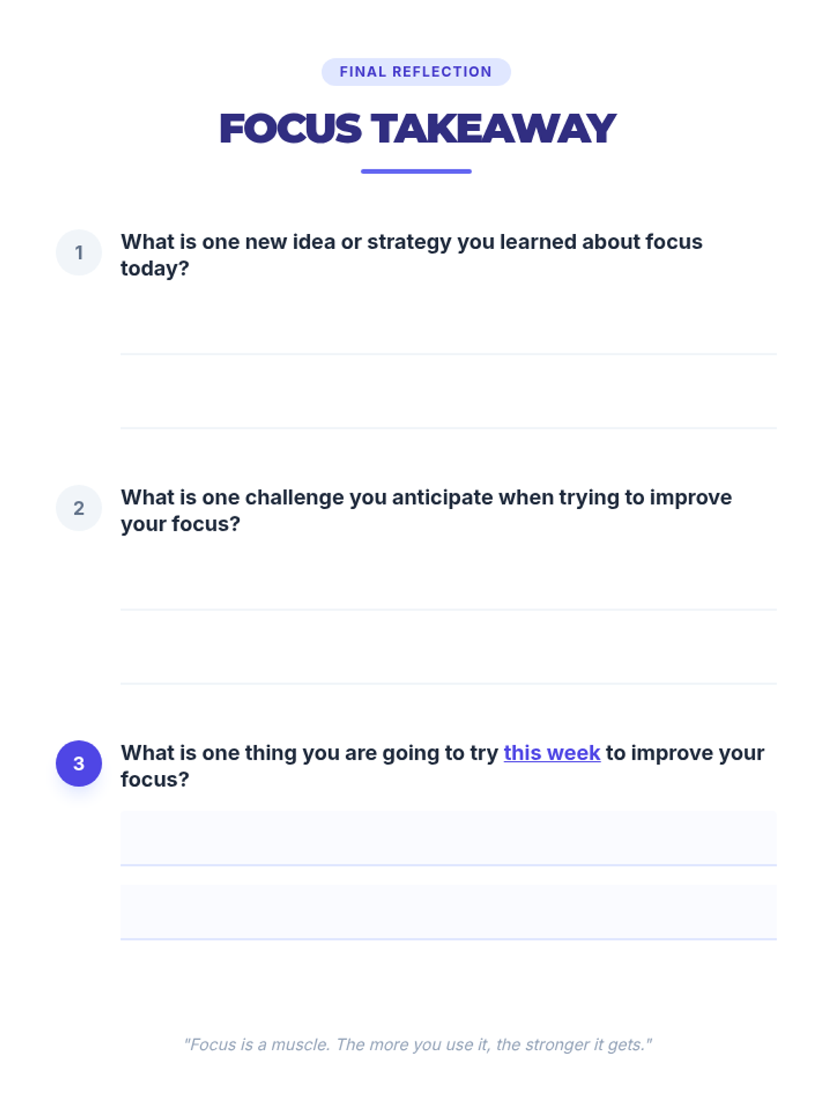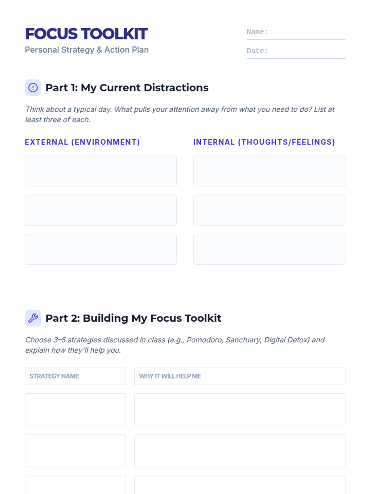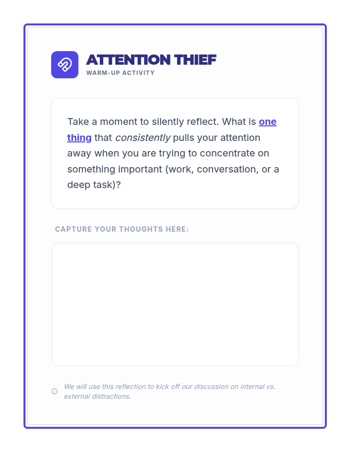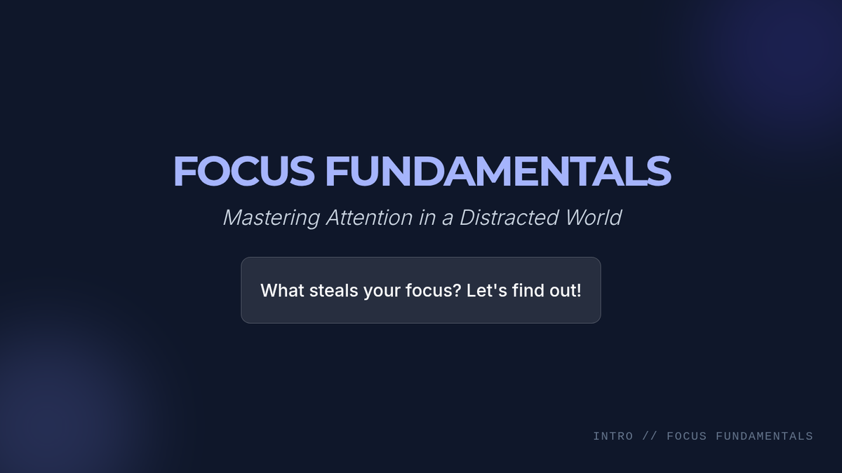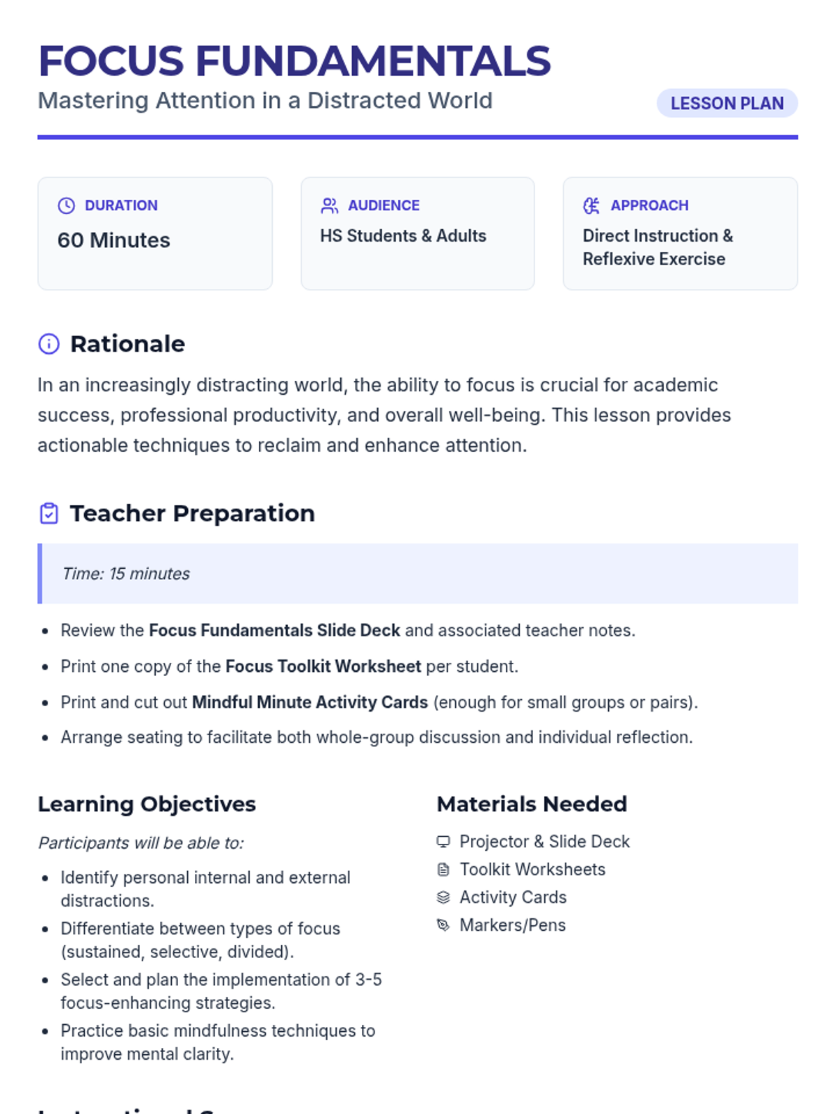 A 60-minute lesson for high school students and adults focused on identifying distractions, understanding focus types, and building a practical toolkit for sustained attention and mindfulness.