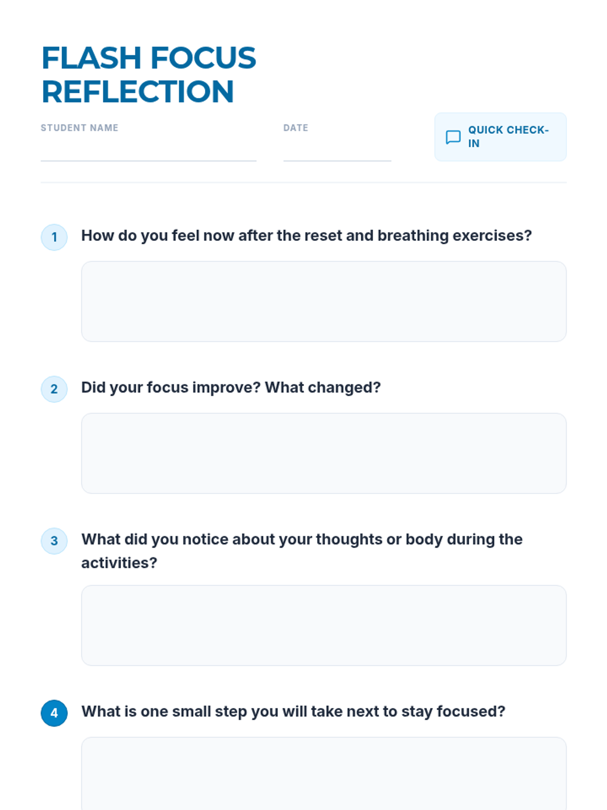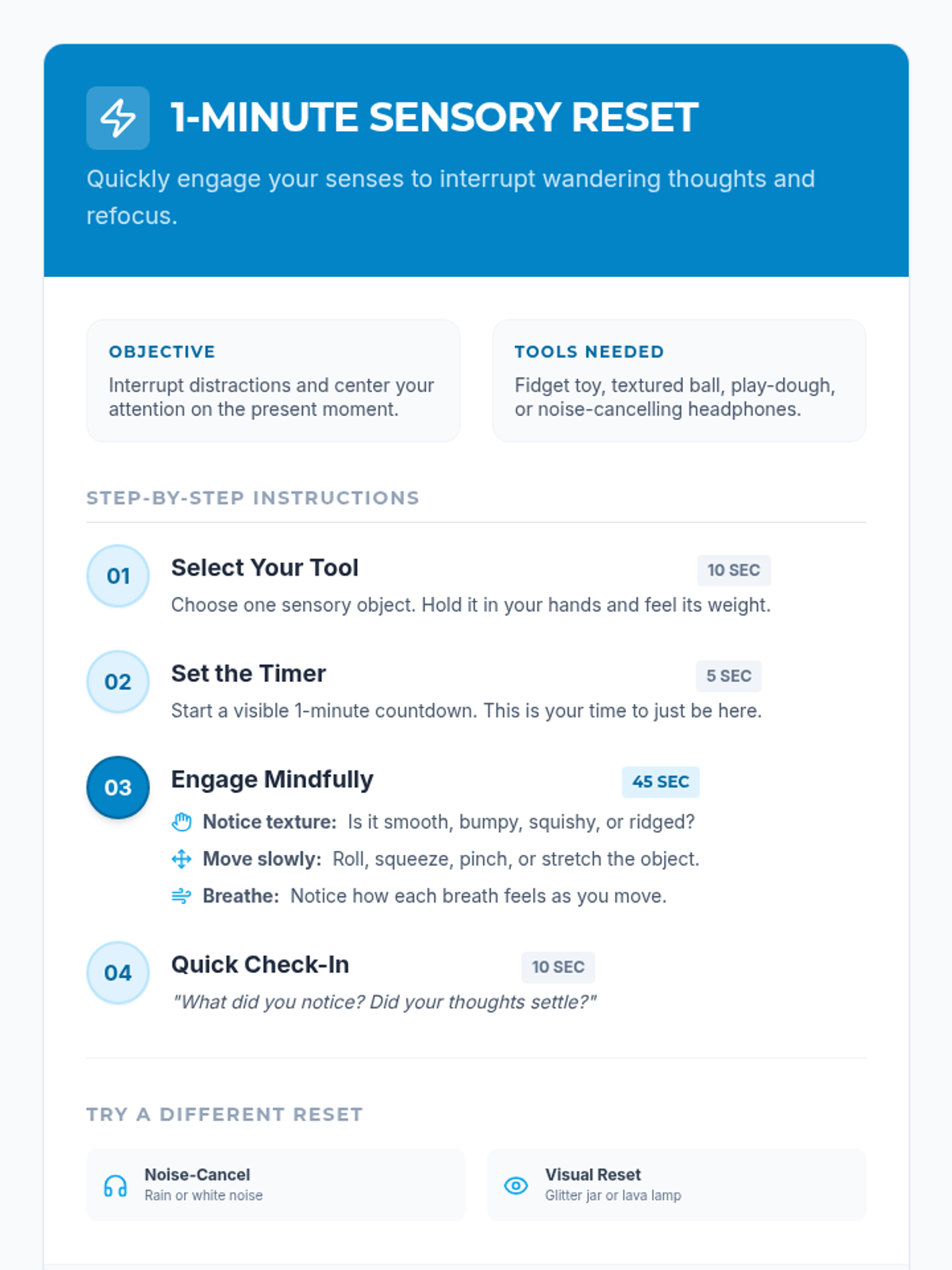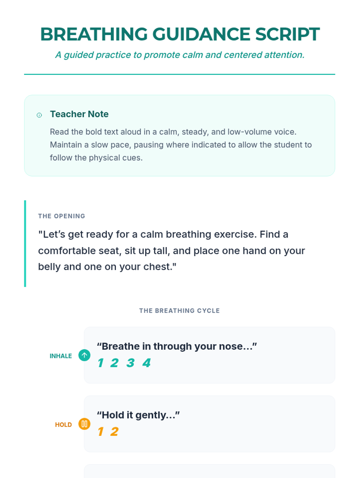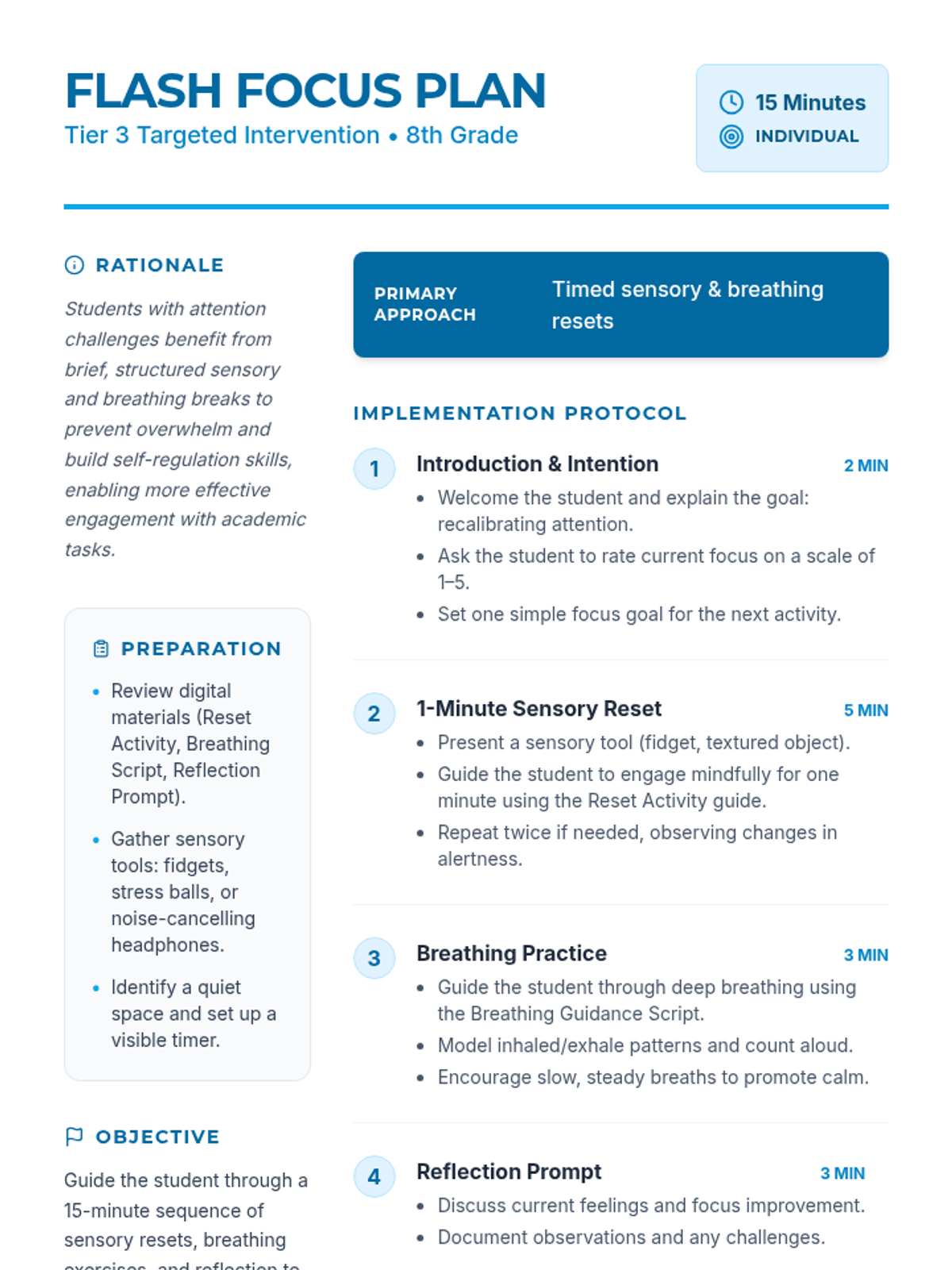 A 15-minute Tier 3 intervention for 8th-grade students, focusing on sensory resets and breathing techniques to recalibrate attention and improve self-regulation.