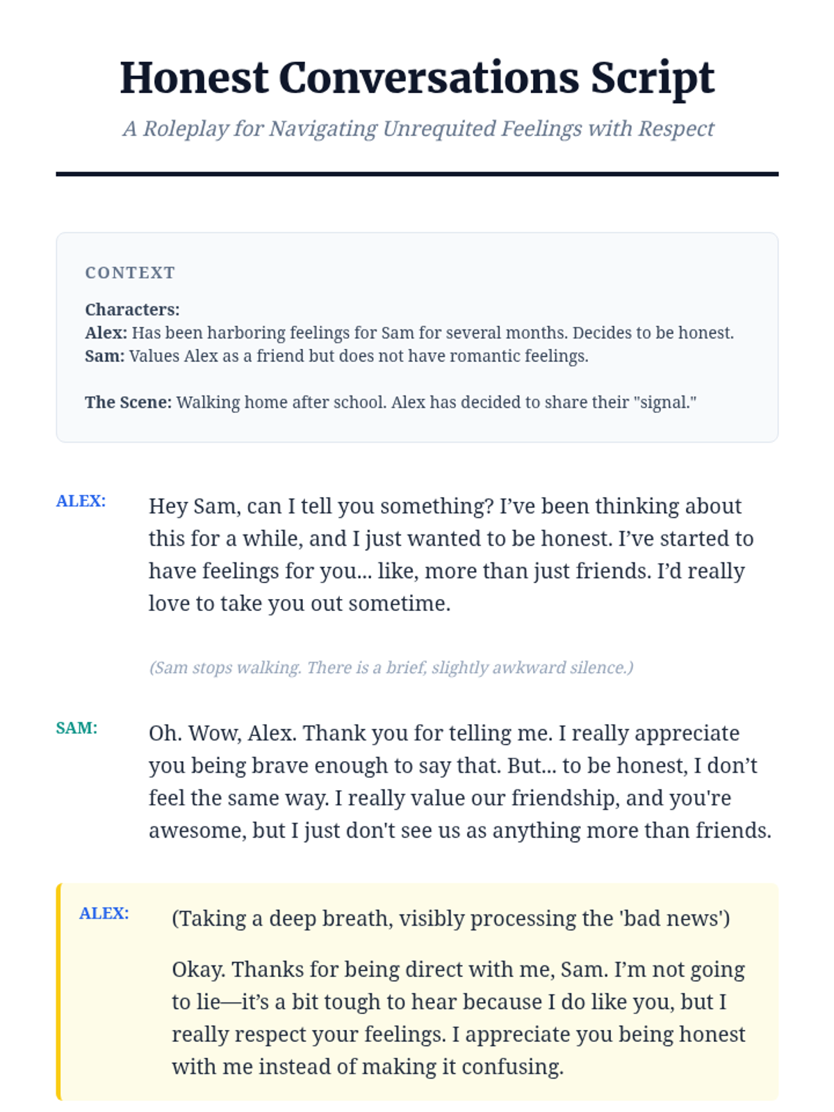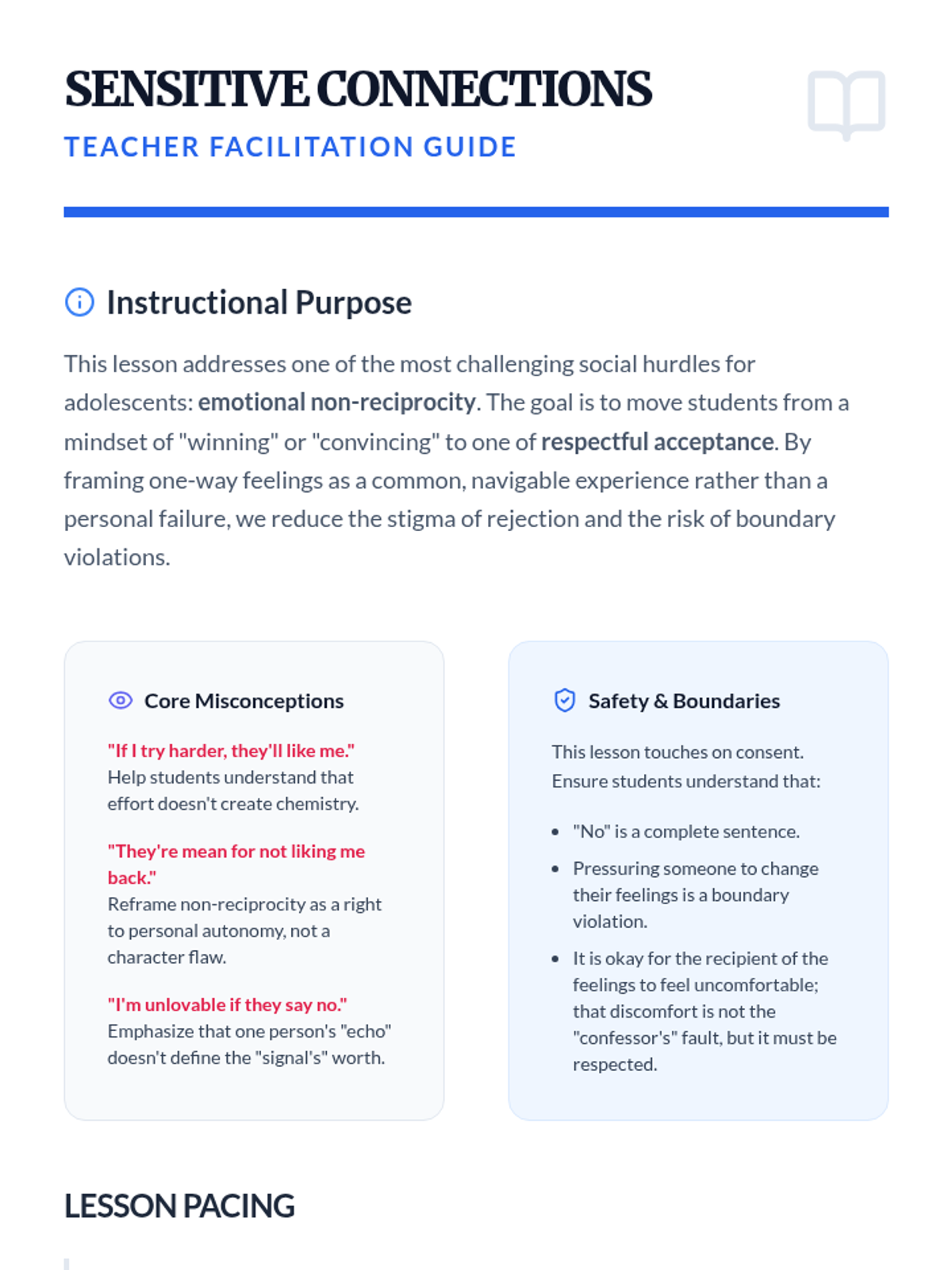 A lesson focused on navigating unrequited feelings, respecting emotional boundaries, and developing resilience when others do not mirror our emotions. Students explore the concept of reciprocity and practice coping strategies for handling social and romantic disappointment.