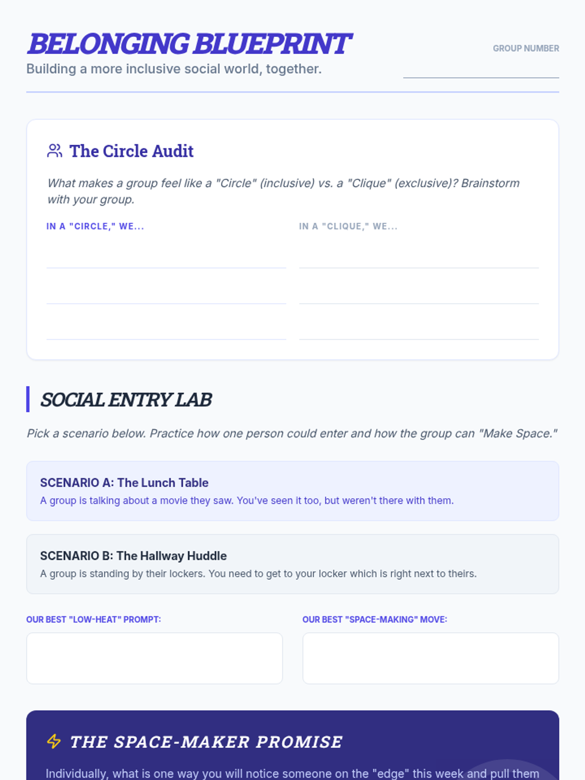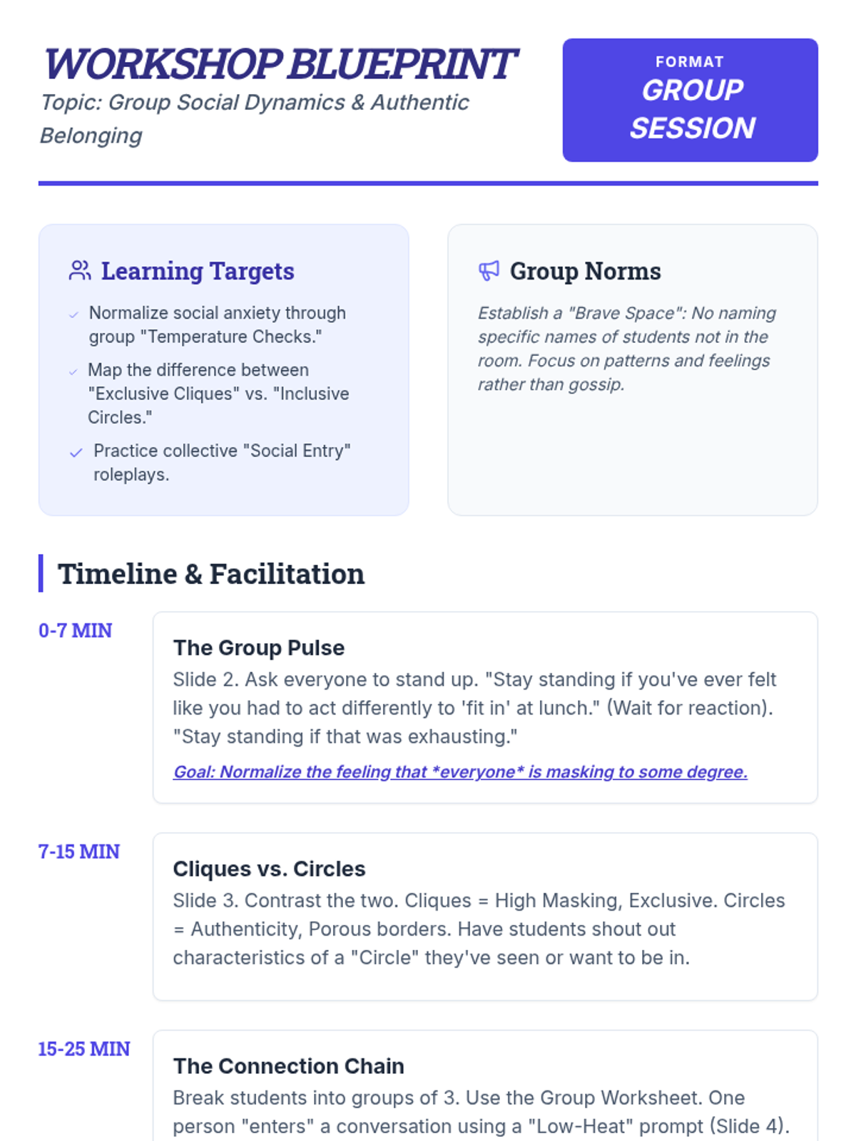 A 30-minute group workshop designed to help 9th graders navigate social belonging, identify authentic connections, and practice low-stakes social entry through peer support.