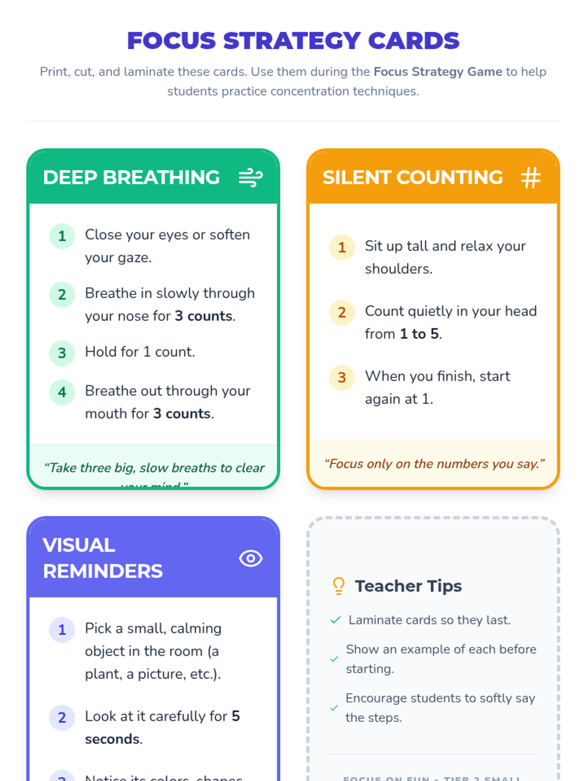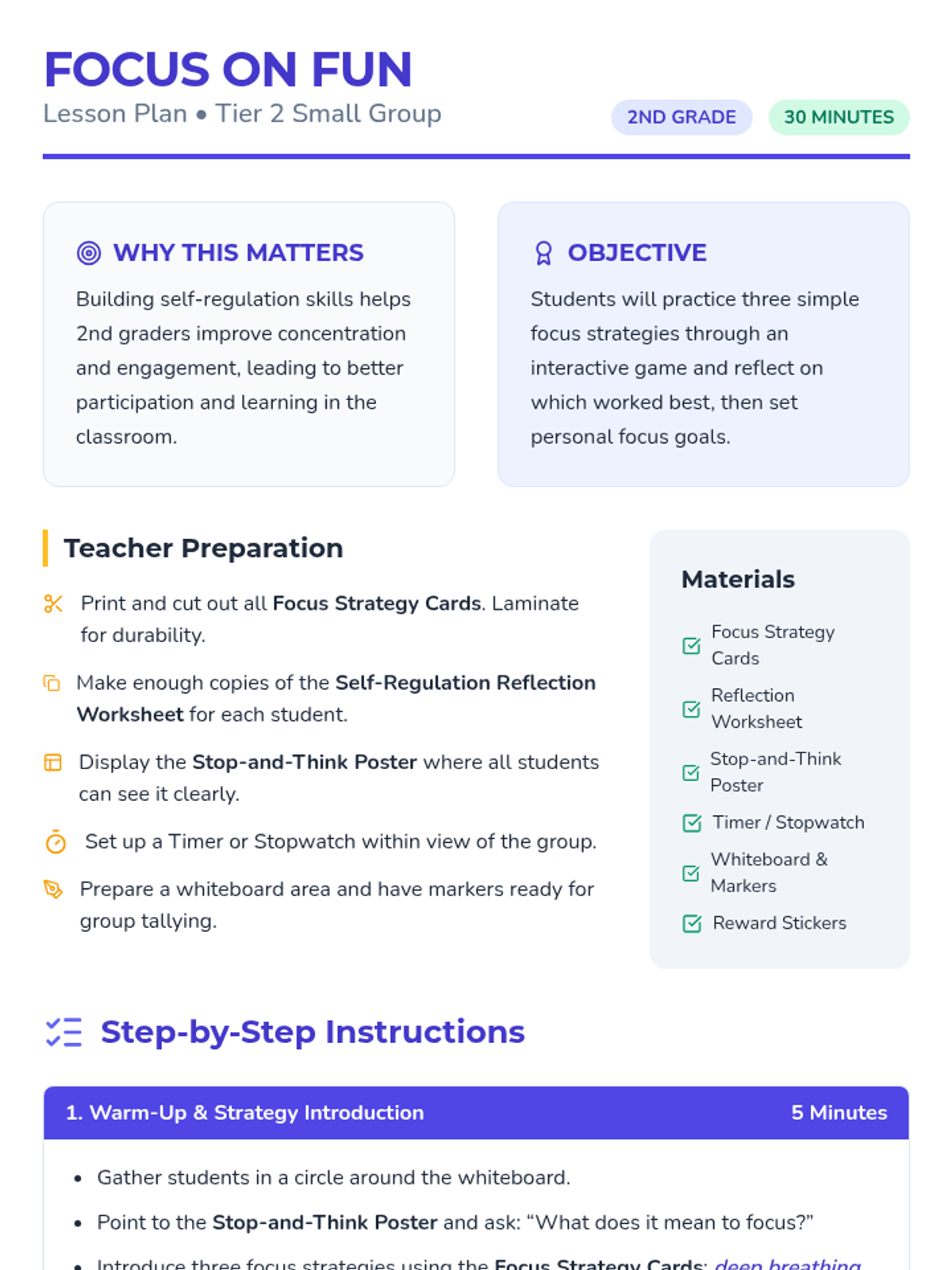 In this 30-minute Tier 2 small-group lesson, 2nd graders learn practical strategies to boost engagement and focus through interactive challenges and games. Students practice self-regulation skills, discover focus techniques, and reflect on their progress.