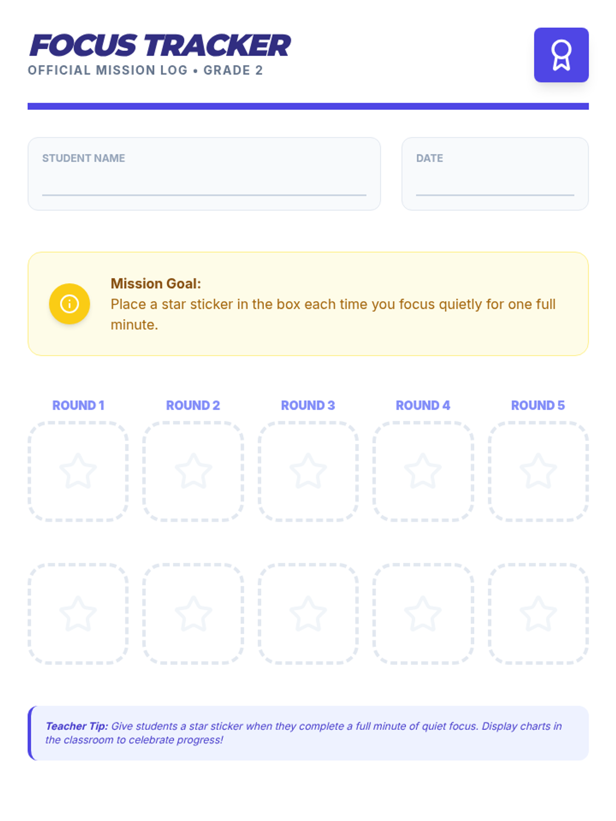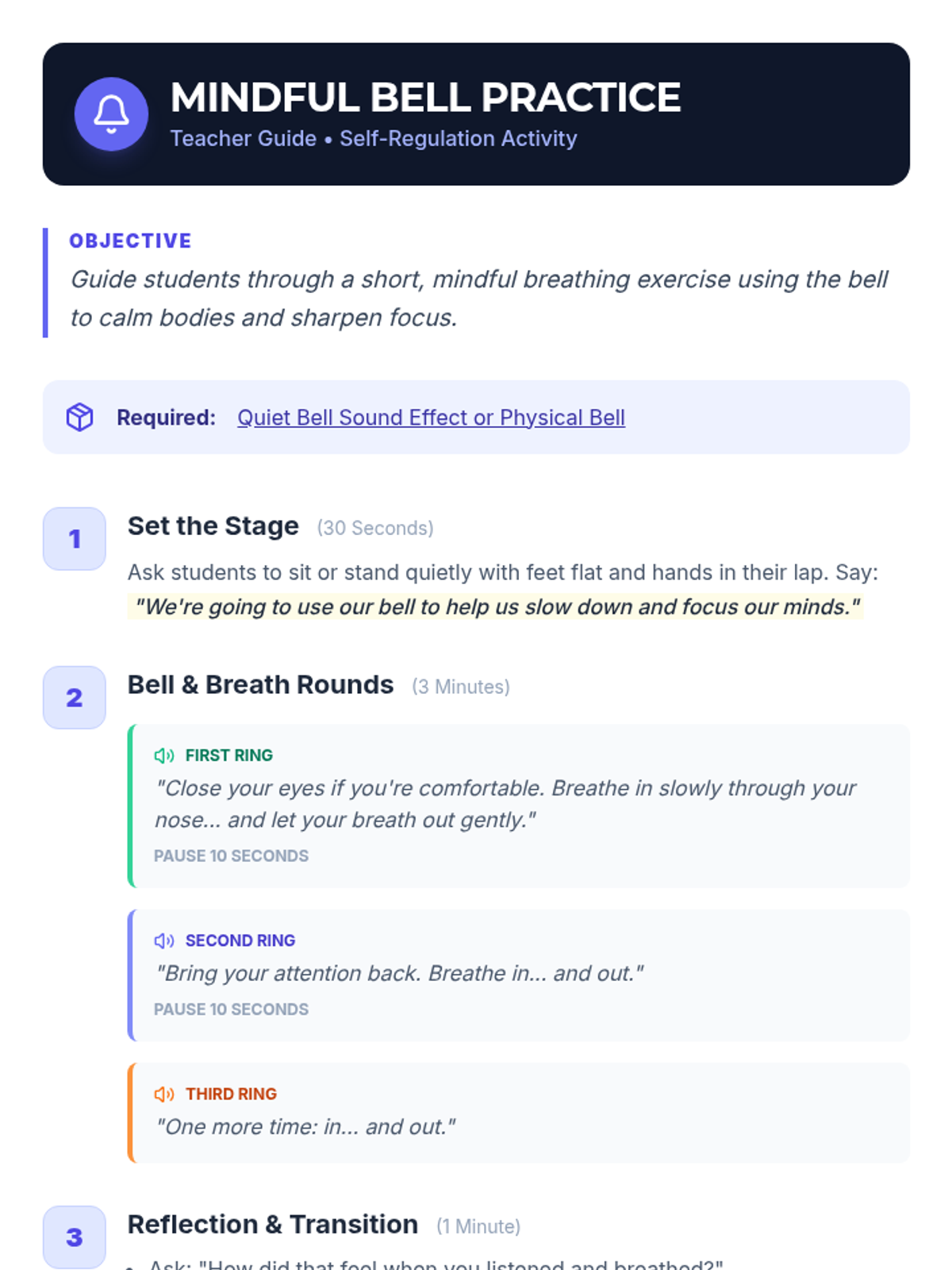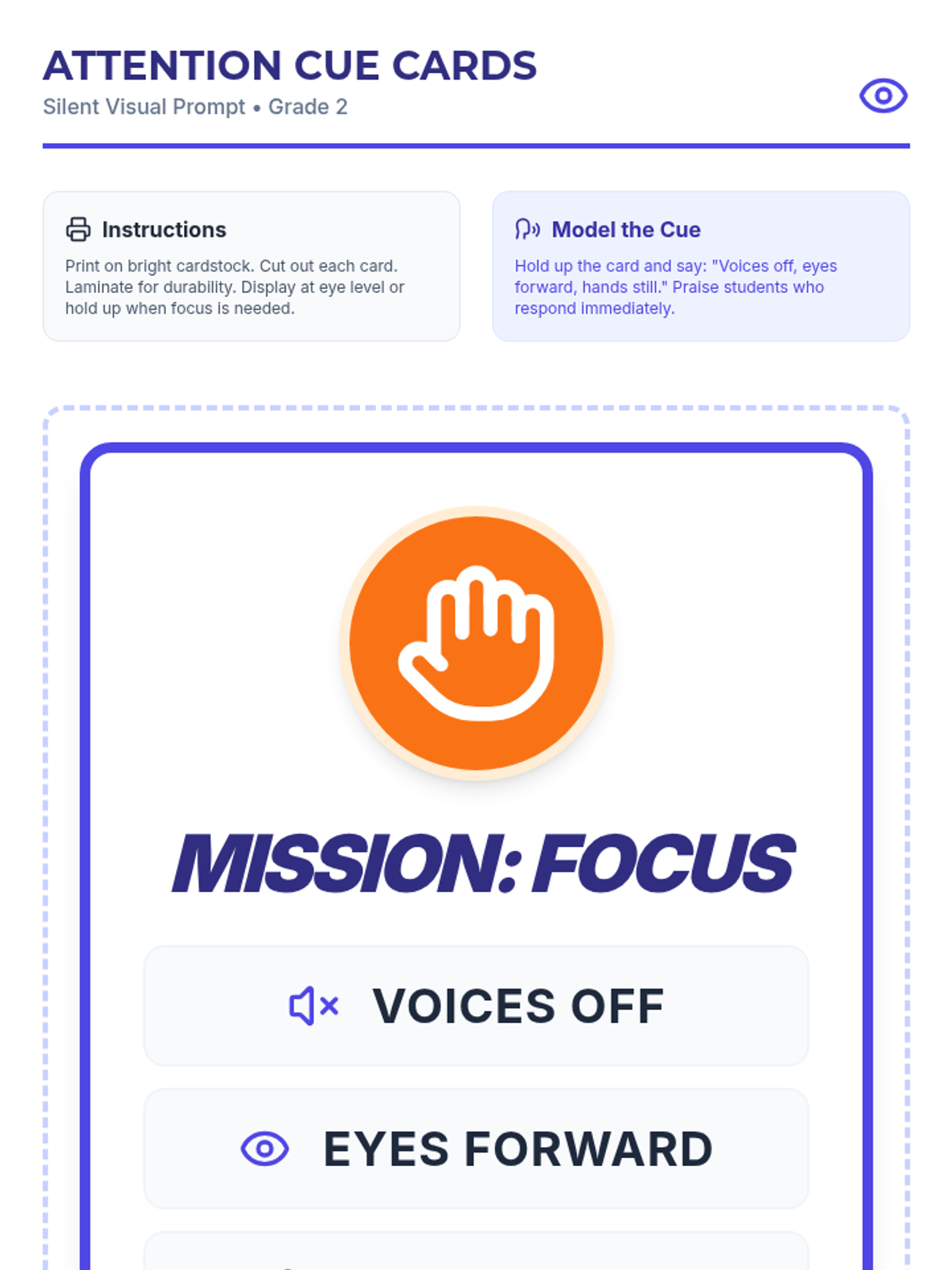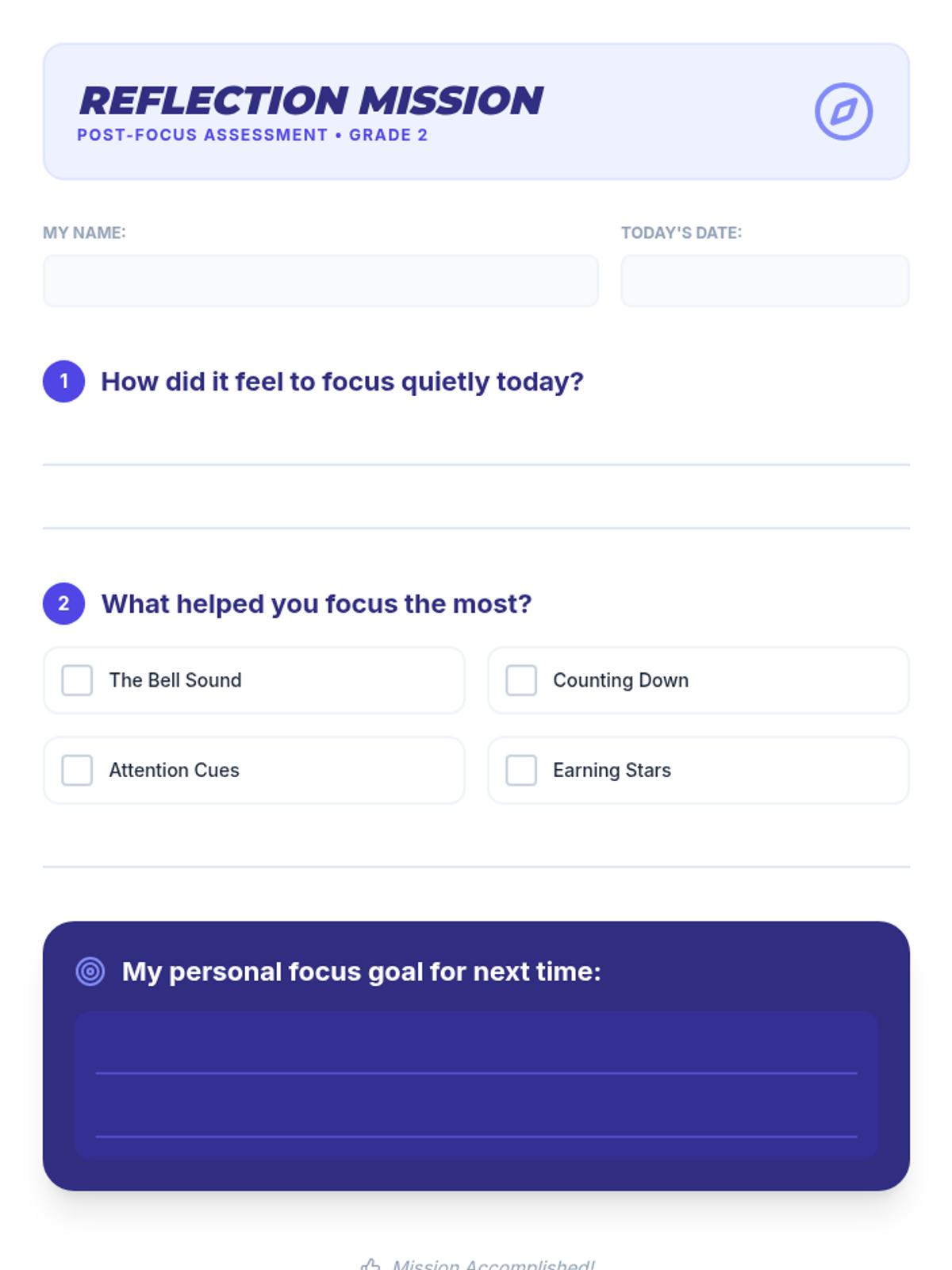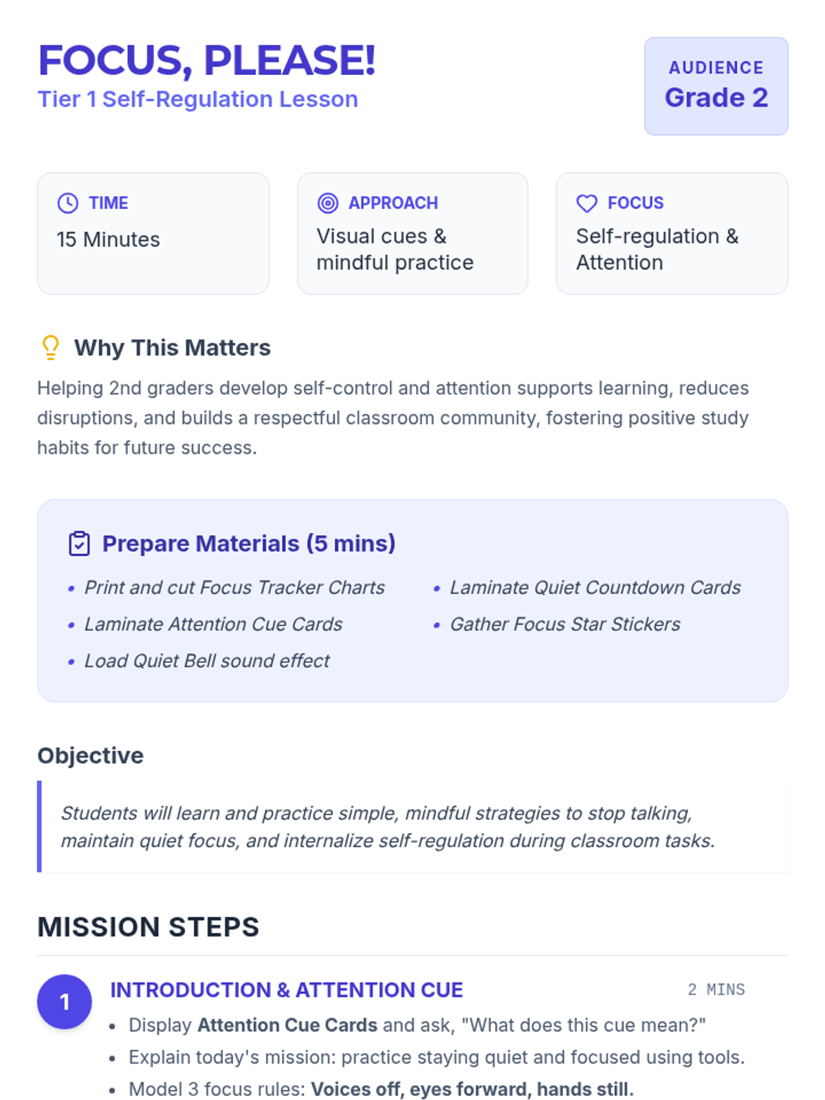 A 15-minute Tier 1 lesson for 2nd graders to learn and practice simple self-regulation strategies for classroom focus and quiet transitions.