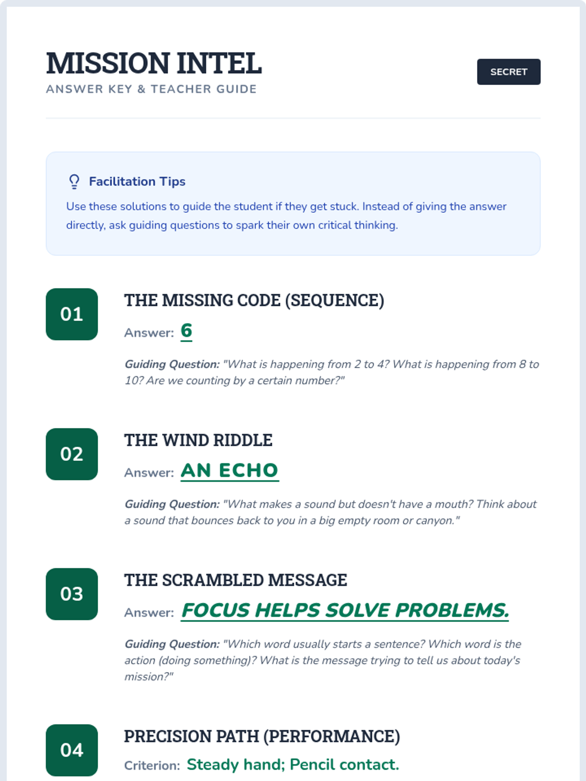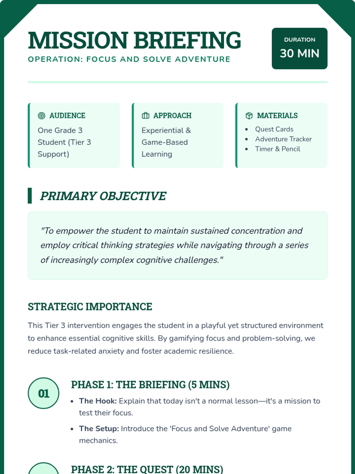 A targeted Tier 3 lesson for a third-grade student designed to boost concentration and critical thinking through a series of engaging, adventure-themed challenges.