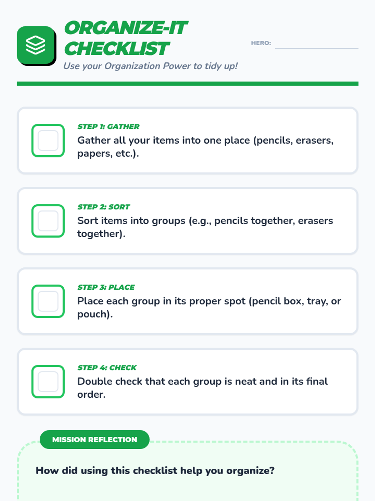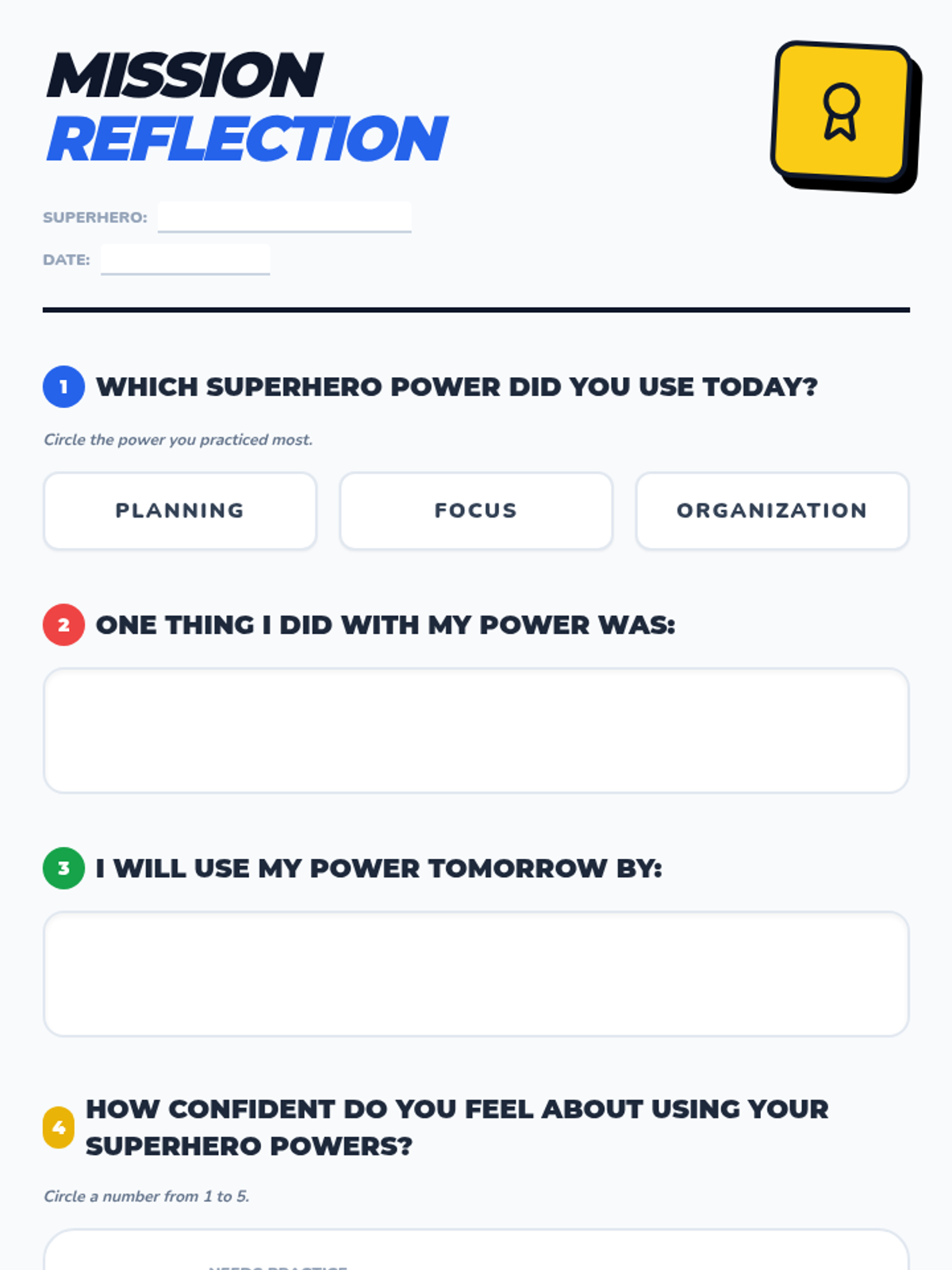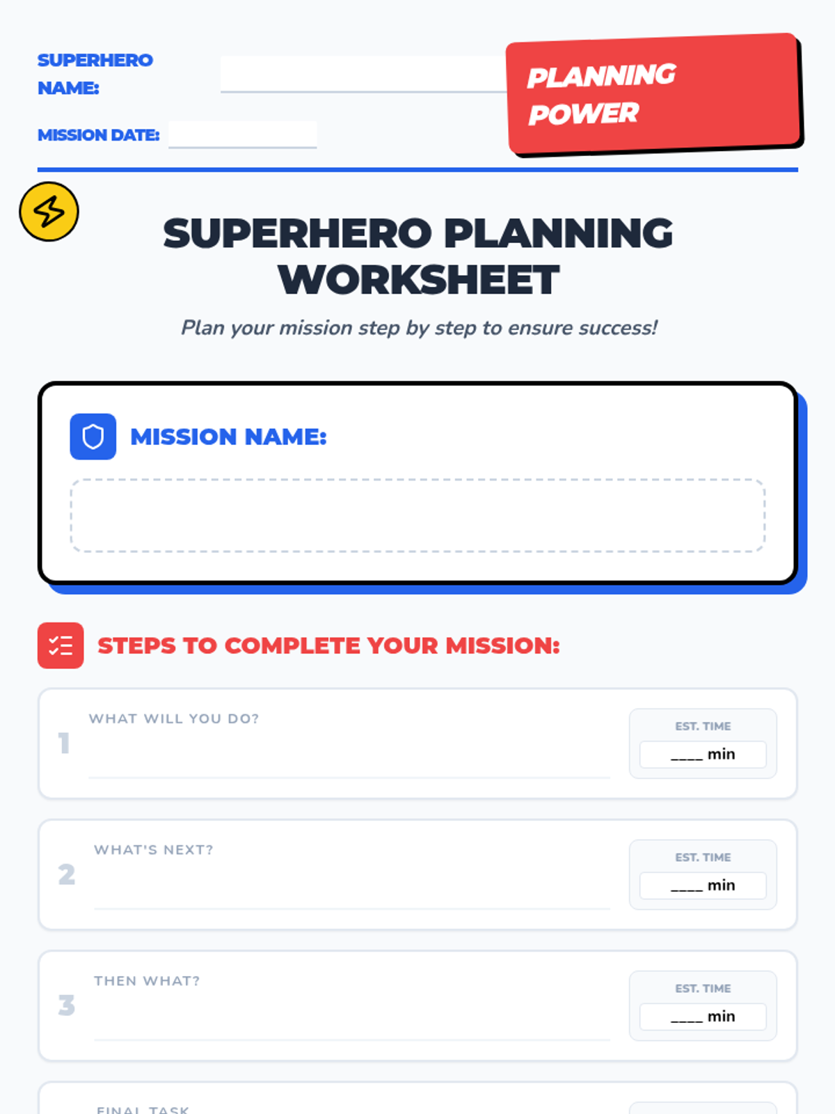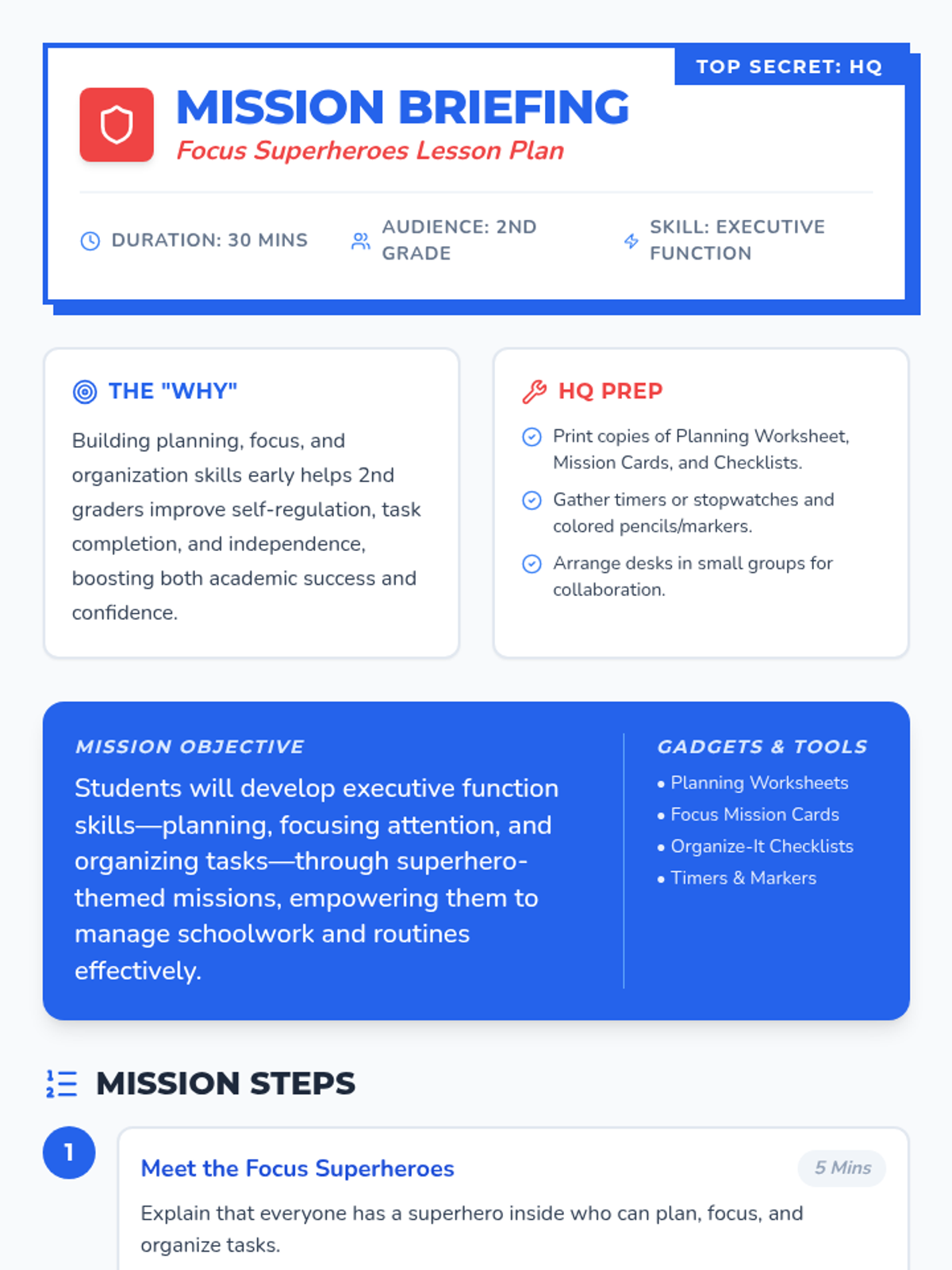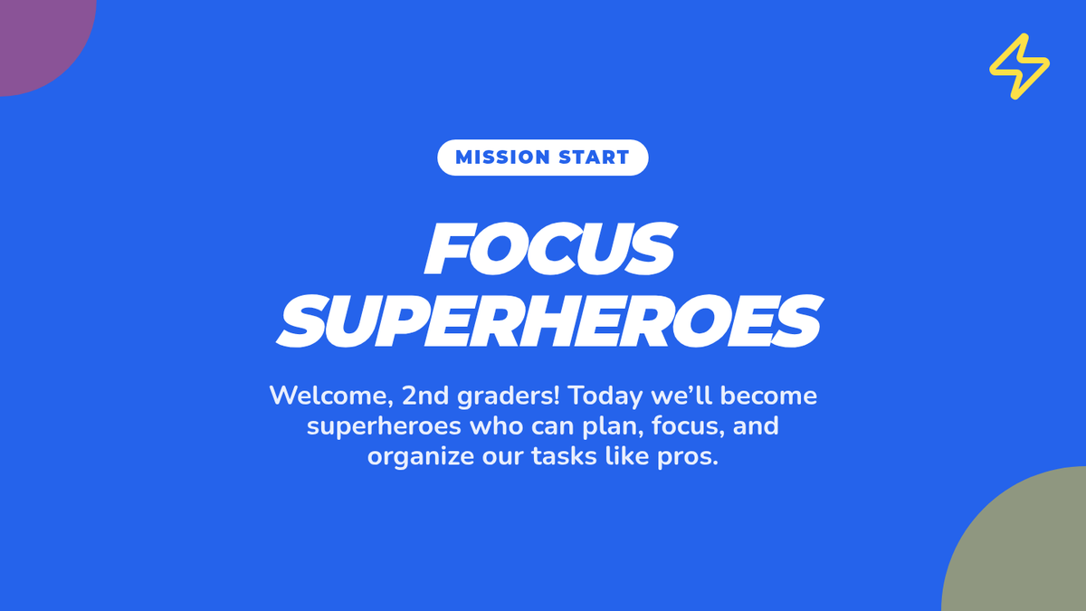In this 30-minute lesson, 2nd grade students will learn key executive function skills—planning, focusing attention, and organizing tasks—through fun superhero-themed activities.