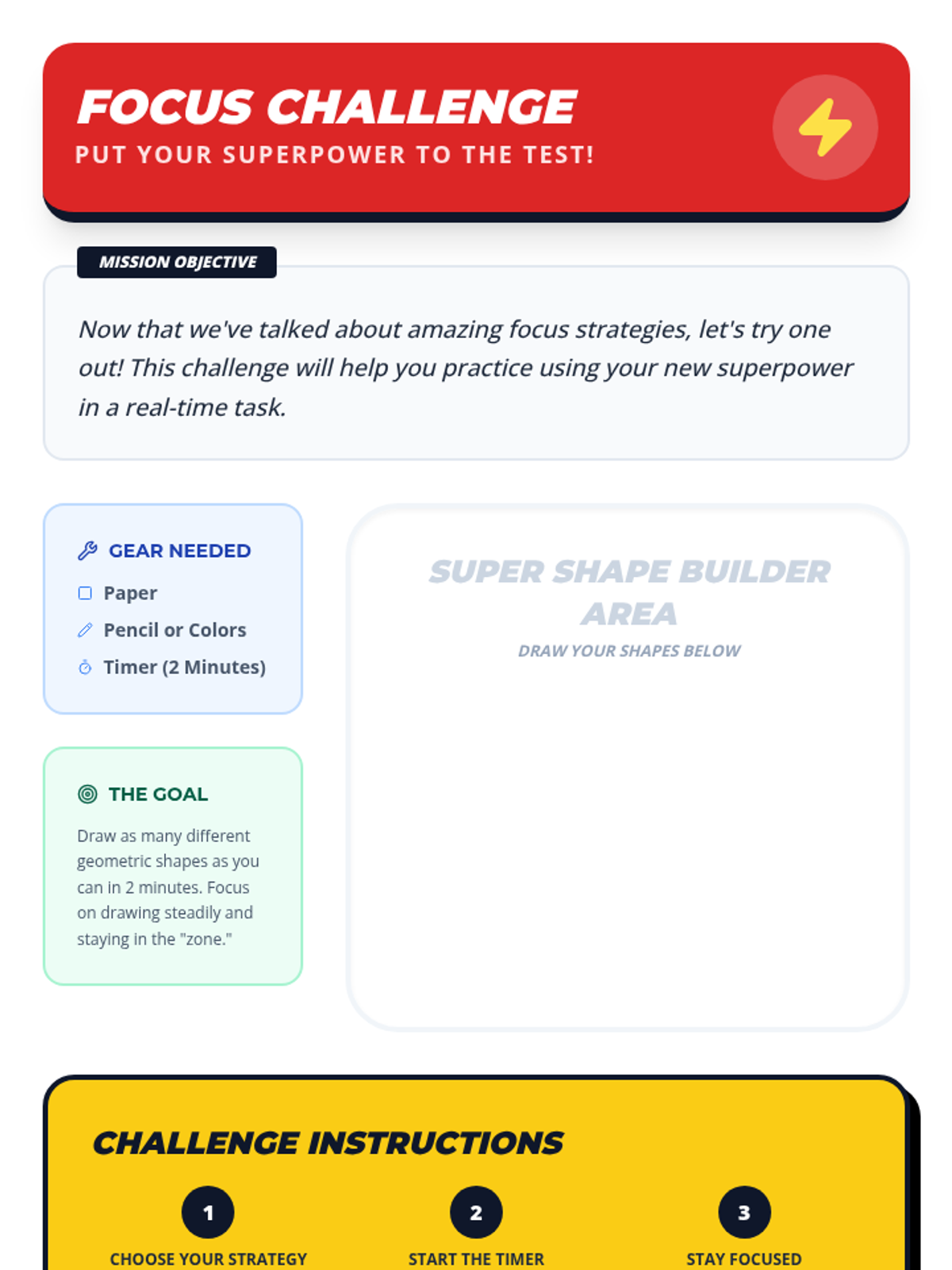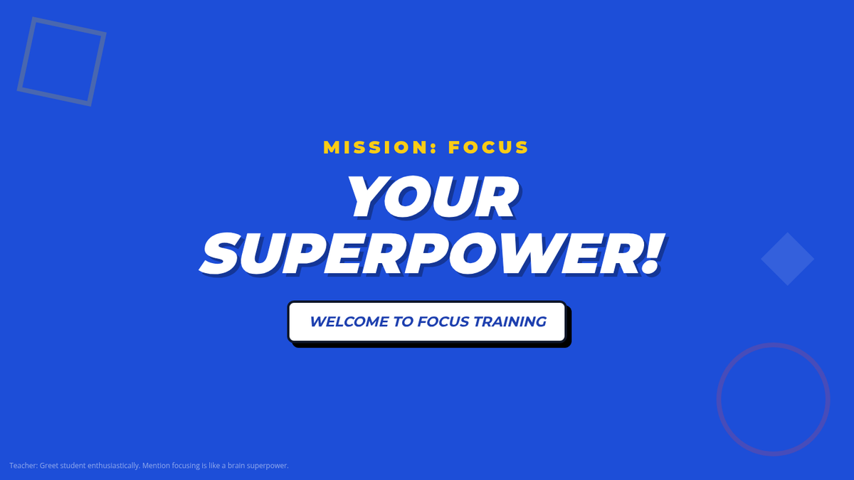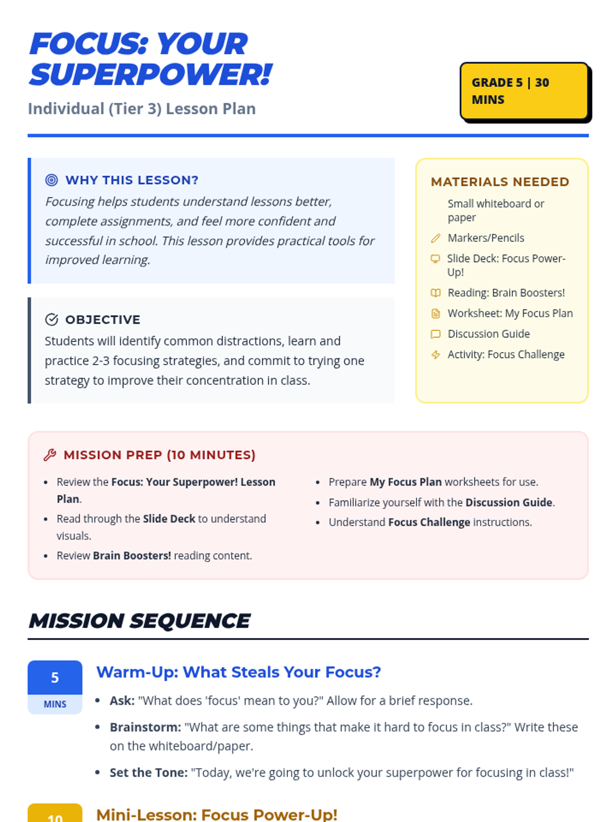 This individualized 30-minute lesson empowers 5th-grade students to master their focus through practical strategies like the Spotlight Focus and Brain Breaks, framed within an engaging superhero theme.