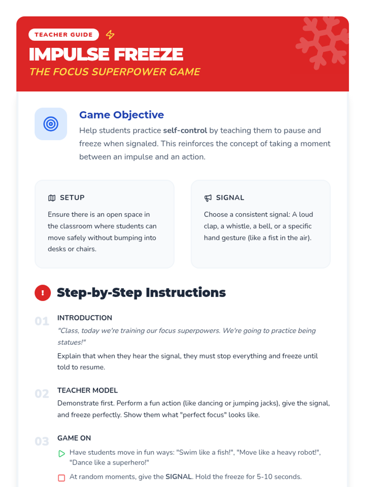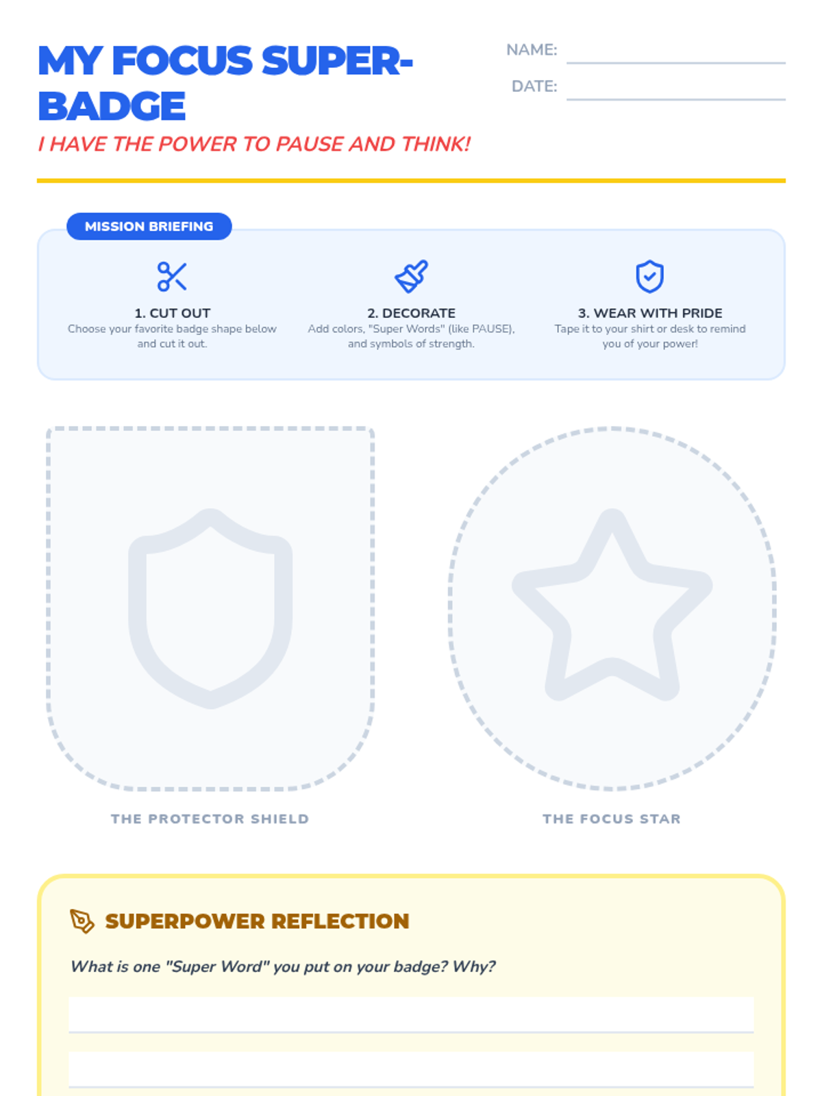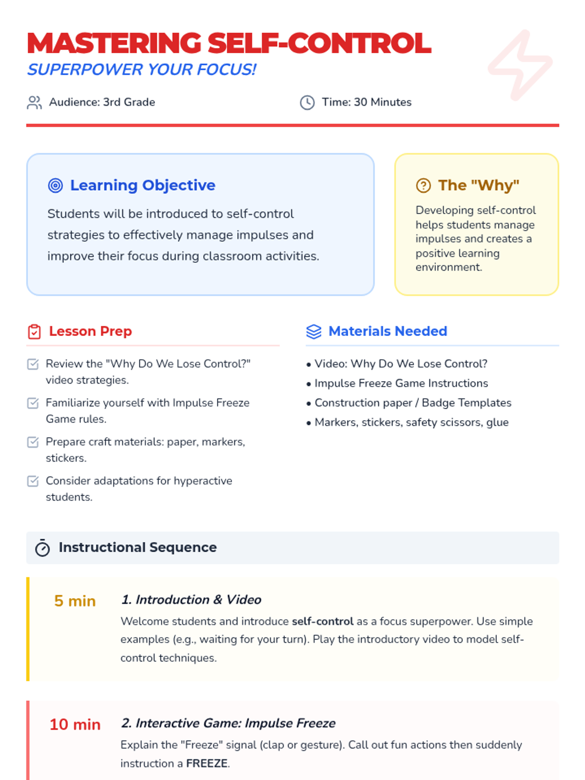A high-energy lesson for 3rd graders focused on developing self-control through superhero-themed activities, games, and crafts. Students learn to 'freeze' their impulses and create personal badges to remind them of their inner focus superpower.