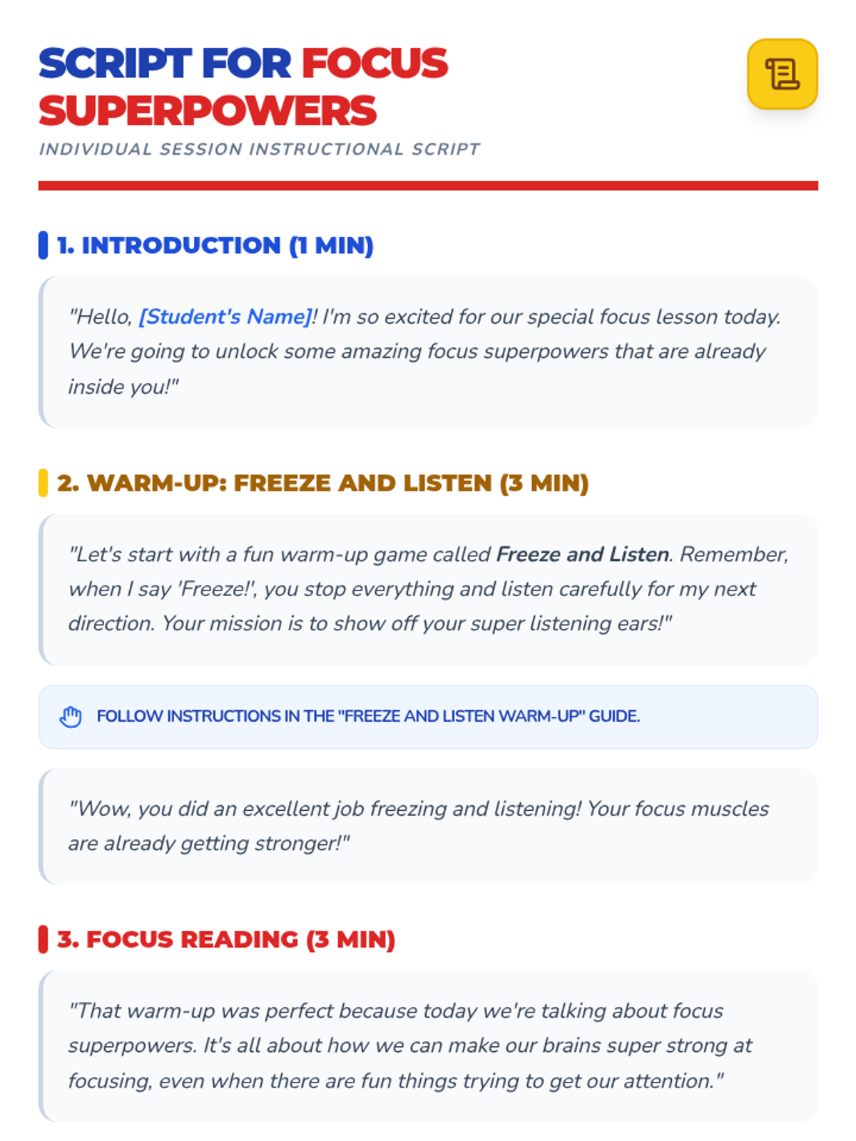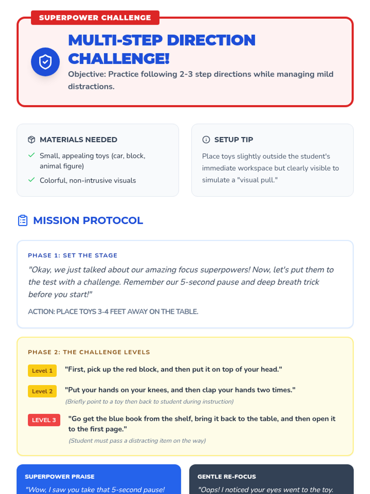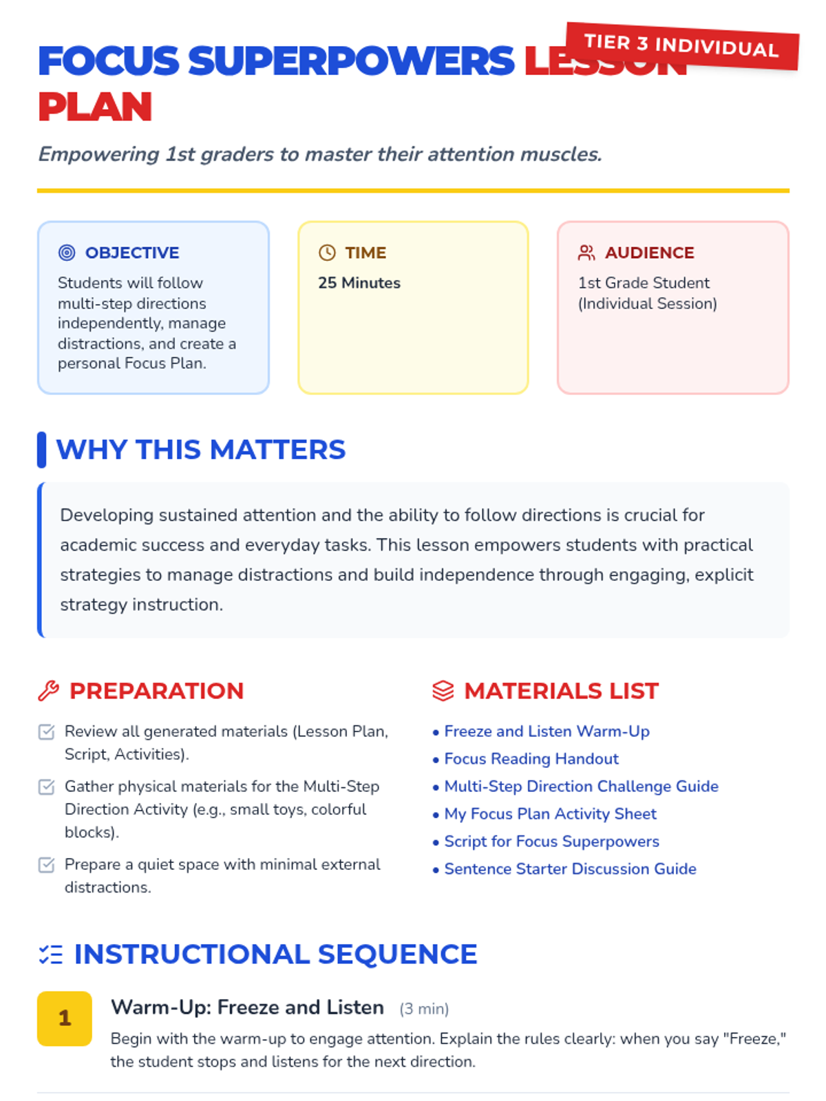 A 25-minute Tier 3 (Individual) lesson for 1st graders to develop sustained attention and direction-following skills using superhero-themed strategies like the 5-second pause.