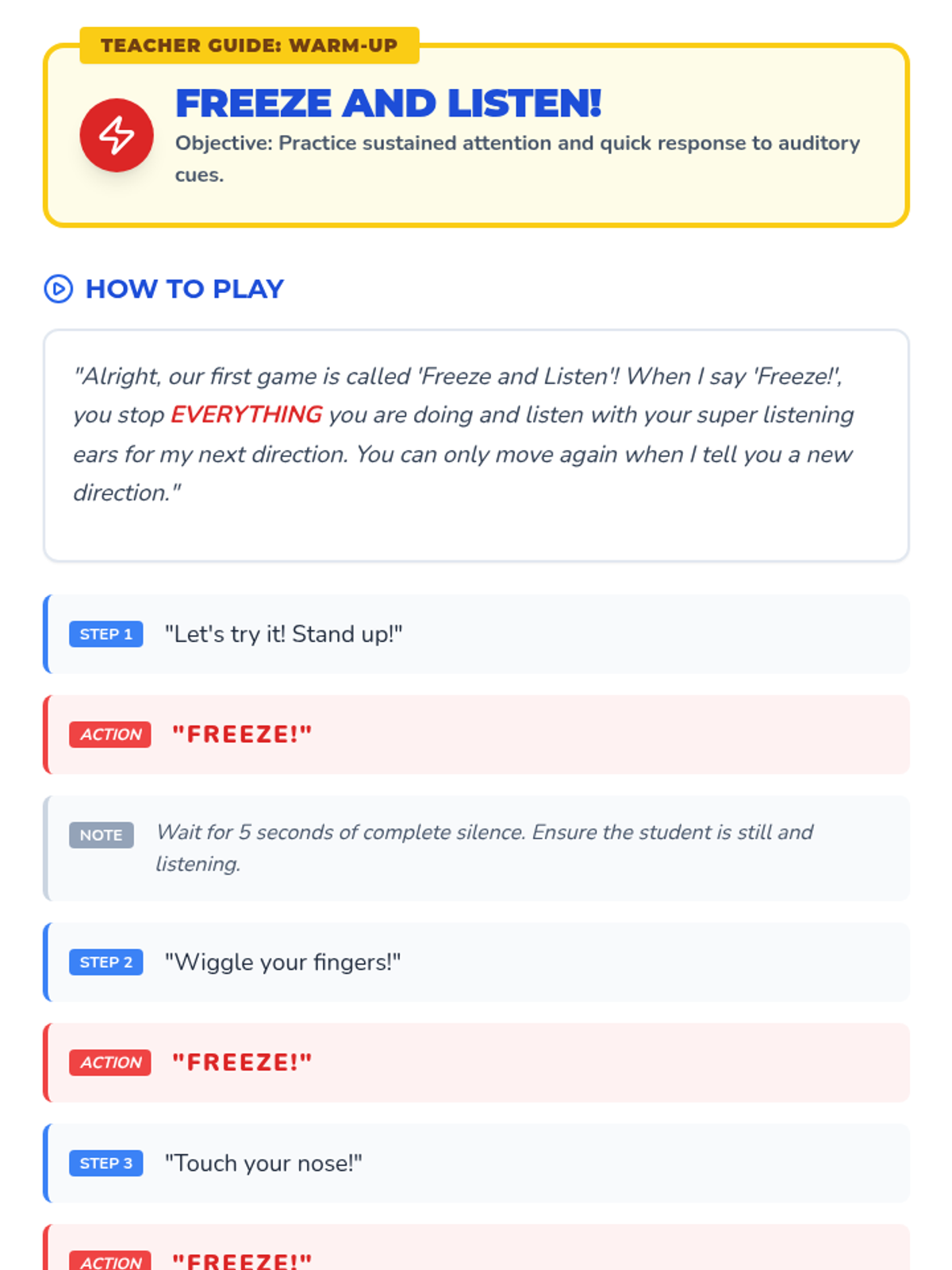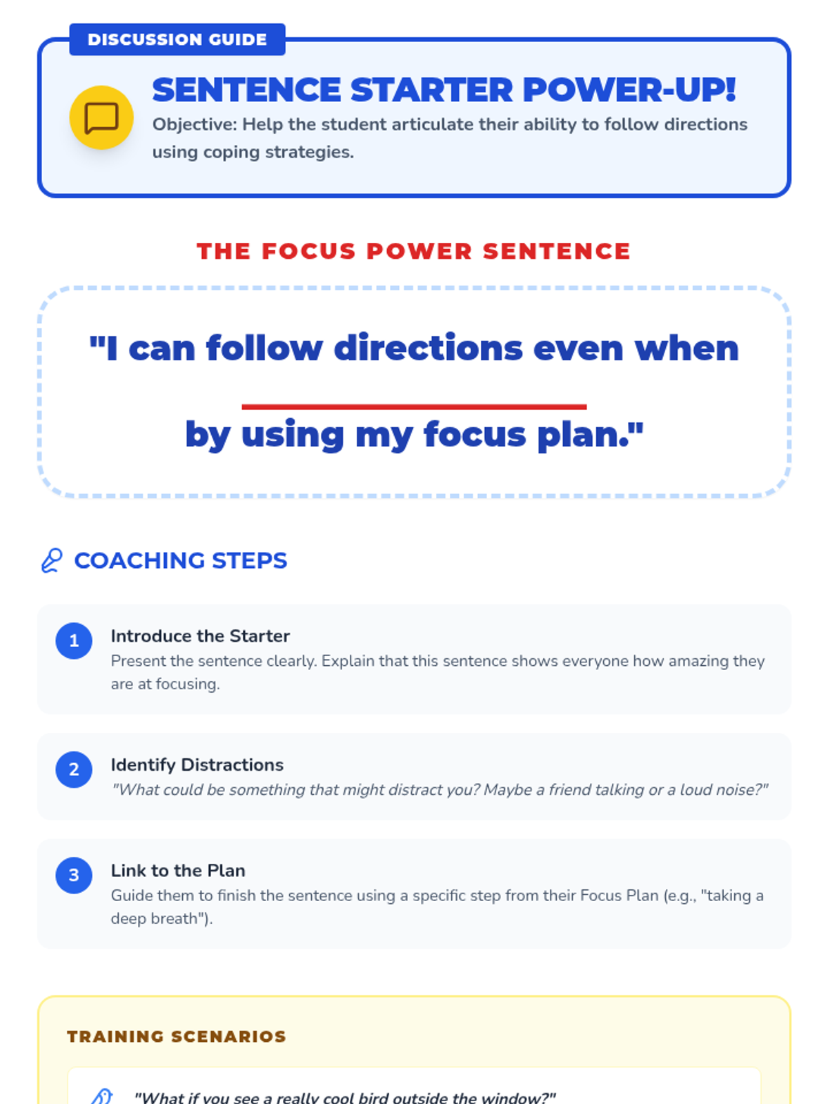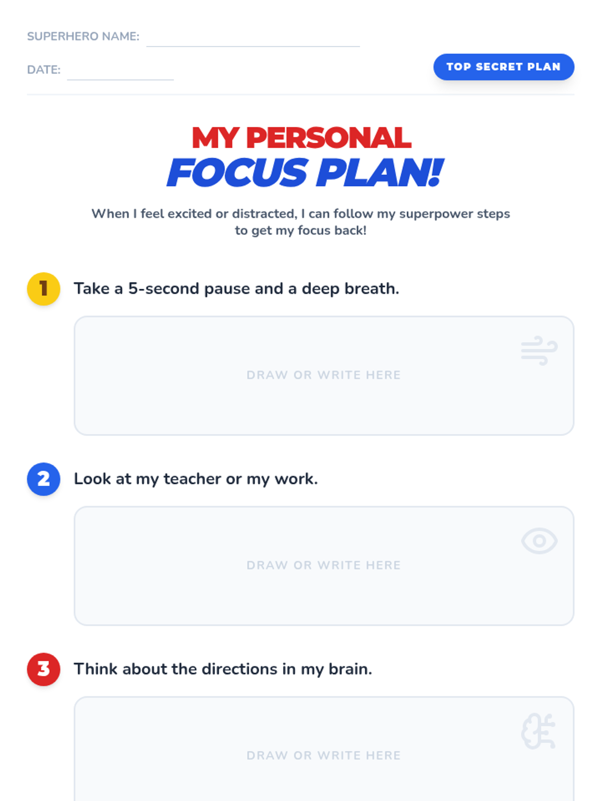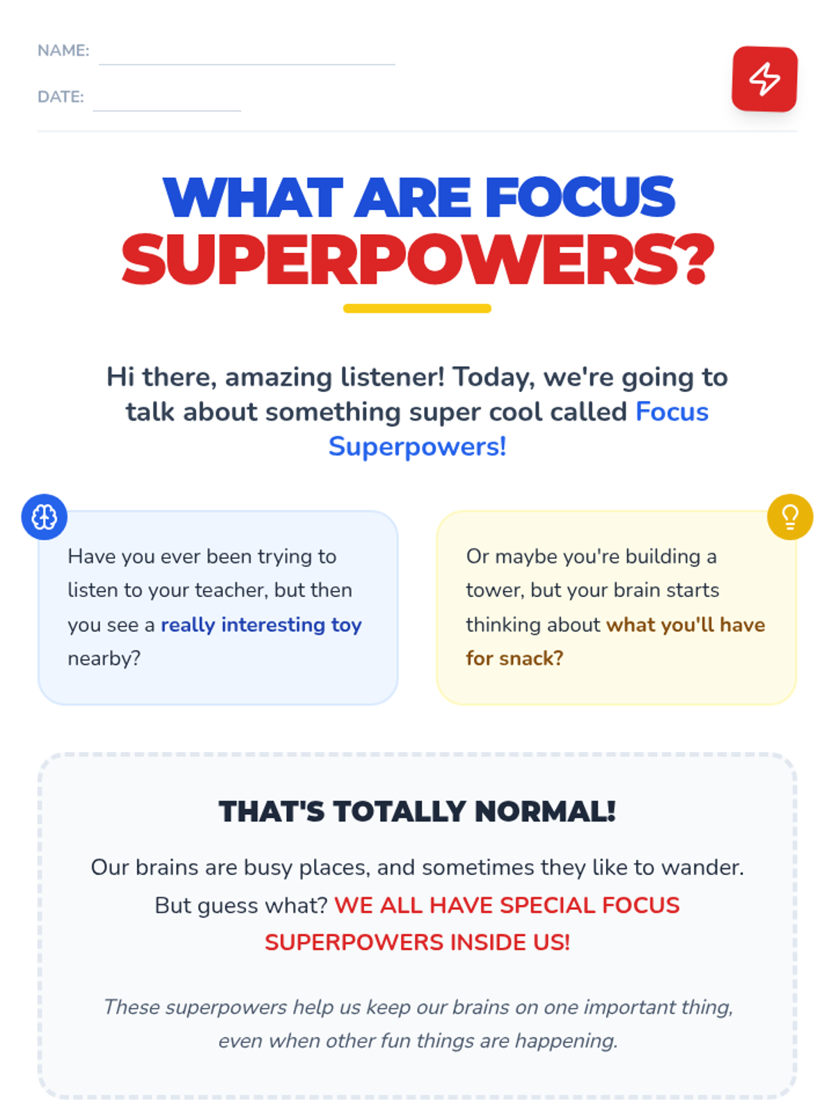A 25-minute Tier 3 (Individual) lesson for 1st graders to develop sustained attention and direction-following skills using superhero-themed strategies like the 5-second pause.