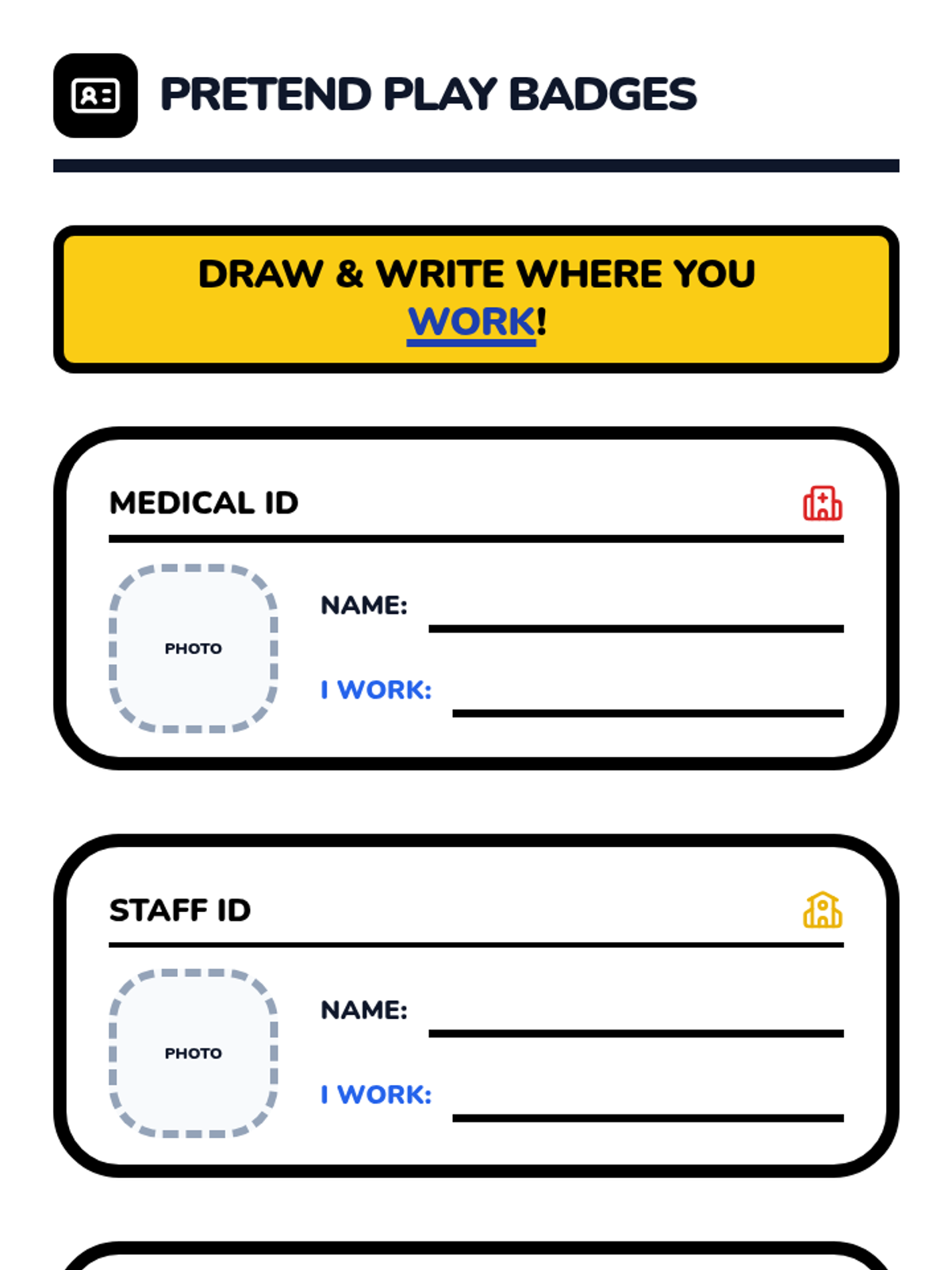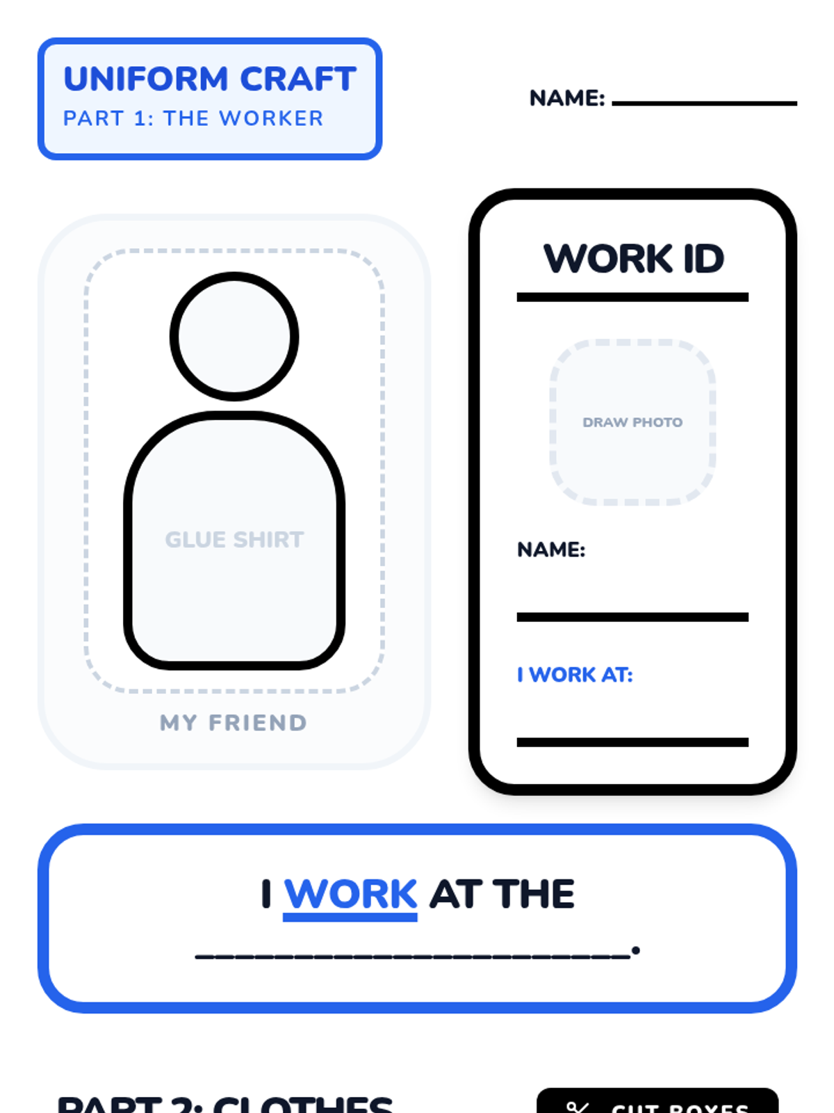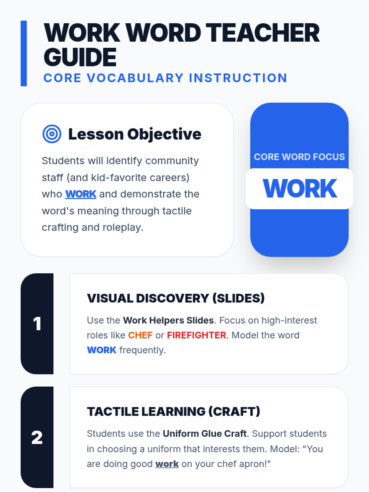 A hands-on lesson for special education and kindergarten students to explore the CORE word 'Work' through community helper crafts and pretend play badges.