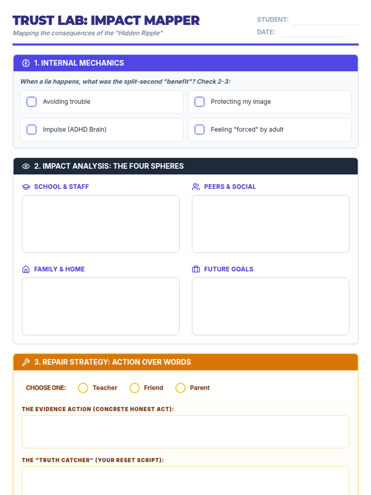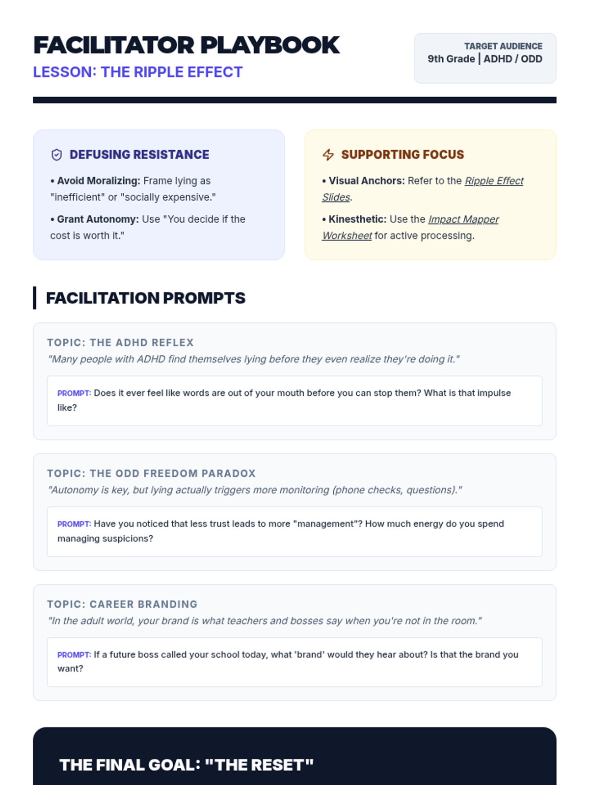 A targeted discussion-based lesson exploring the mechanics of honesty and the ripple effects of lying on key relationships. Designed specifically for students with ADHD/ODD, focusing on objective impact rather than moral judgment.