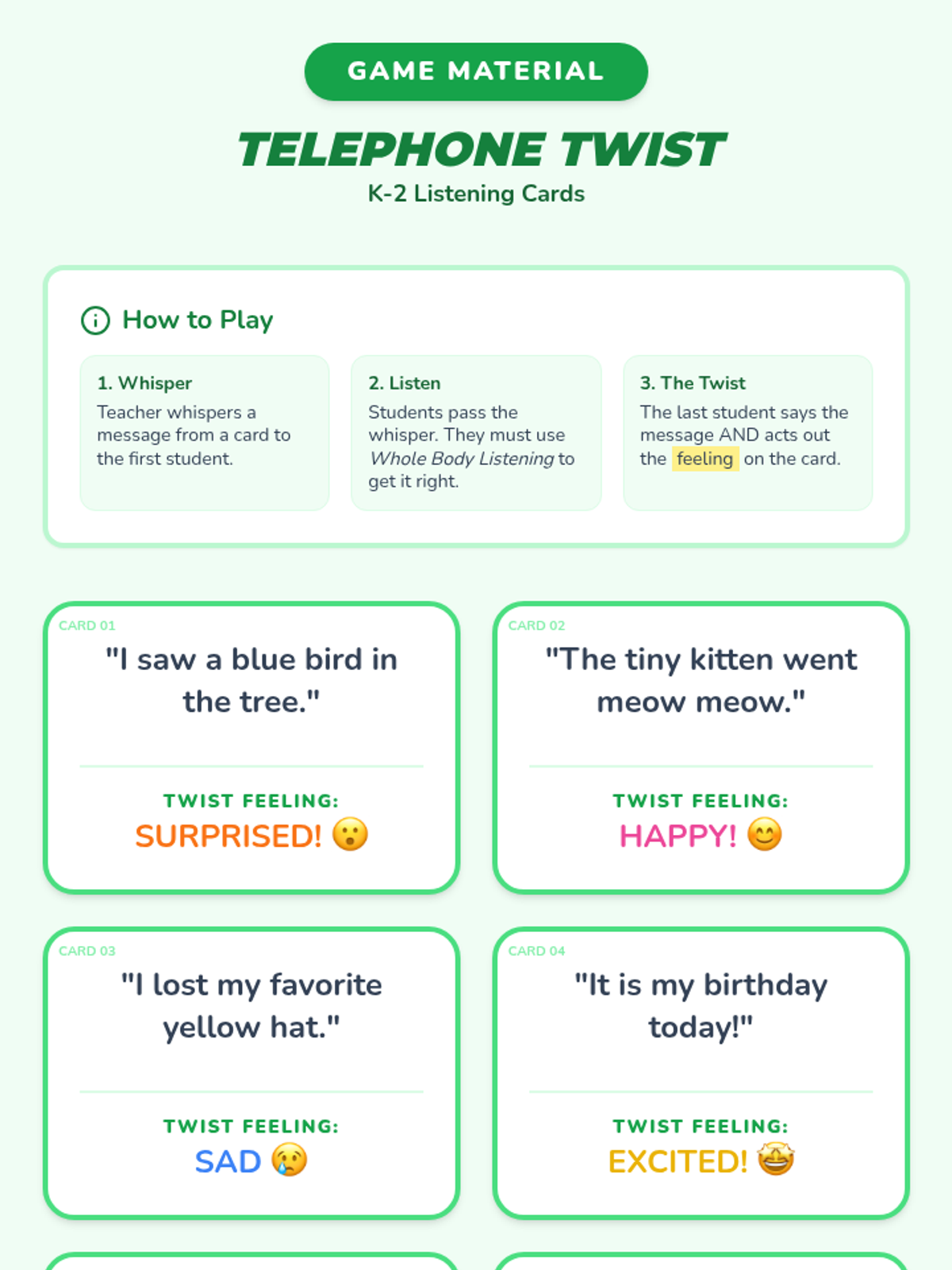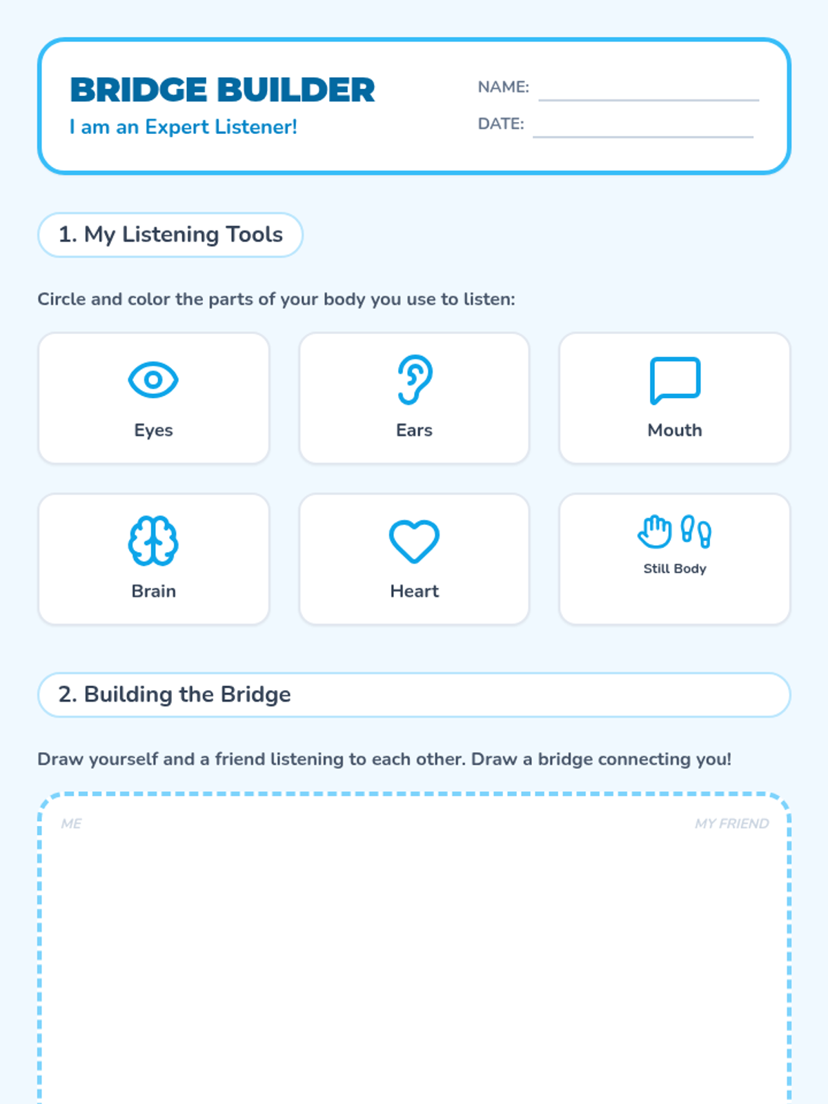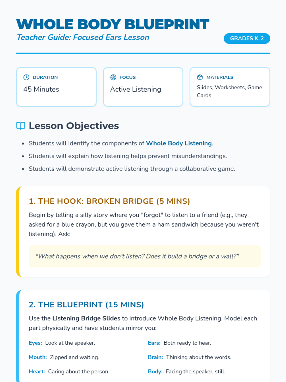 A playful lesson for K-2 students focused on active listening skills, featuring the 'Whole Body Listening' technique and collaborative activities to build friendship and understanding.