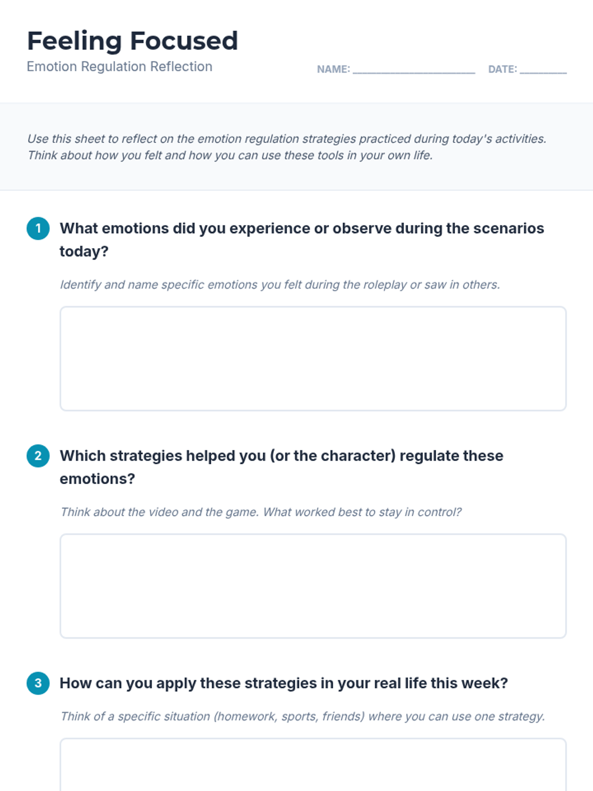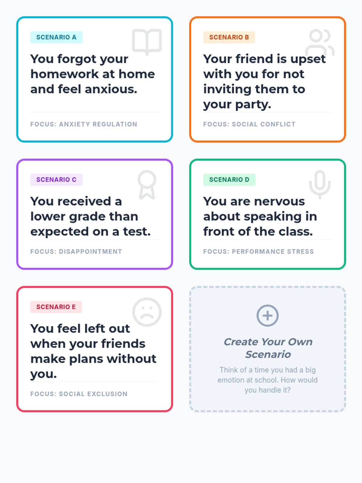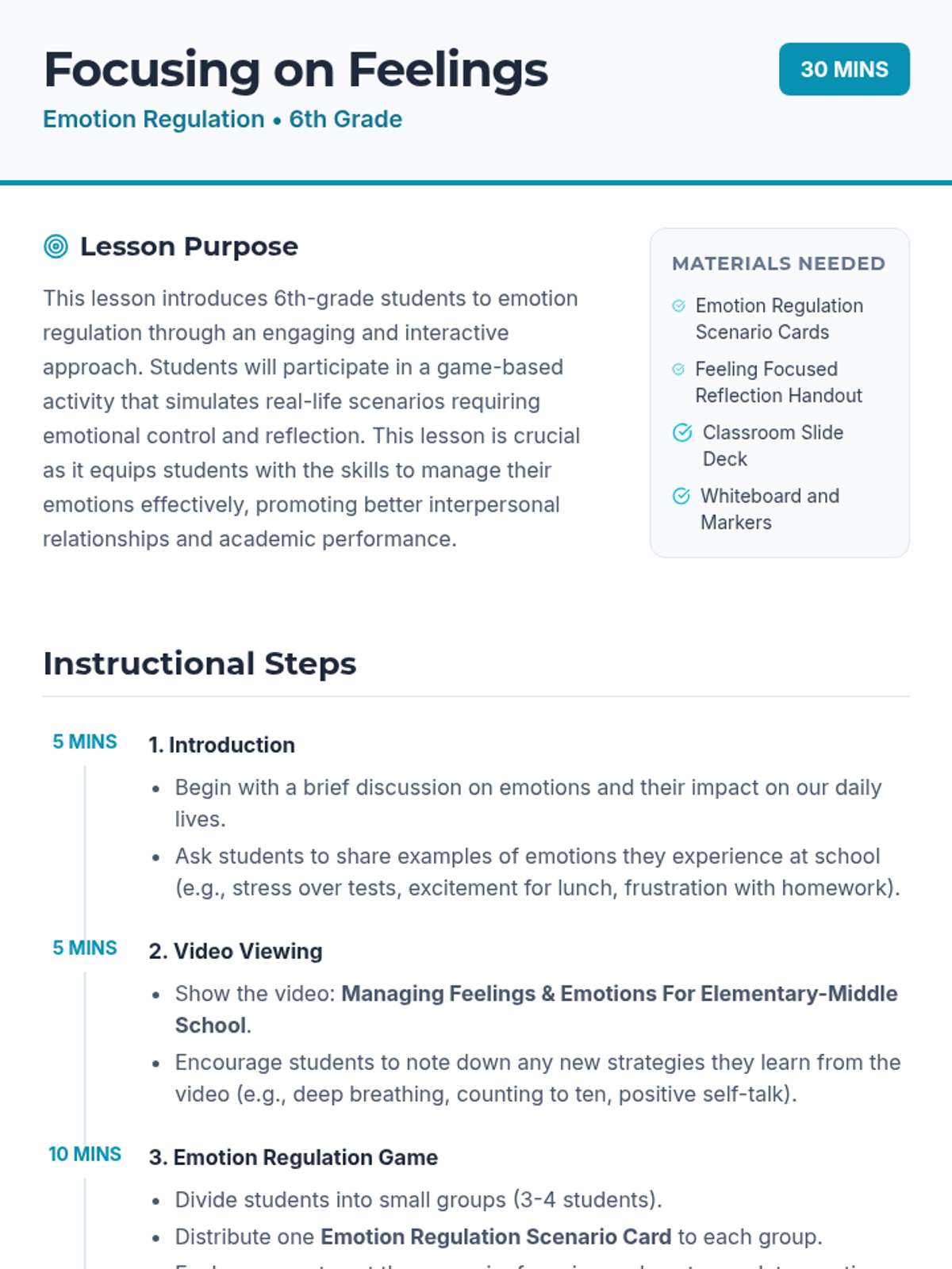 A 30-minute interactive lesson for 6th graders to learn and practice emotion regulation through a scenario-based game and reflective discussion.