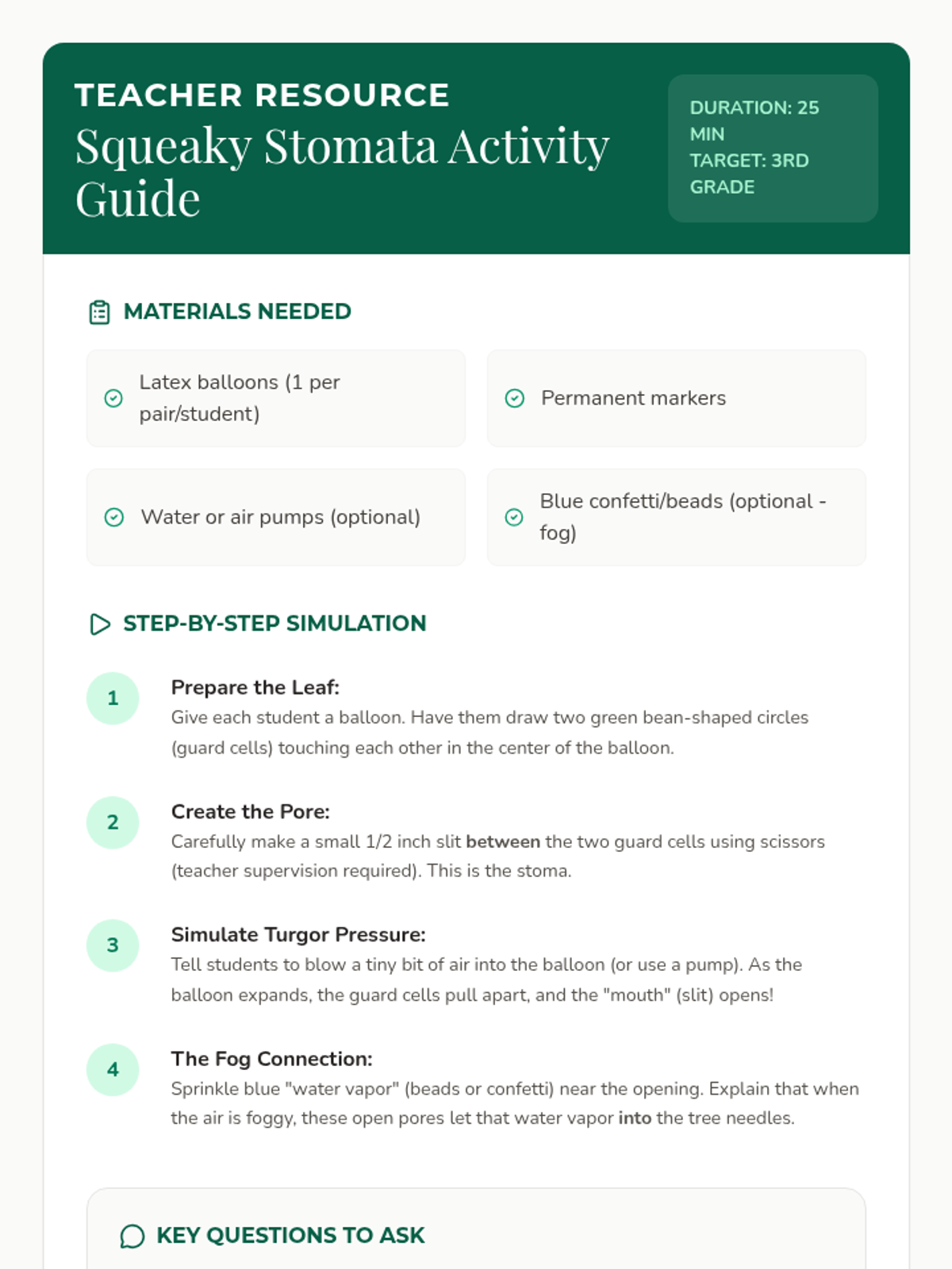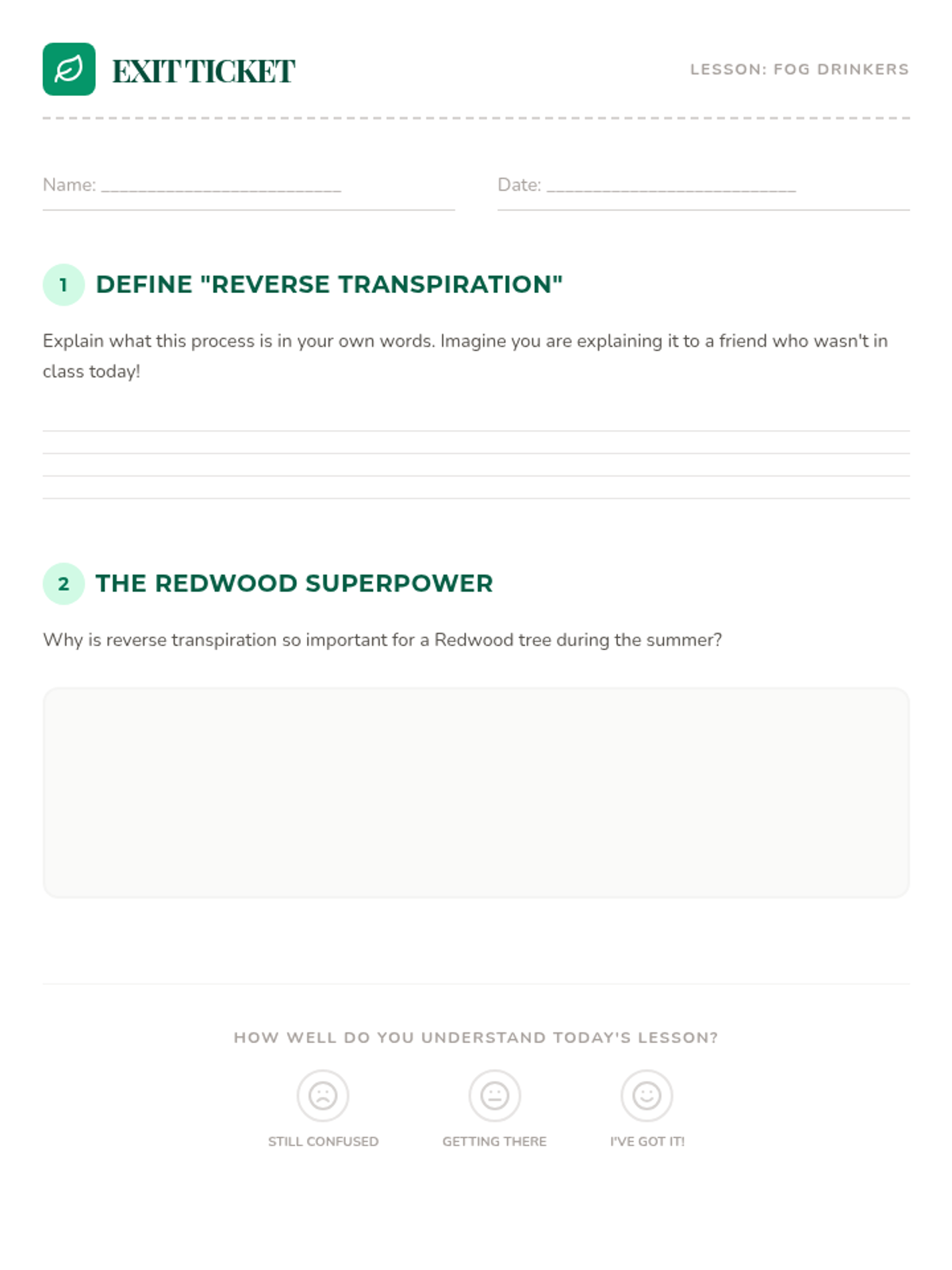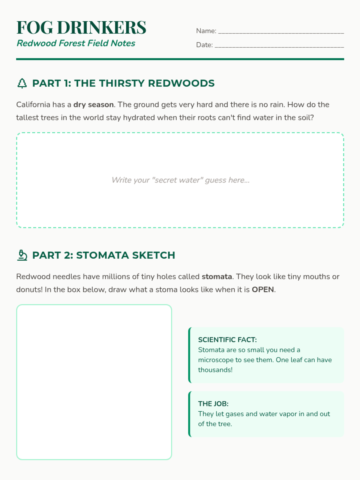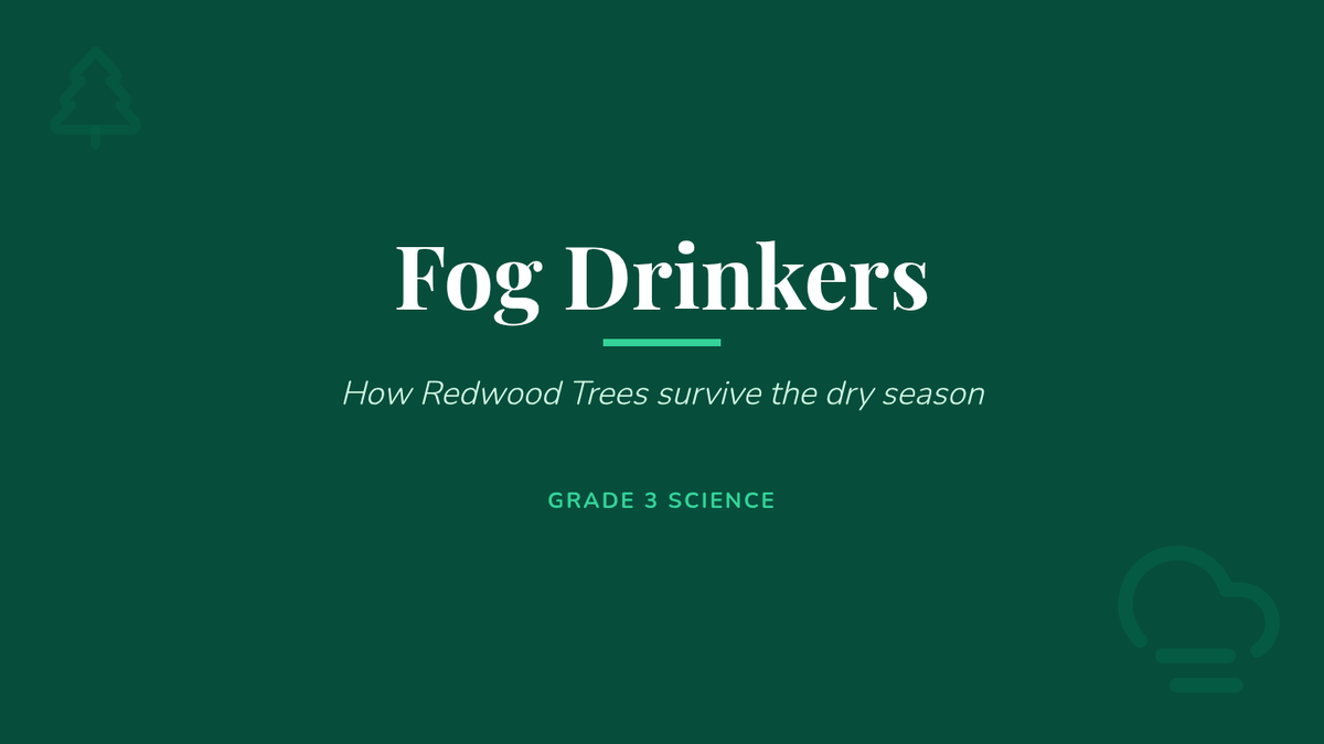 A 3rd-grade science lesson exploring how redwood trees survive dry seasons by 'drinking' fog through tiny microscopic pores called stomata using reverse transpiration.
