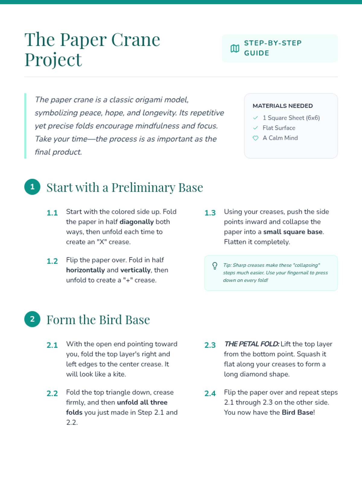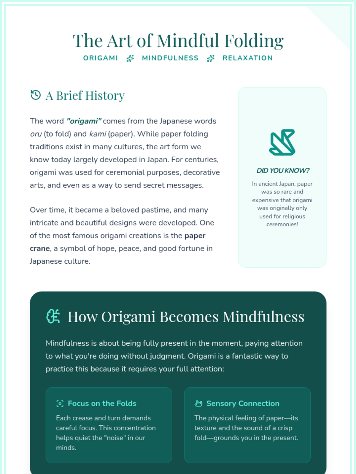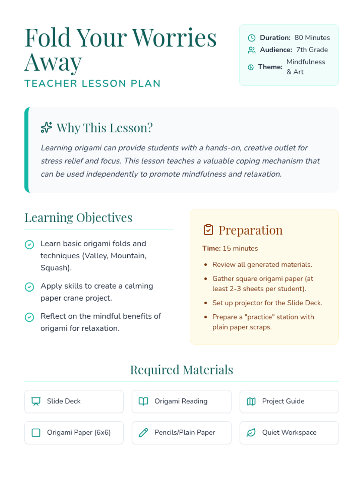A mindful 80-minute lesson for 7th graders that introduces origami as a tool for stress reduction and focus. Students learn basic folds and create a paper crane while exploring the history and meditative benefits of this ancient art form.