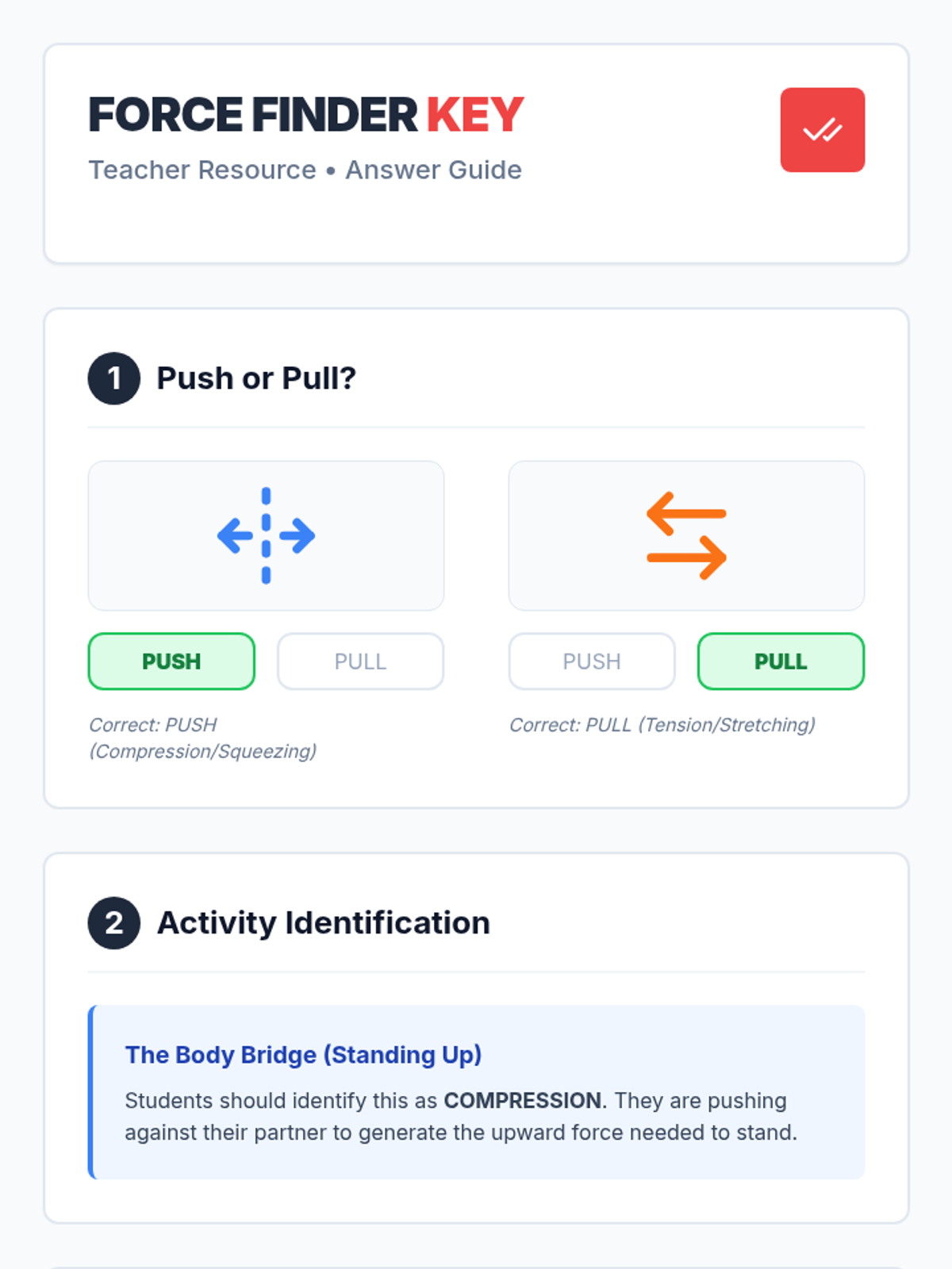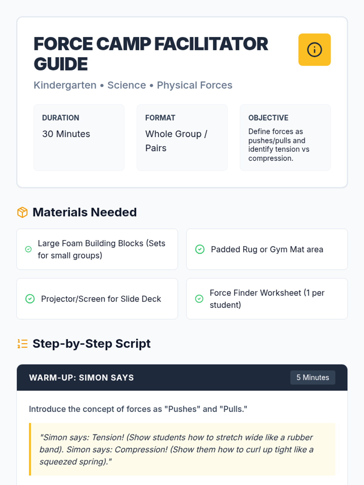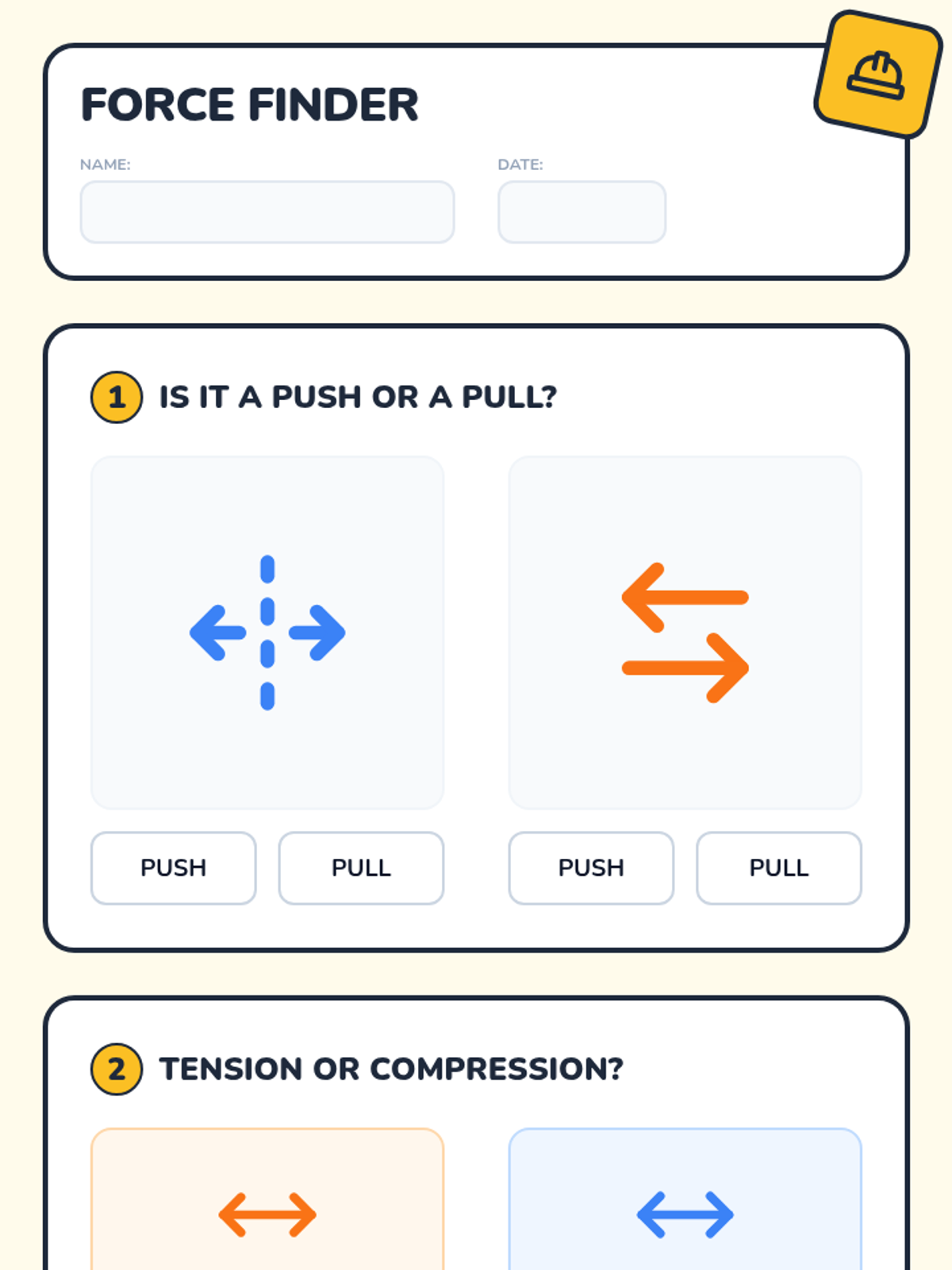 A Kindergarten science lesson exploring the physical forces of tension and compression through body movement, video observation, and building with foam blocks. Students learn to define forces as pushes or pulls and apply these concepts to real-world structures like forts and bridges.