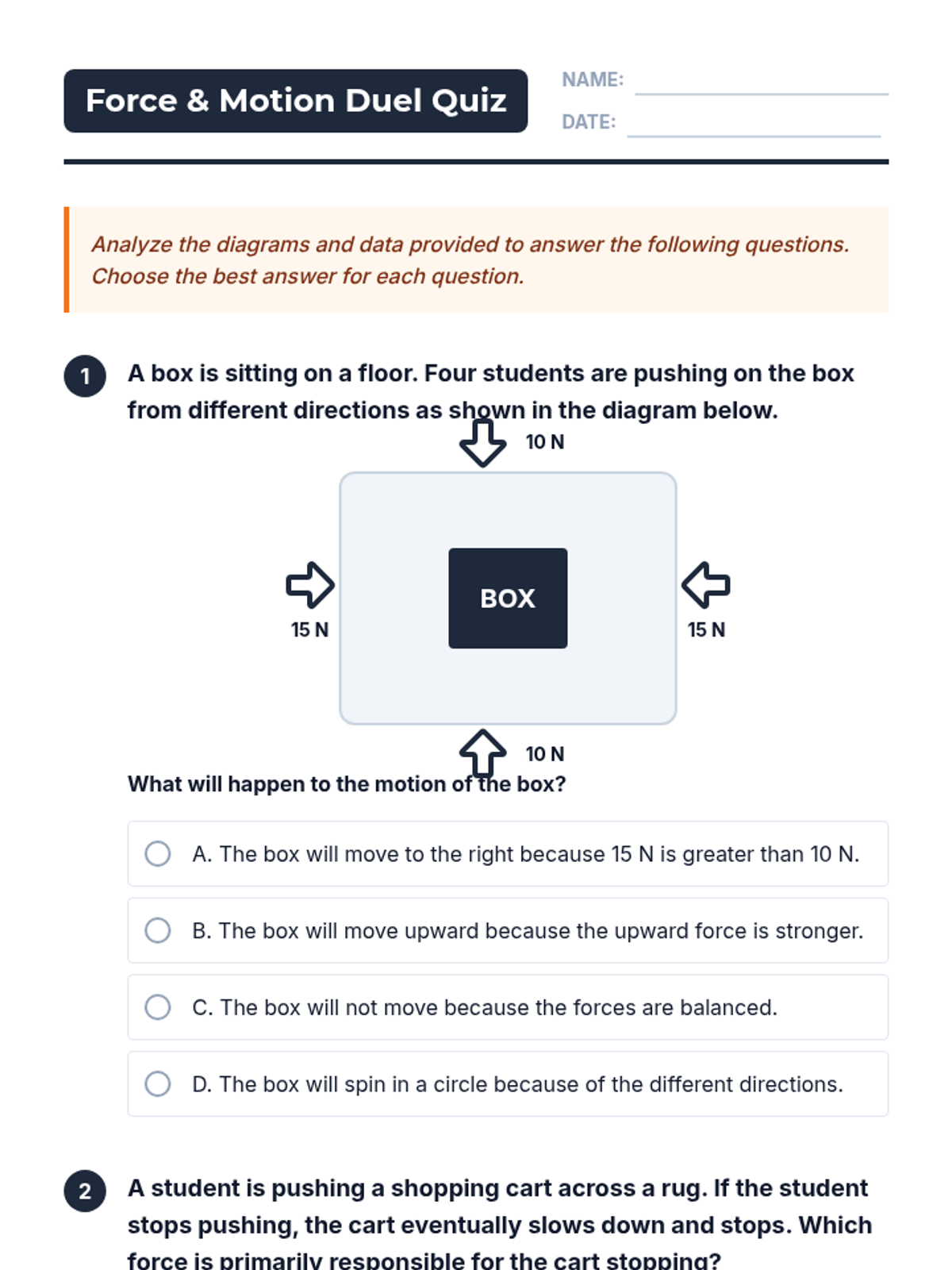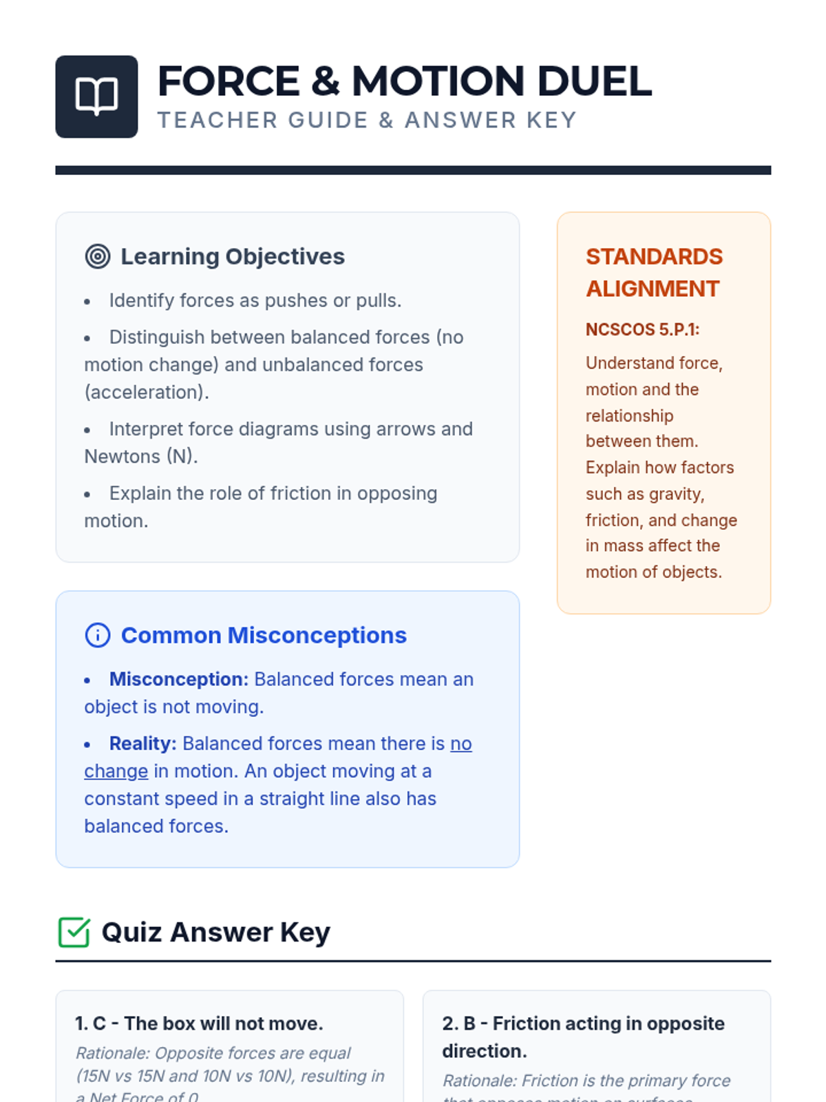 A comprehensive Grade 5 science lesson covering balanced and unbalanced forces, aligned to NCSCOS 5.P.1. Students explore how forces affect motion through real-world examples, a friction investigation, and EOG-style practice.