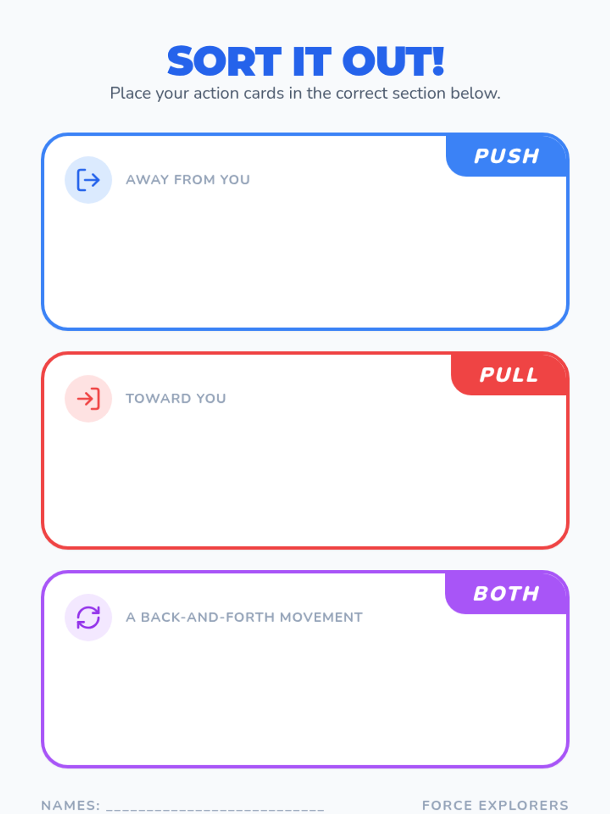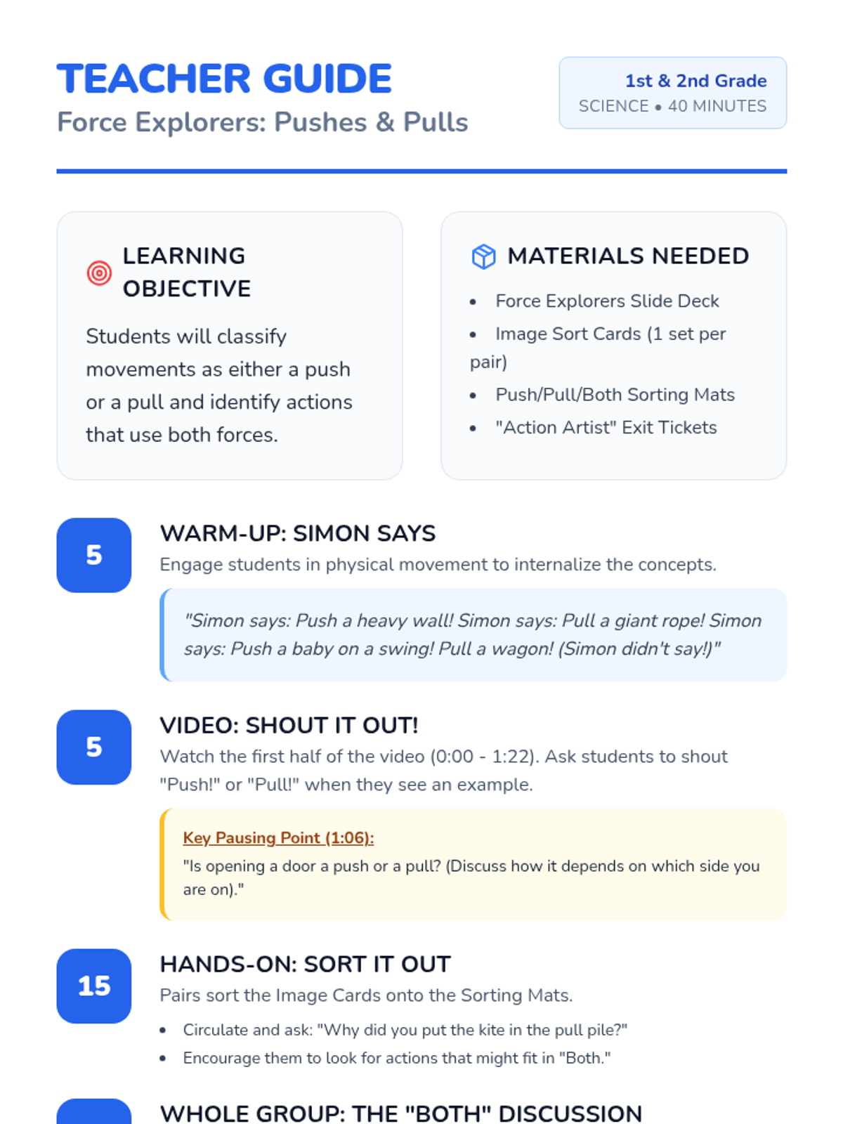 A hands-on introductory lesson for 1st and 2nd graders to identify and classify forces as pushes or pulls through games, videos, and collaborative sorting.