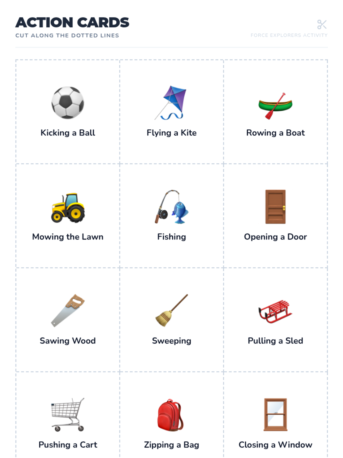 A review lesson where students sort various chores into push or pull categories and participate in a class-wide 'Chore Challenge' game.