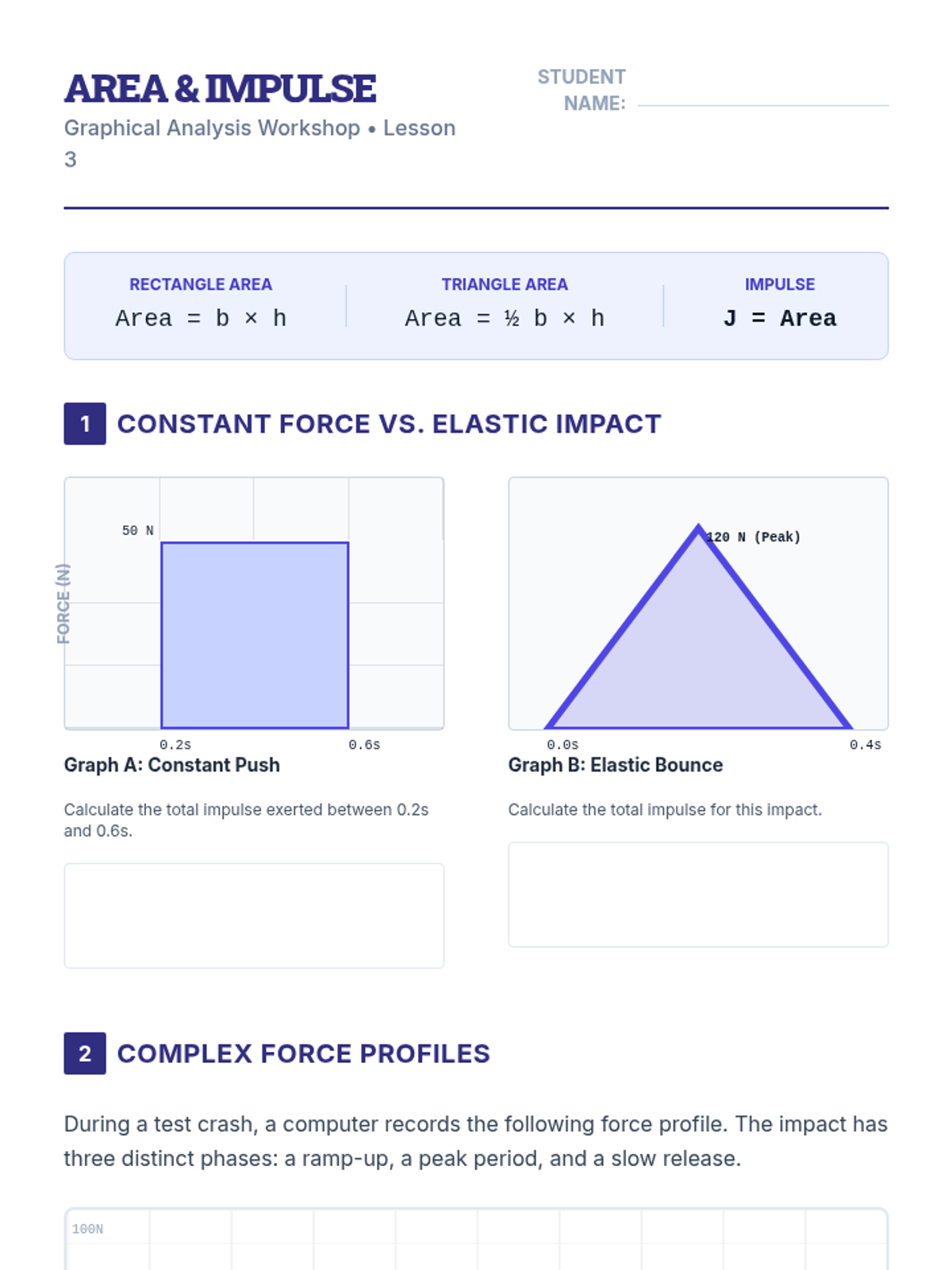 Focuses on interpreting Force-Time graphs and calculating Impulse as the area under the curve.