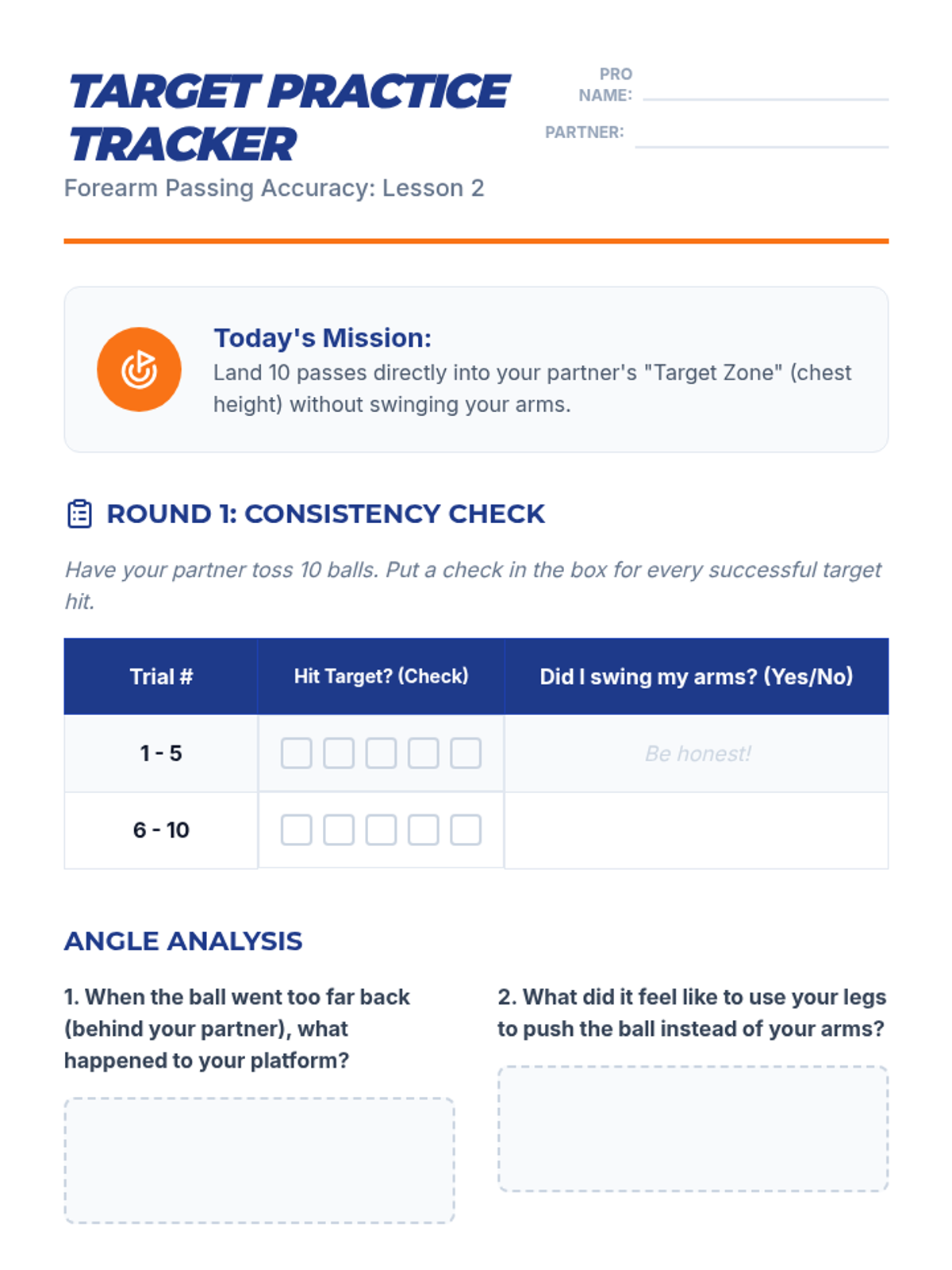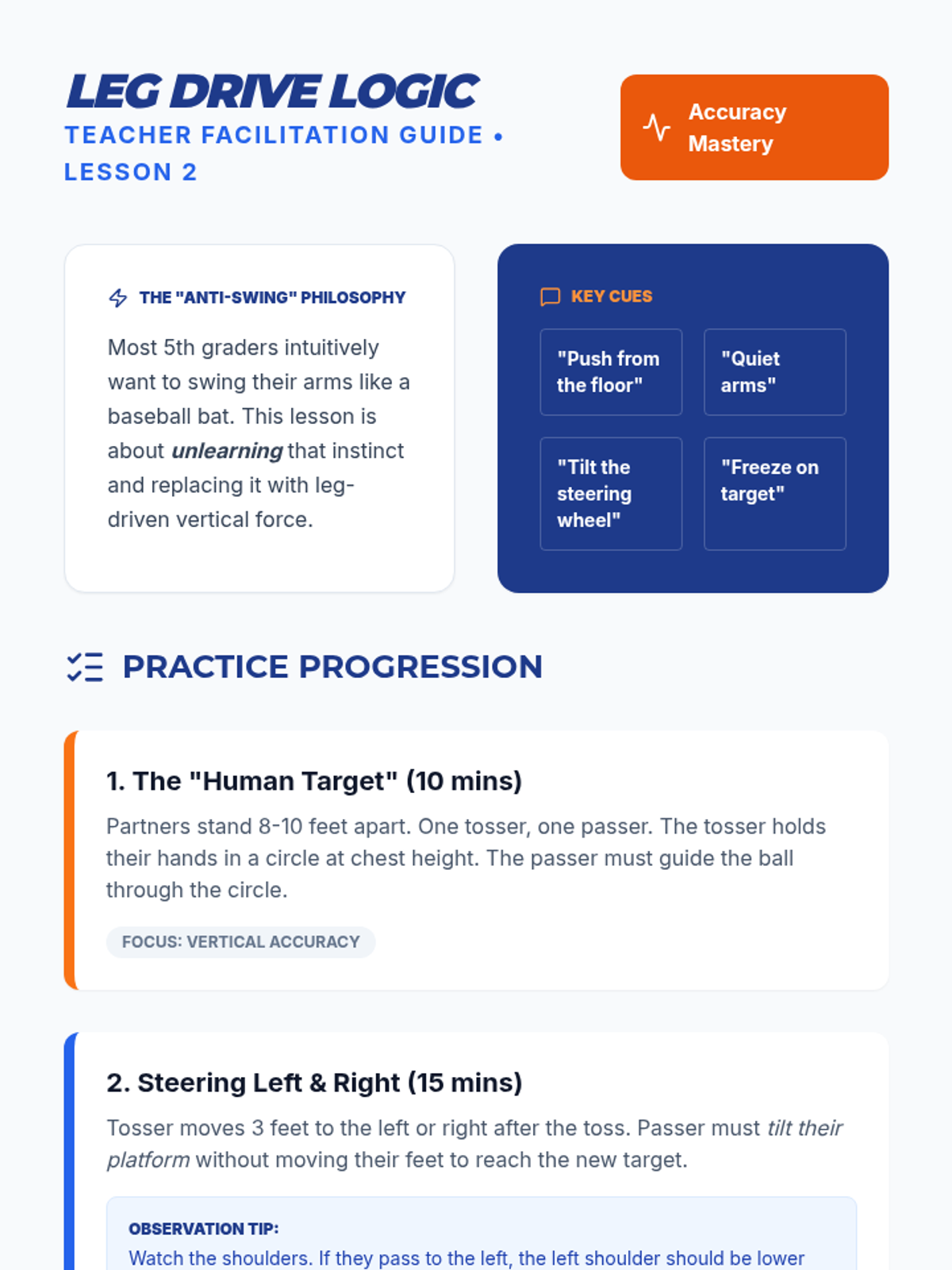 Develops accuracy in the forearm pass by teaching students to angle their platform and use their legs for power instead of swinging their arms.