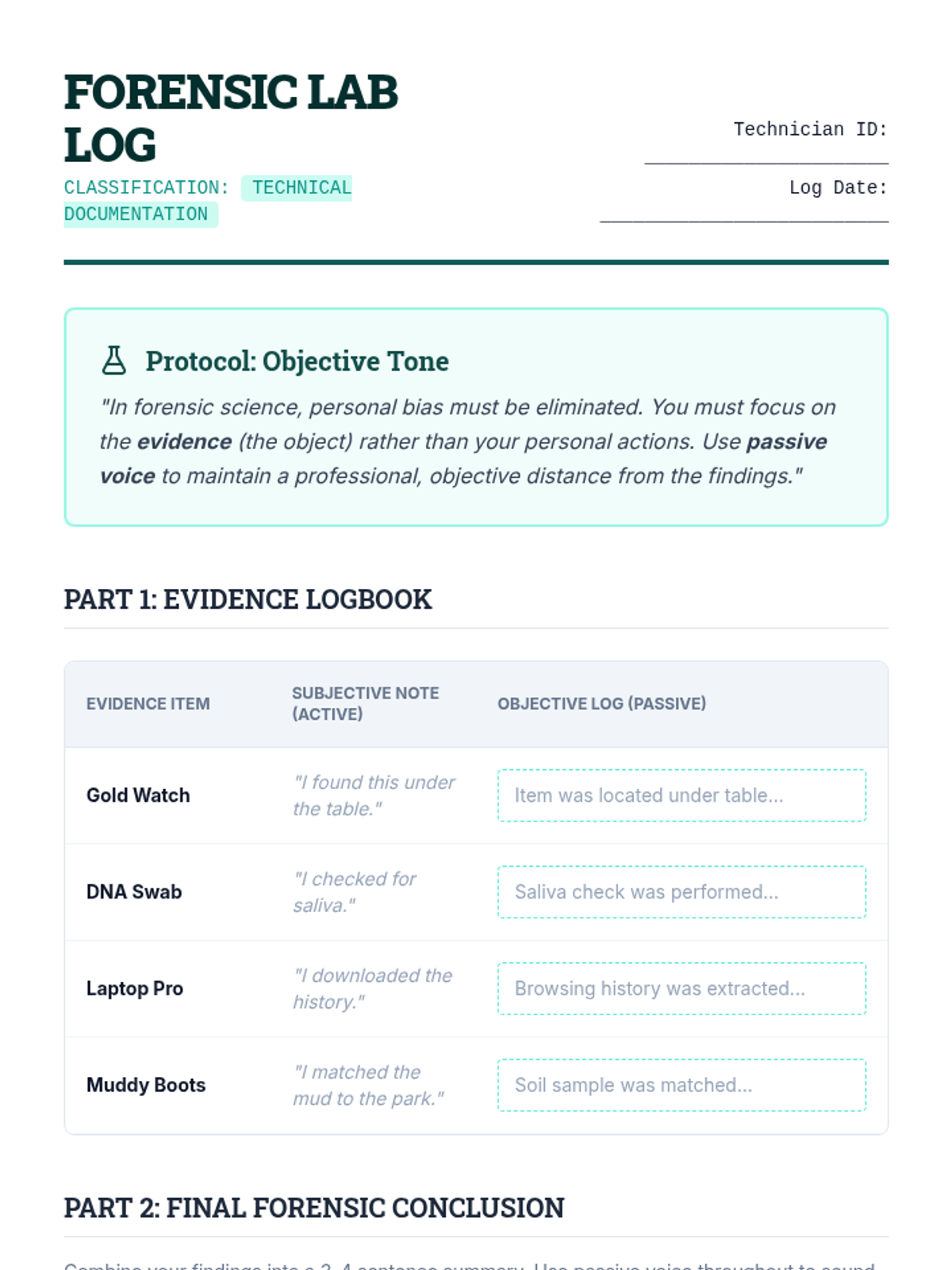 Students learn the valid use of passive voice in technical writing to maintain objectivity and focus on the object of study rather than the person performing the action.
