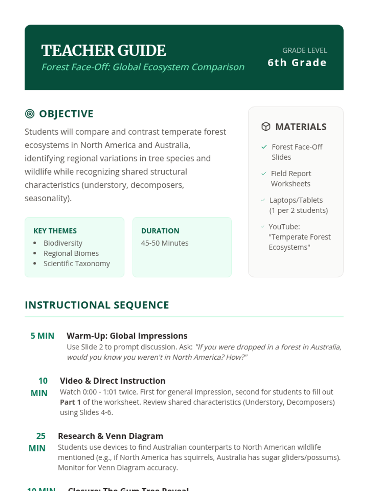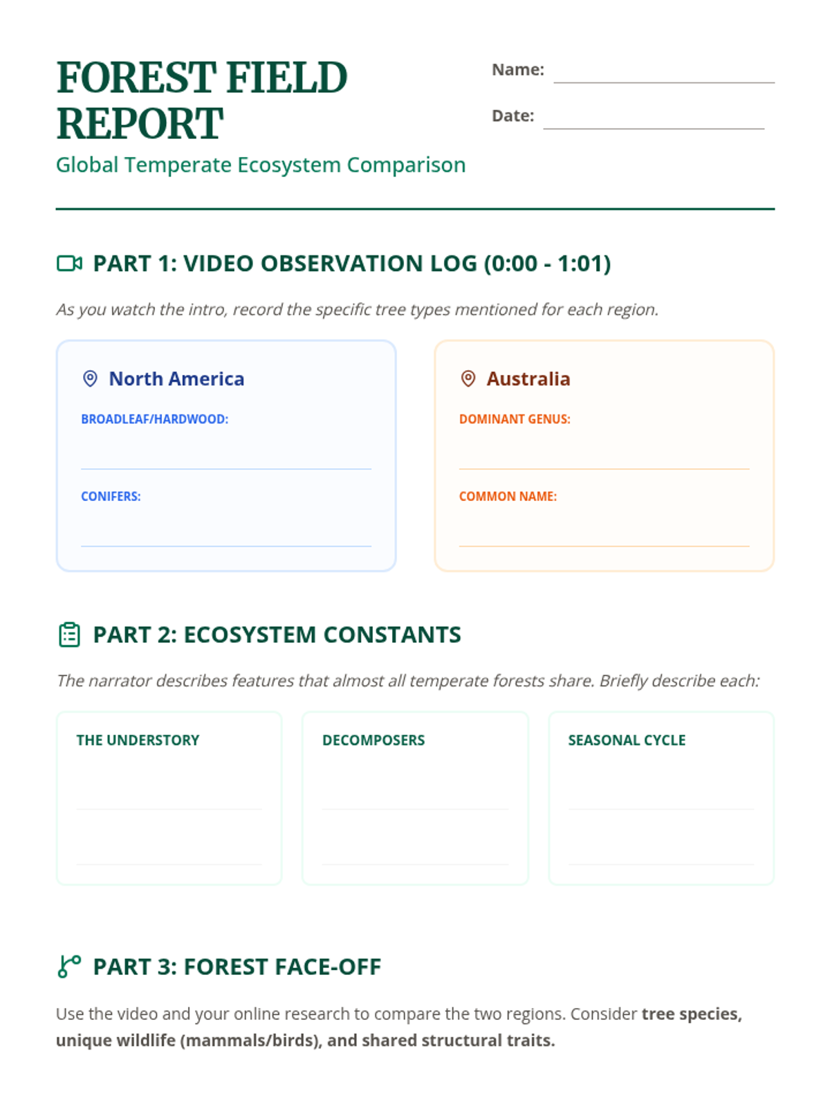 A comparative study of temperate forest ecosystems in North America and Australia. Students investigate tree species, wildlife, and the unique characteristics that define these global biomes.