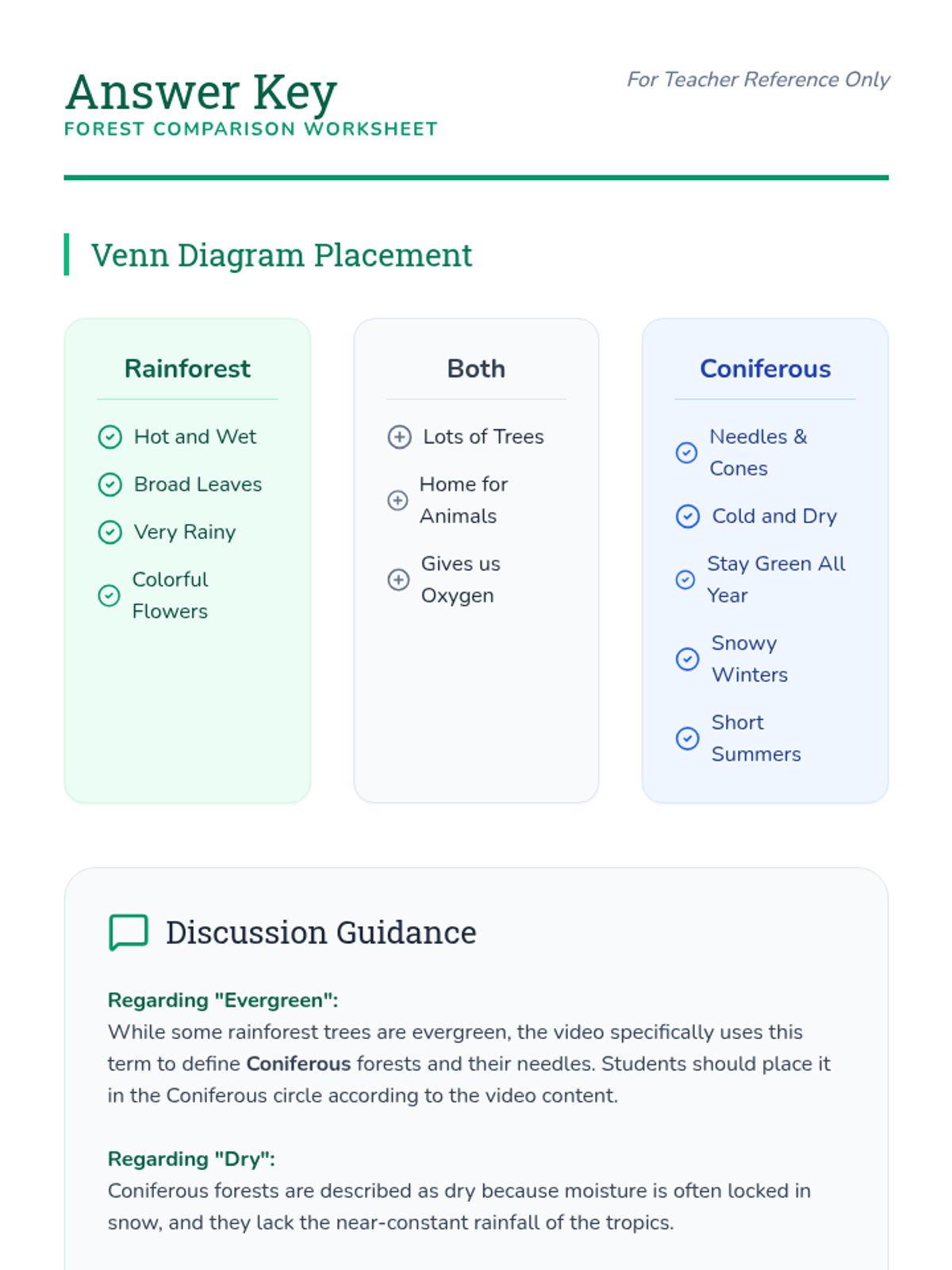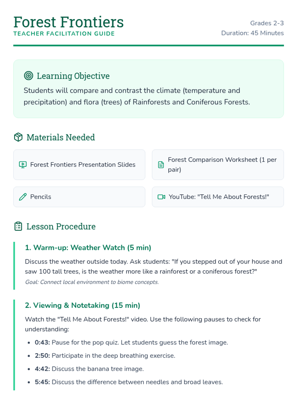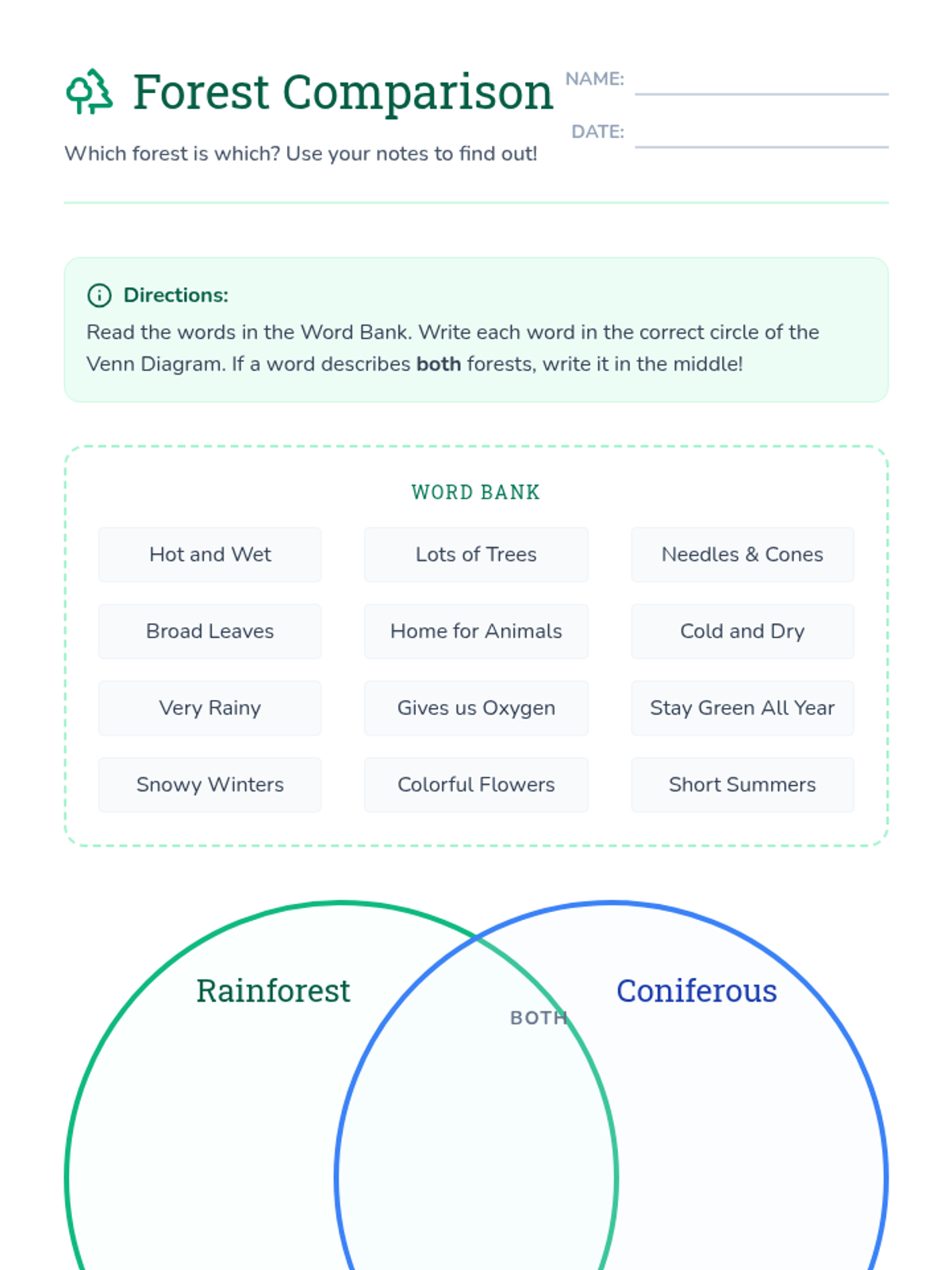 A lesson exploring the differences between rainforests and coniferous forests through video observation and a collaborative Venn diagram activity. Students will identify key characteristics of climate and plant life in both biomes.