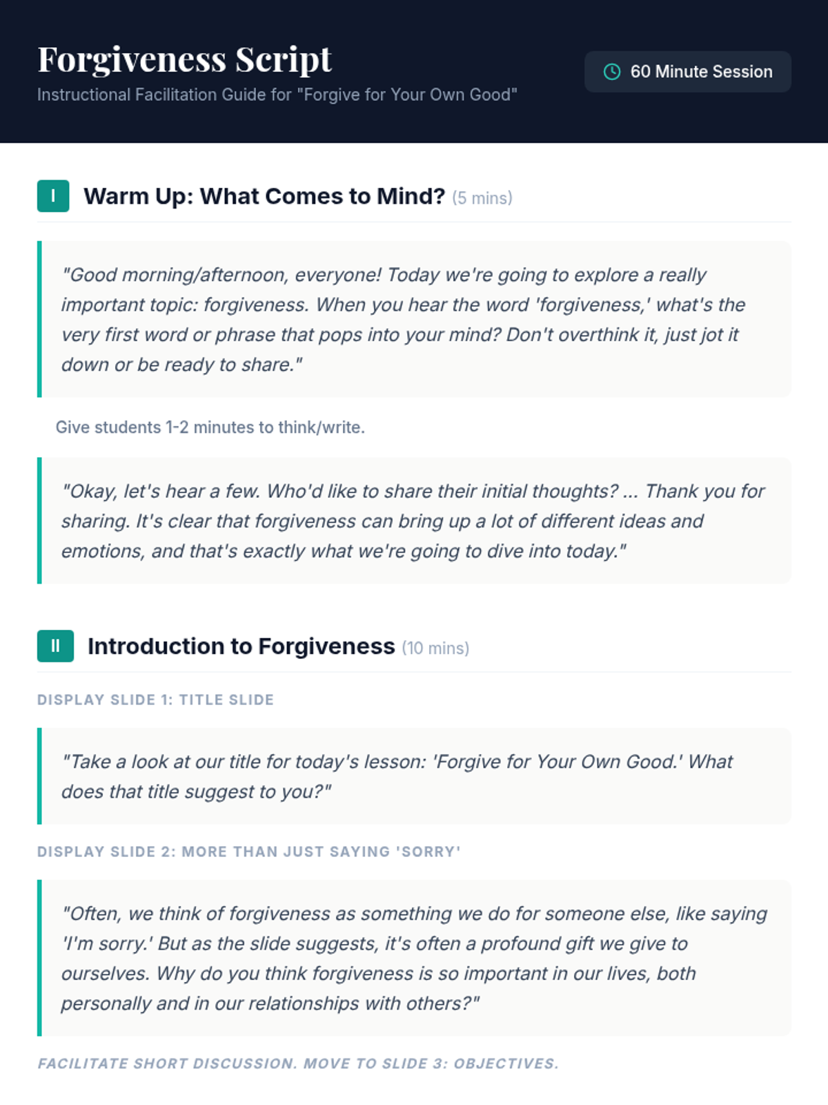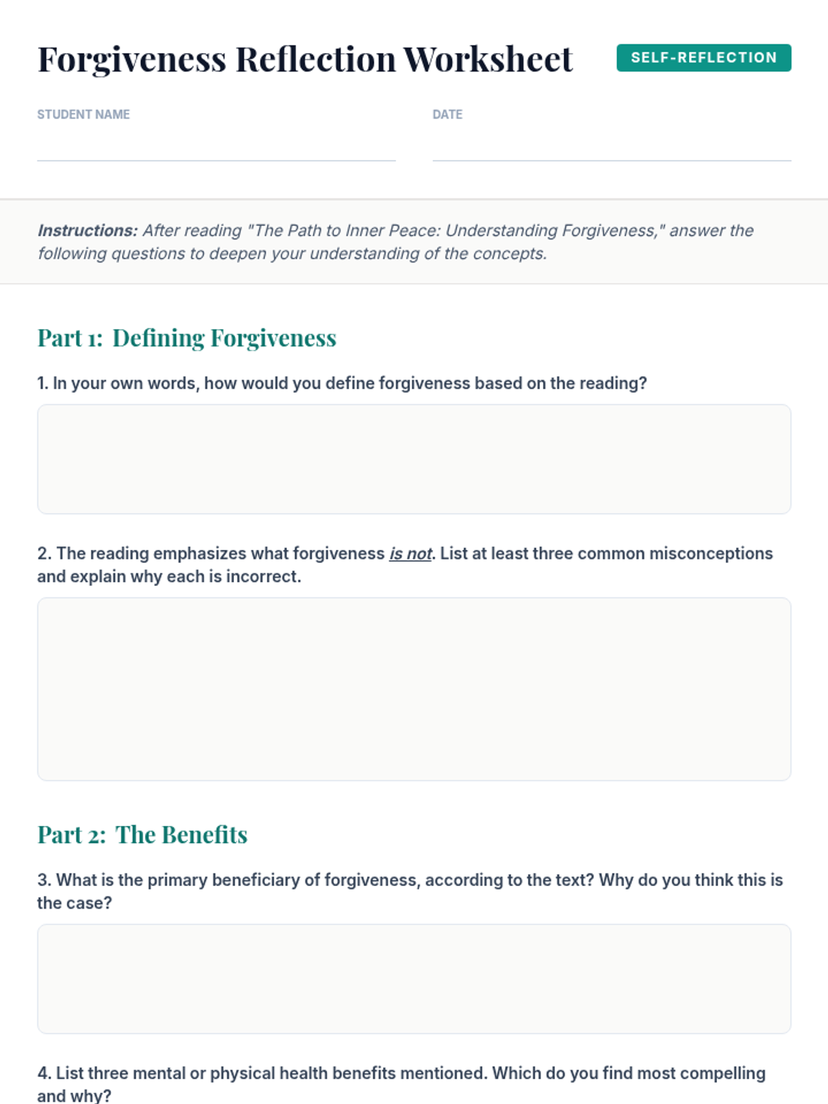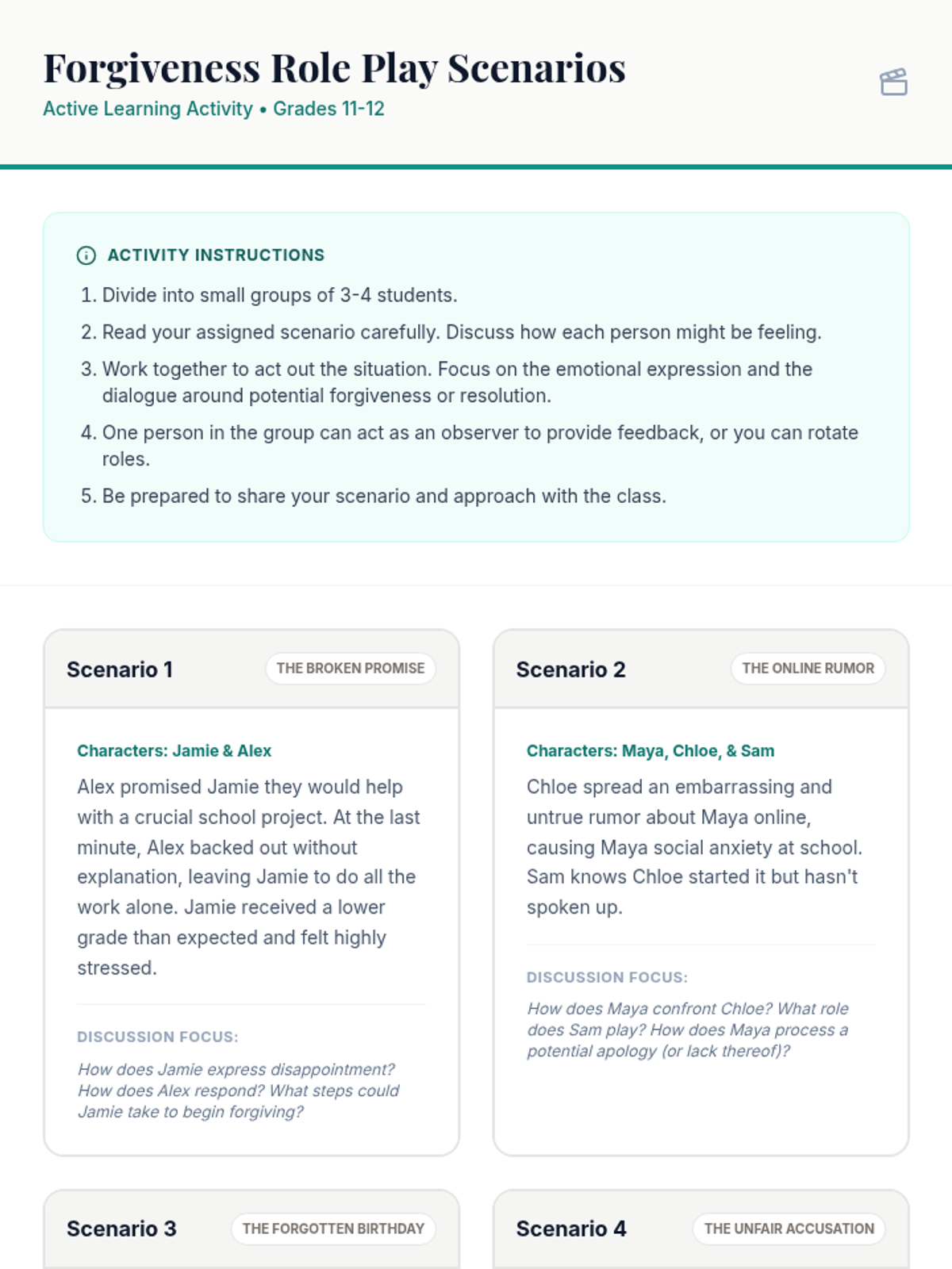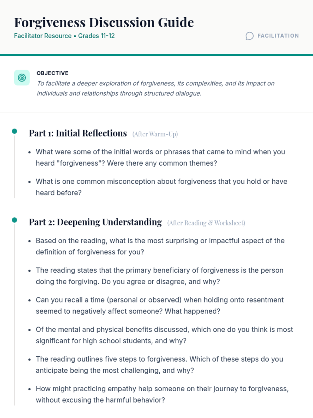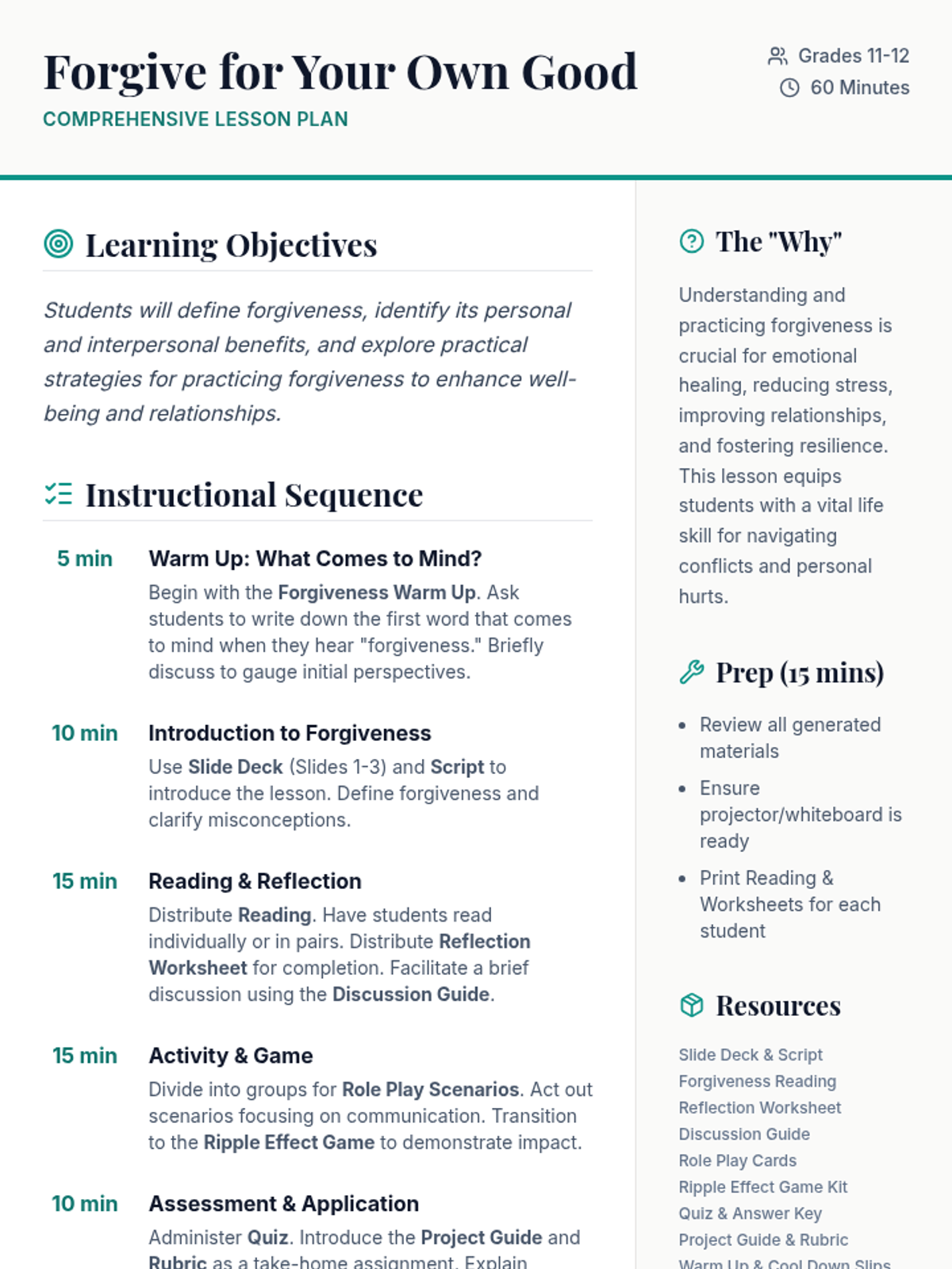 This lesson explores the profound impact of forgiveness on personal well-being and relationships. Students will understand what forgiveness is, its benefits, and practical steps to practice it. Designed for 11th-12th grade students, this 60-minute lesson is suitable for a single class session.