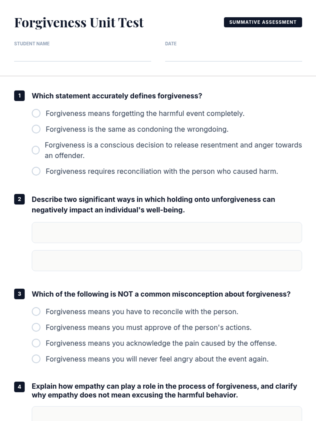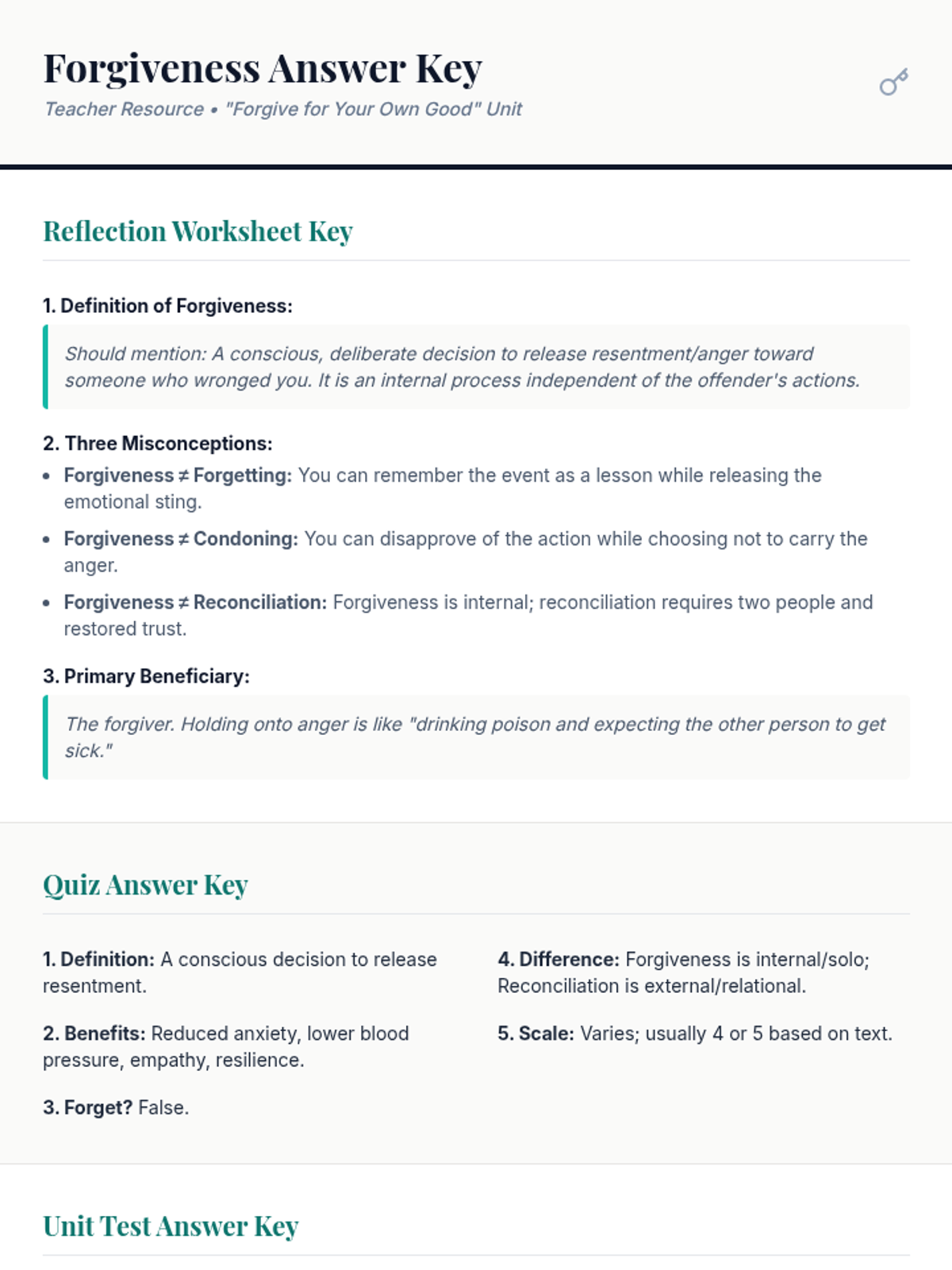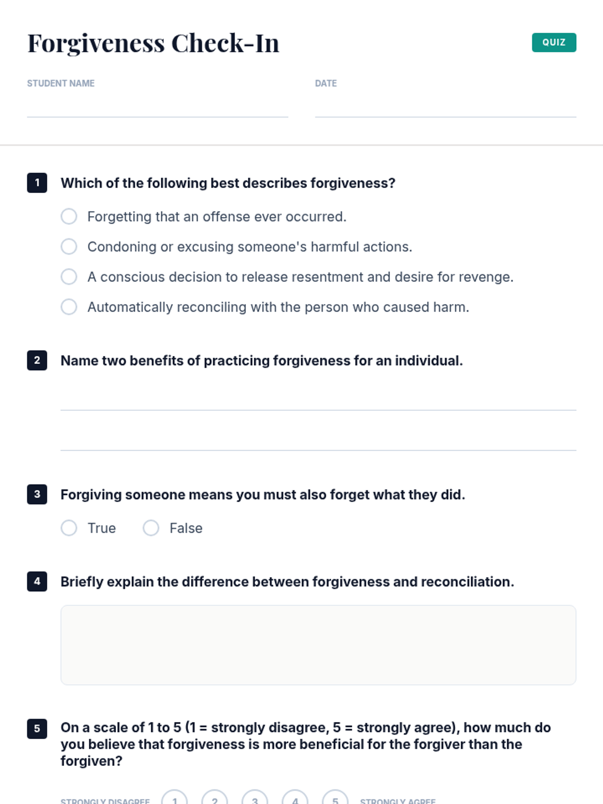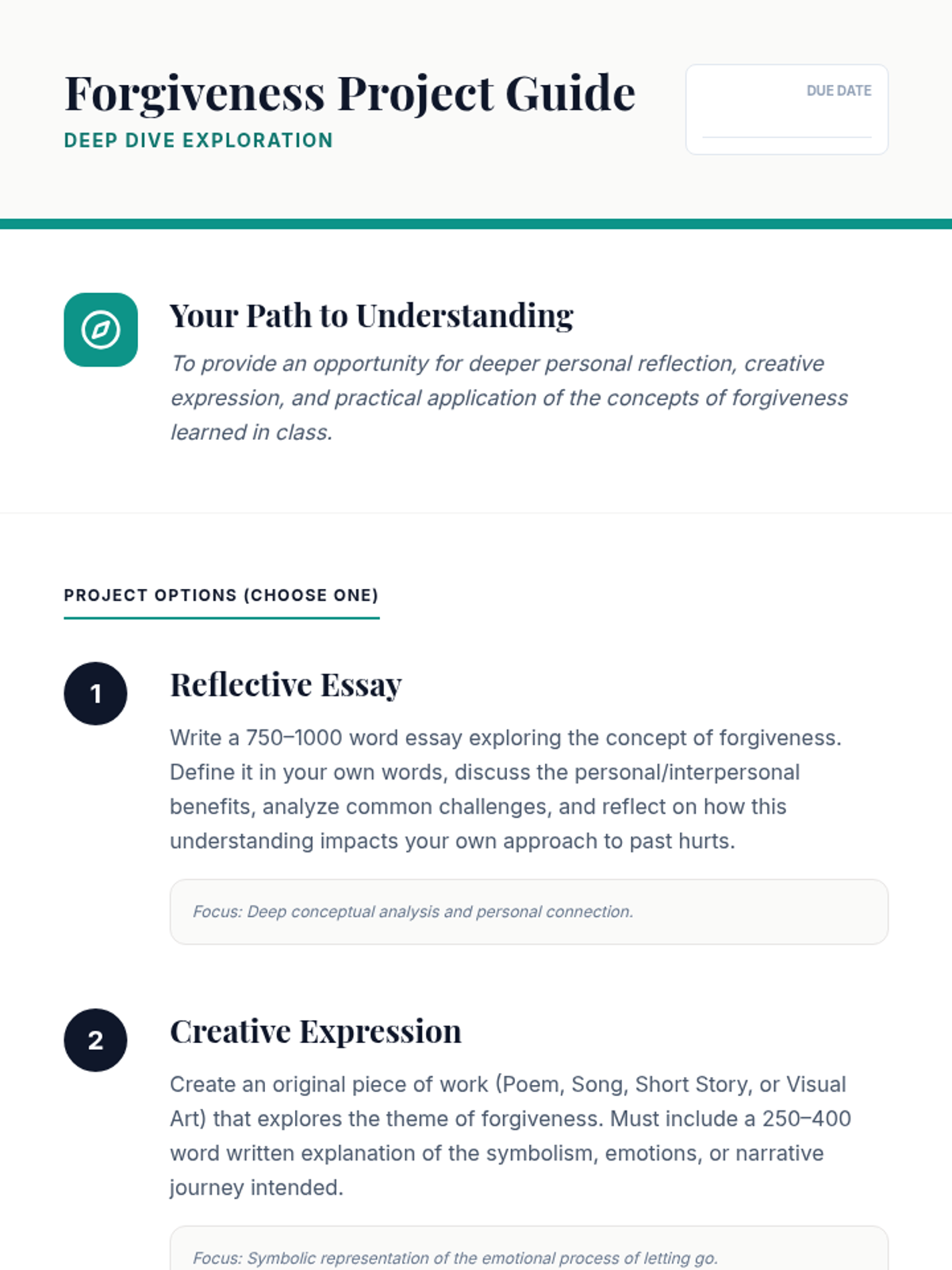 This lesson explores the profound impact of forgiveness on personal well-being and relationships. Students will understand what forgiveness is, its benefits, and practical steps to practice it. Designed for 11th-12th grade students, this 60-minute lesson is suitable for a single class session.