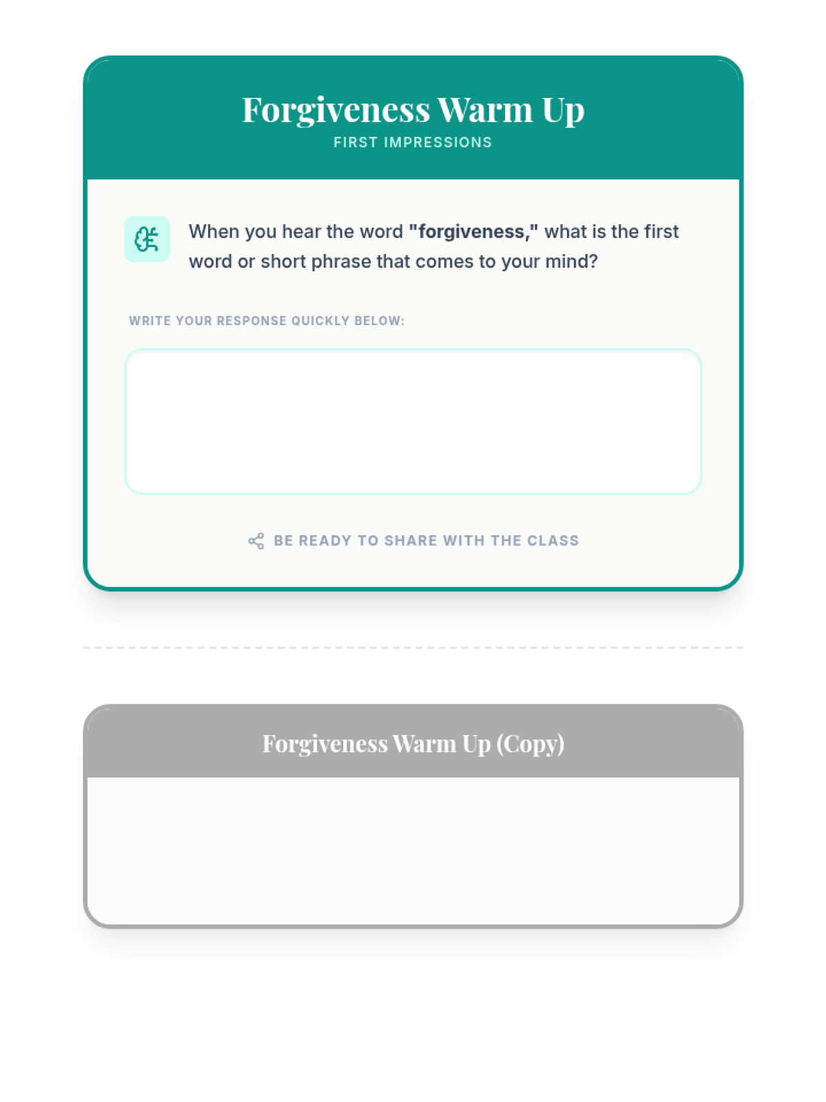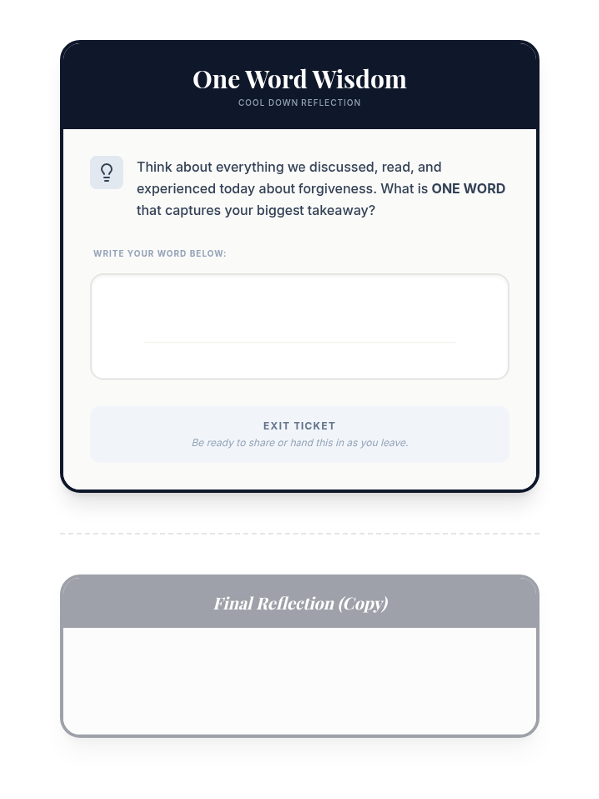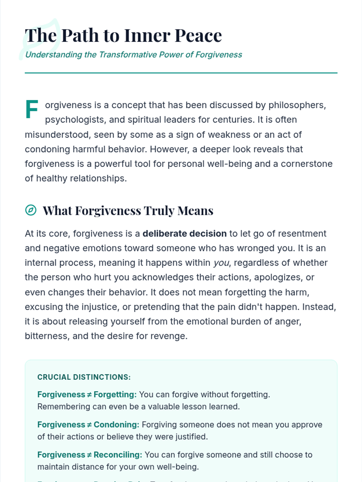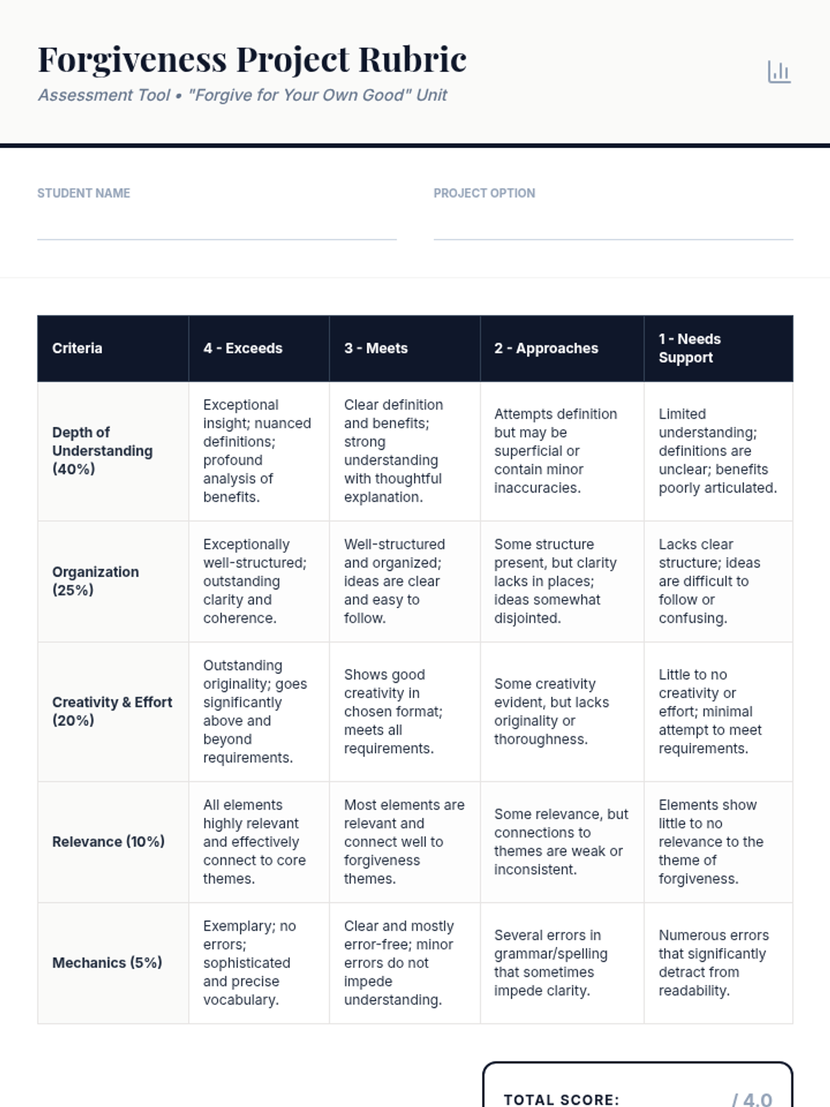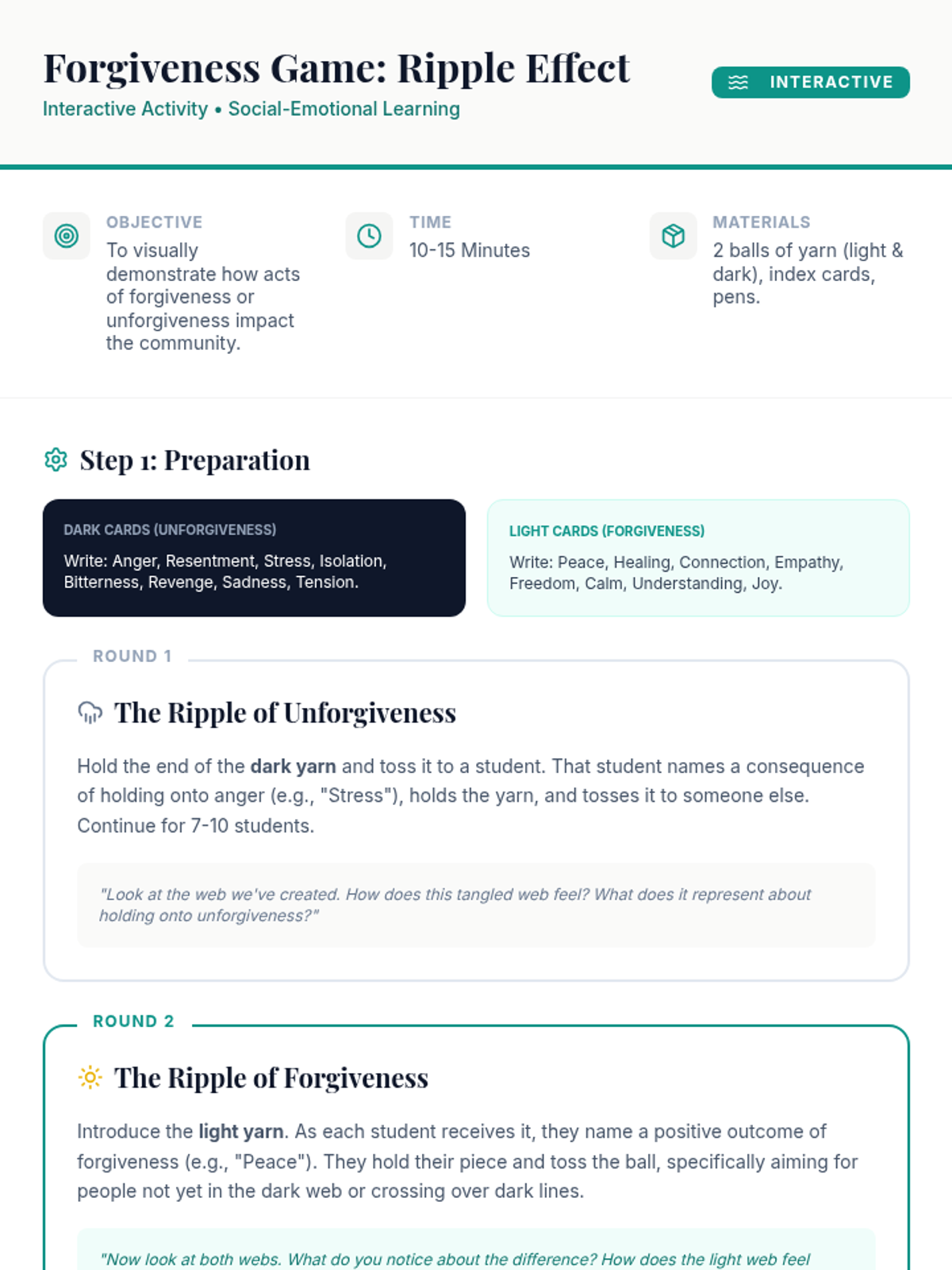 This lesson explores the profound impact of forgiveness on personal well-being and relationships. Students will understand what forgiveness is, its benefits, and practical steps to practice it. Designed for 11th-12th grade students, this 60-minute lesson is suitable for a single class session.