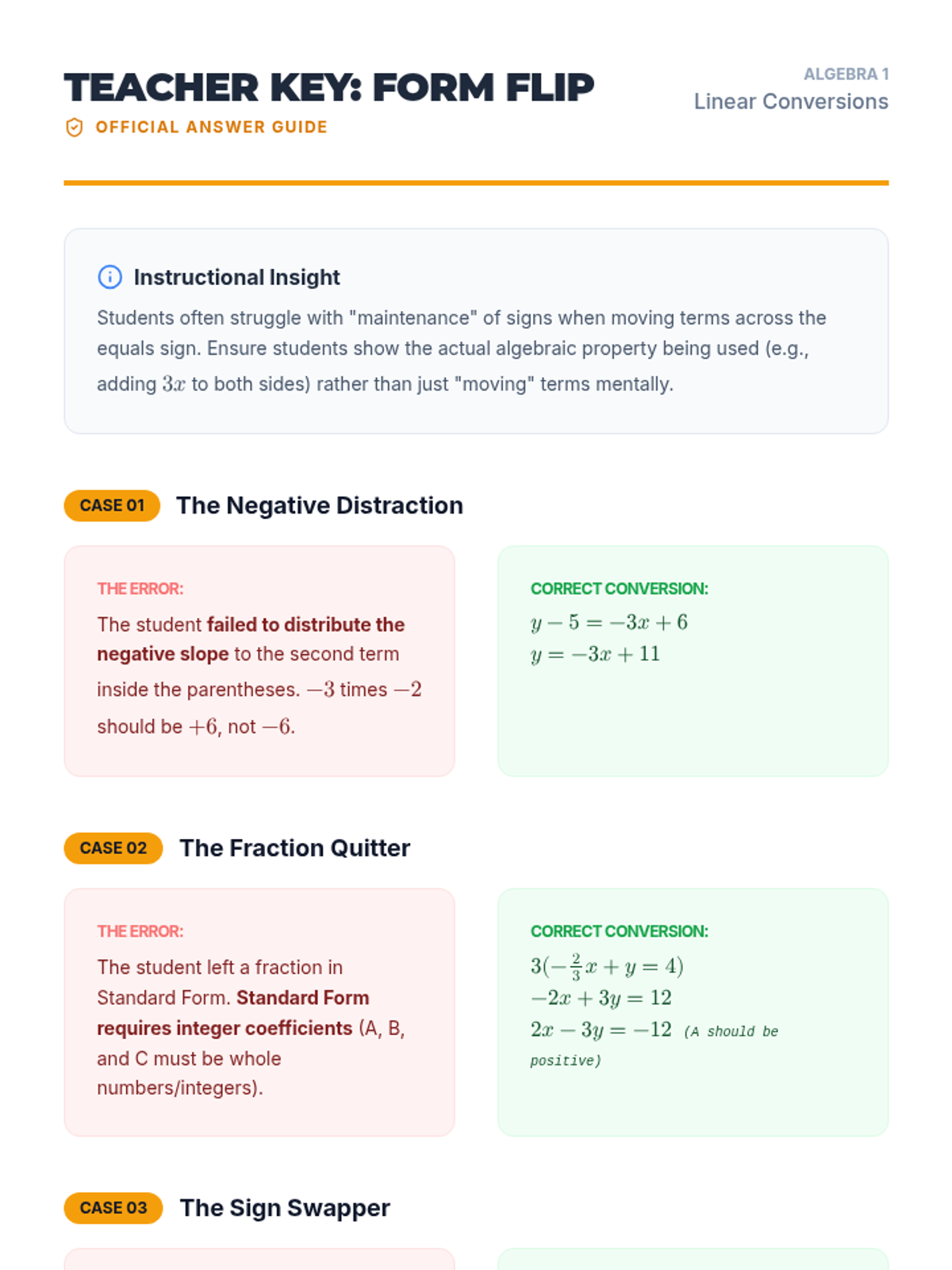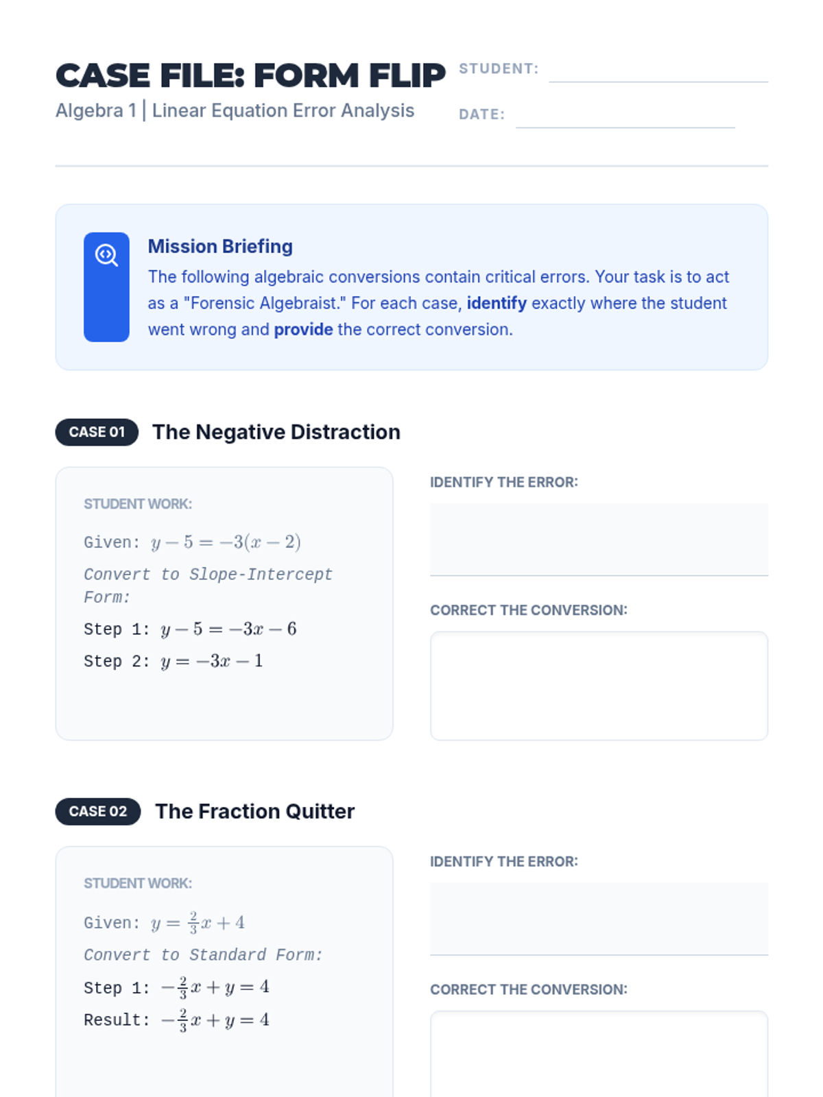 A 9th-grade algebra lesson focused on converting between linear equation forms (Slope-Intercept, Point-Slope, and Standard) and identifying common algebraic errors in the process. Students will analyze student work samples to find mistakes and justify correct conversions.