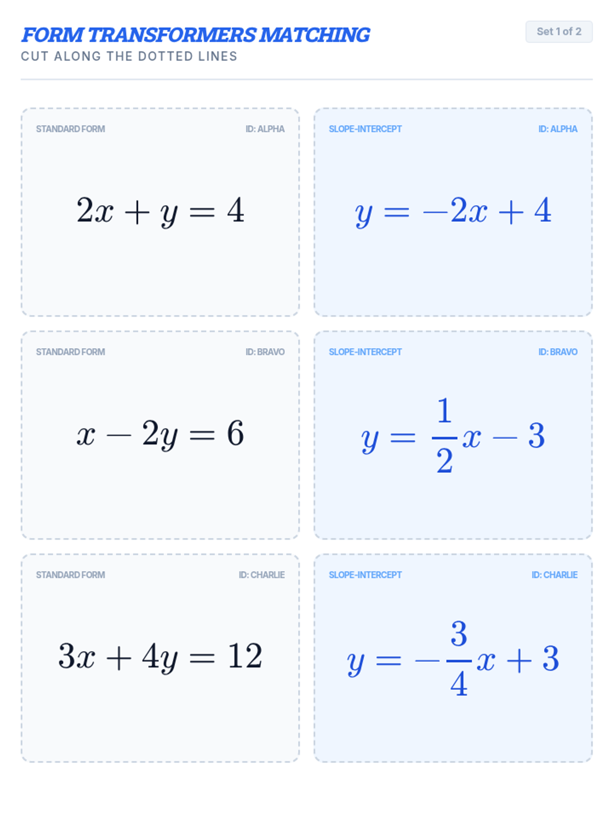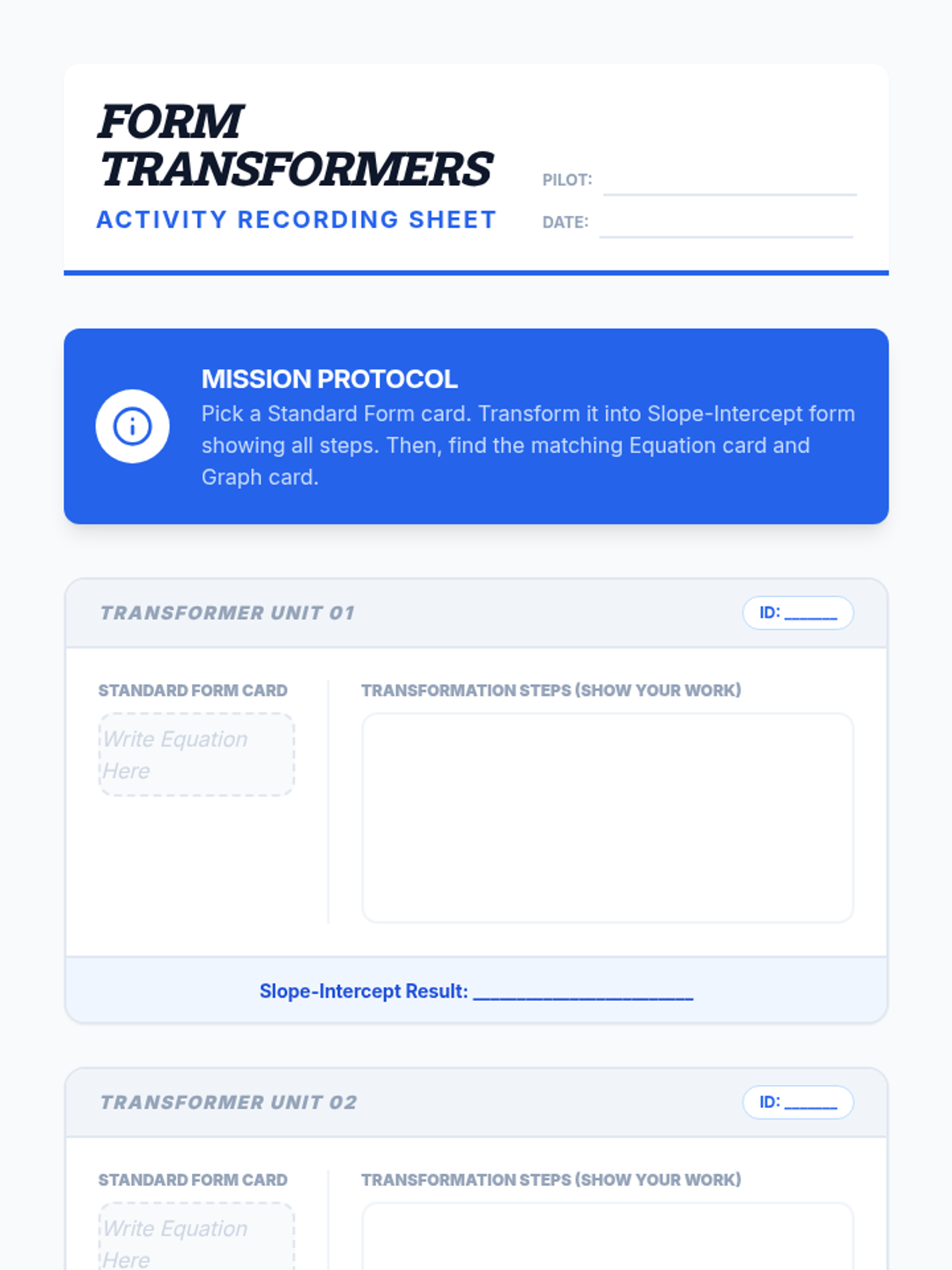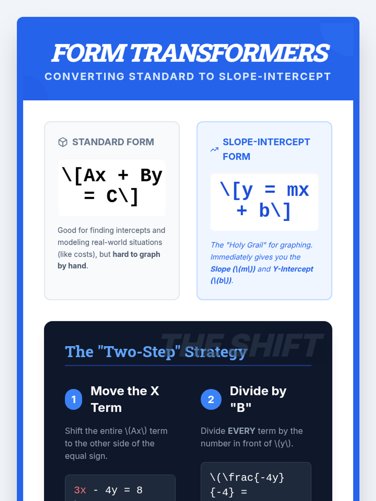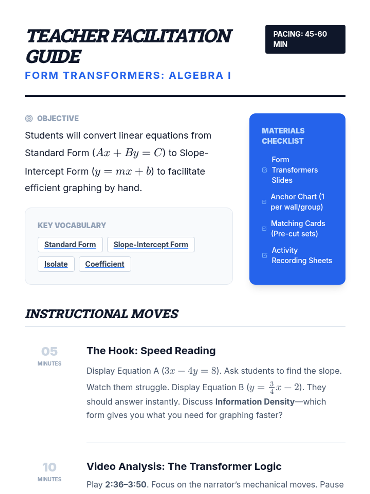 A high-energy algebra lesson where students master converting linear equations from Standard Form to Slope-Intercept Form using the 'Move then Divide' strategy. Includes a video analysis, hands-on matching activity, and an anchor chart for reference.