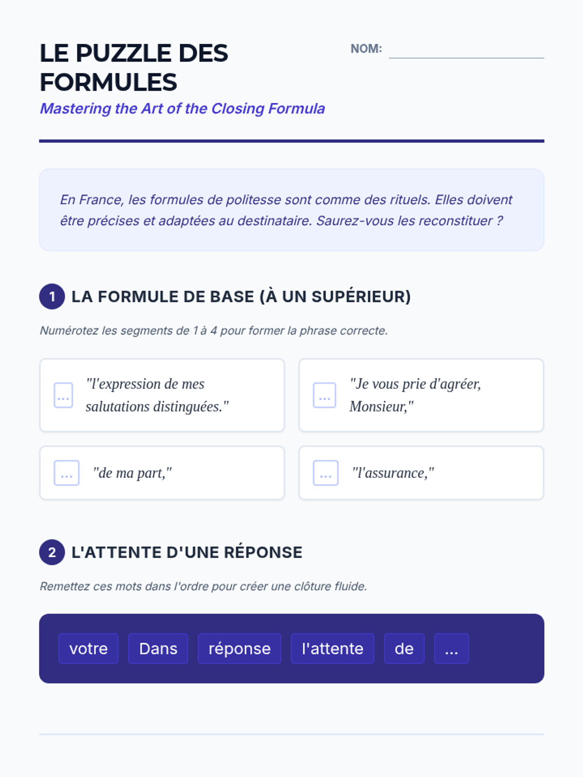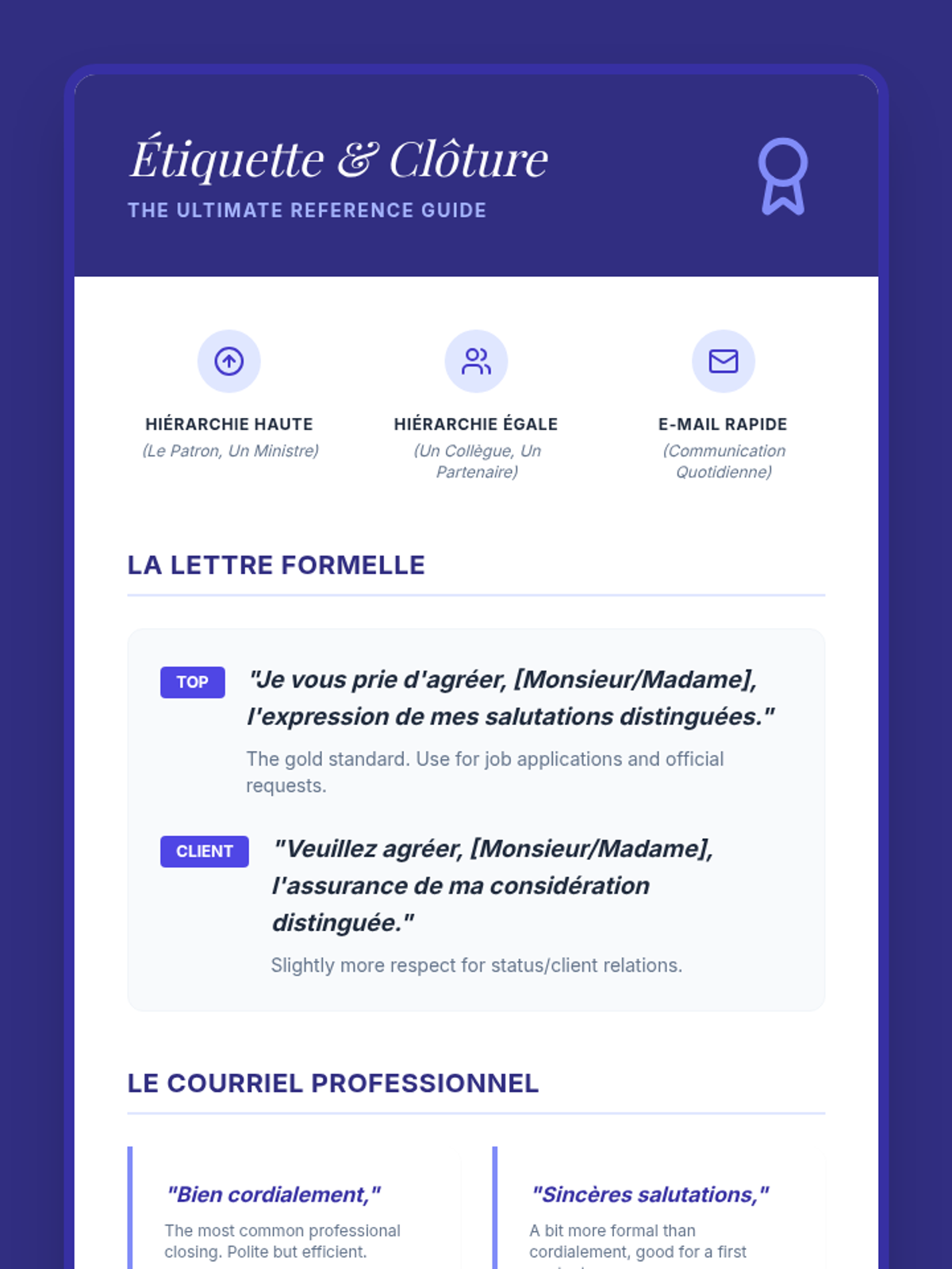 An exploration of the intricate closing formulas used in French formal letters, matching the level of respect and hierarchy to the appropriate phrase.