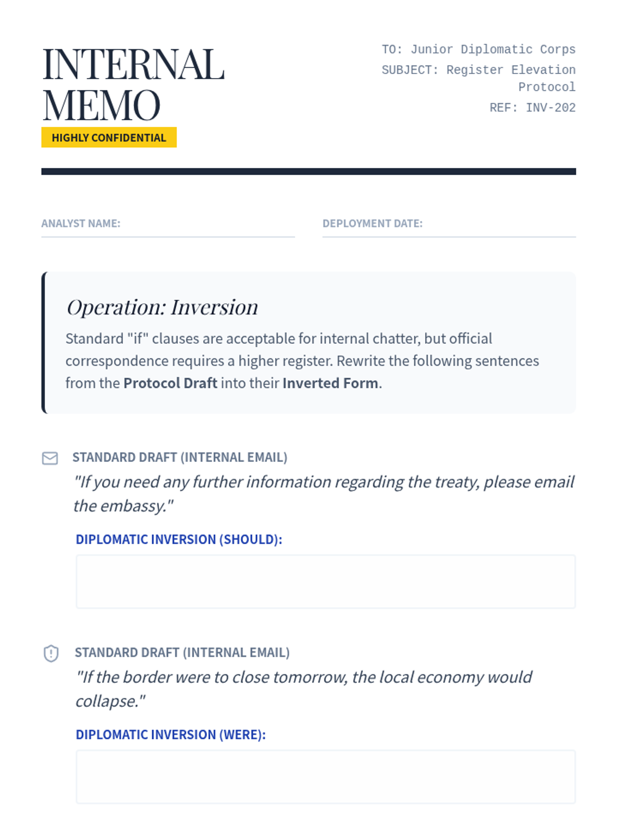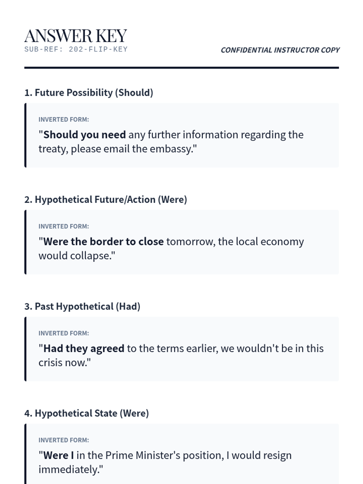 Students learn to replace 'if' with auxiliary inversion (Should/Were/Had) to elevate the register of their speech and writing.