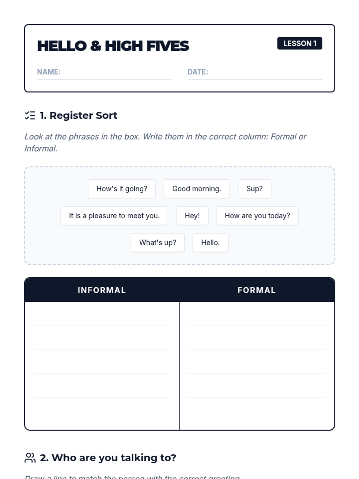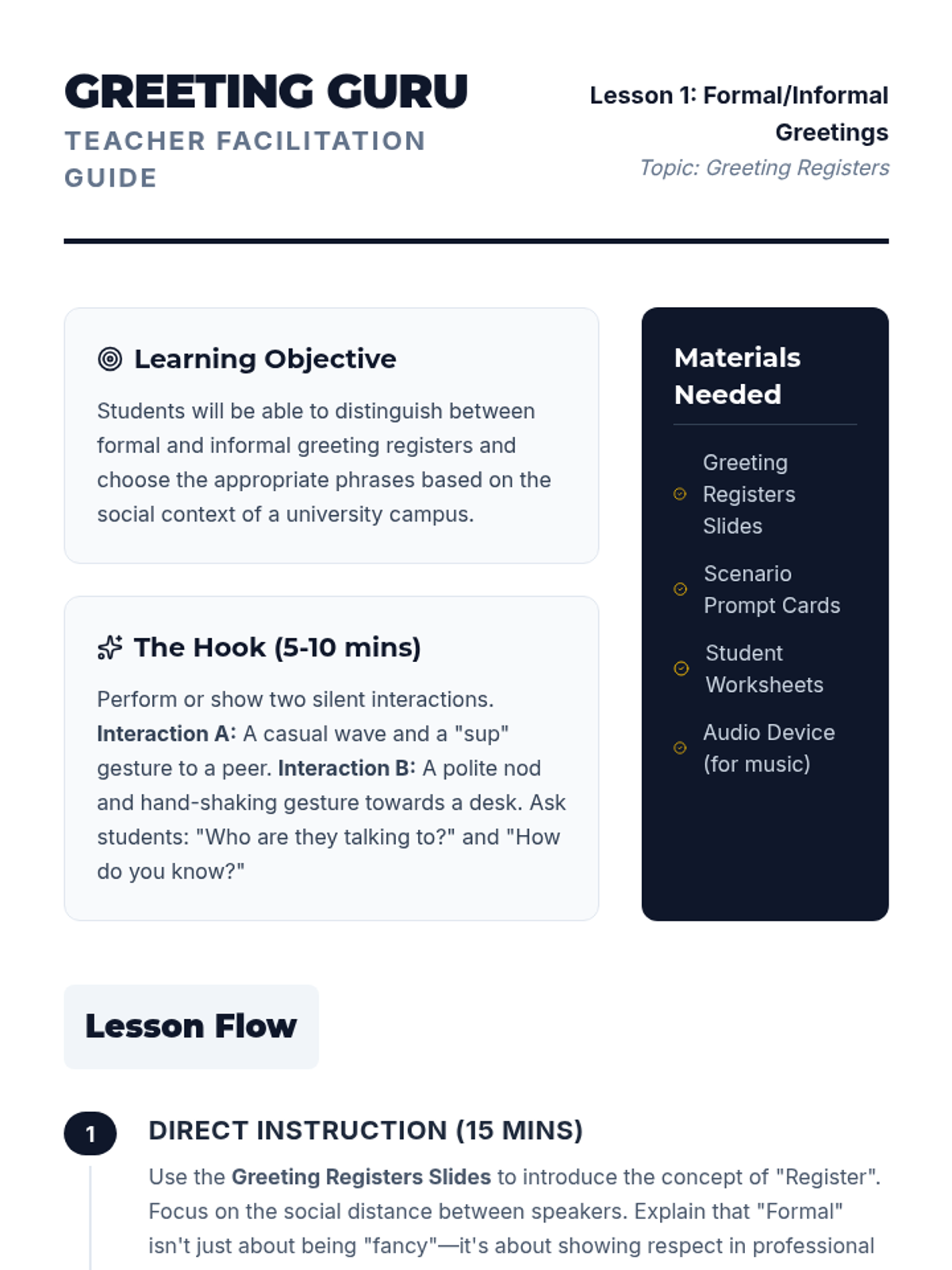 Students distinguish between formal greetings suitable for faculty and informal greetings for peers. They analyze context to choose the appropriate register and practice switching between them.