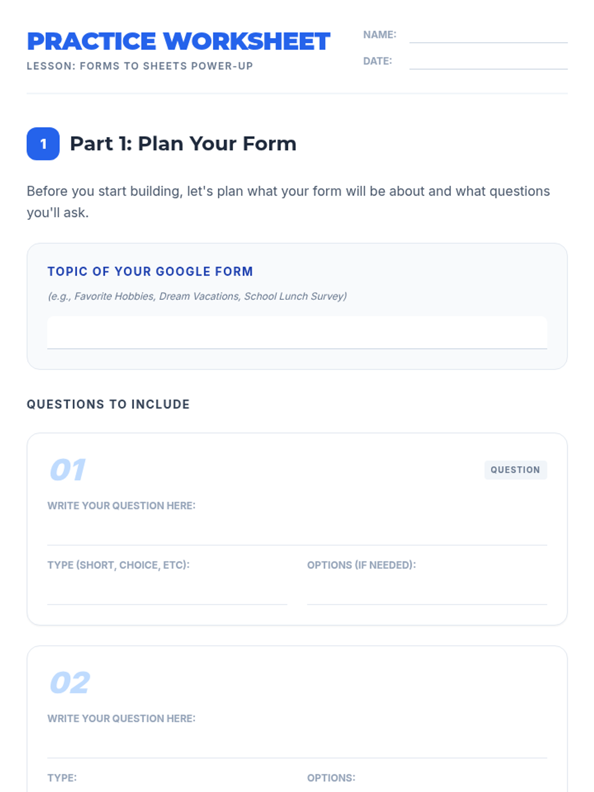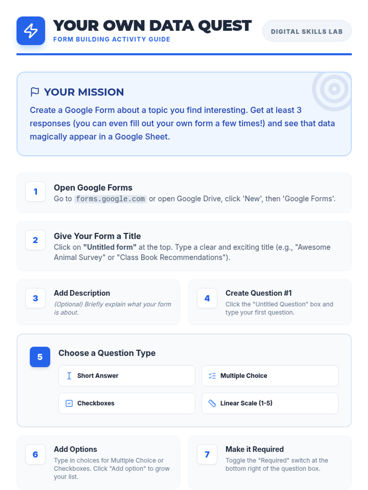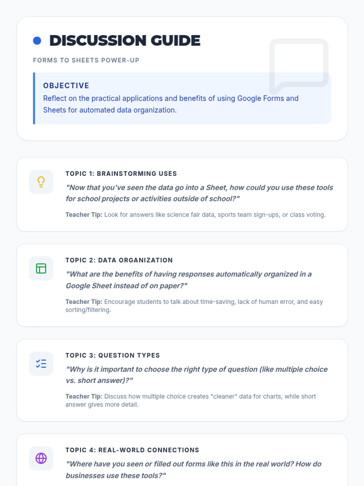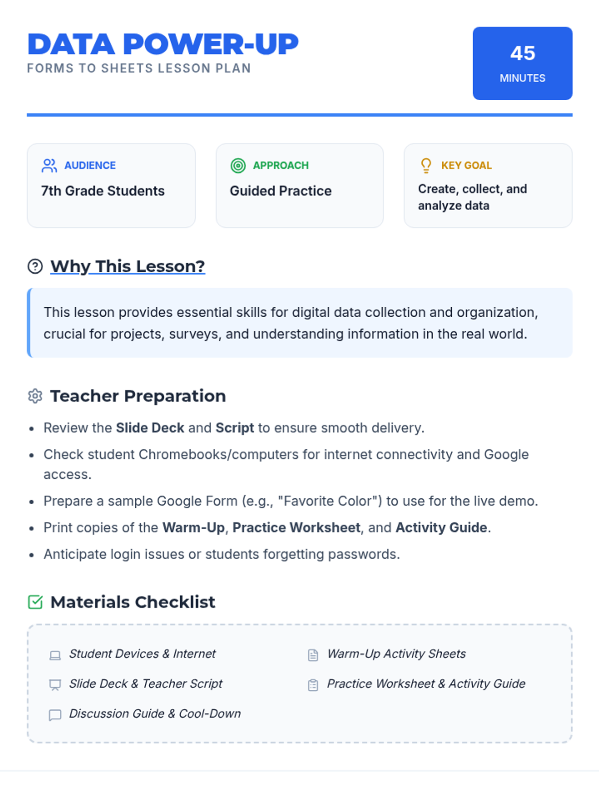 This lesson empowers 7th-grade students to collect and organize data efficiently using Google Forms and seamlessly integrate it with Google Sheets. Students will learn practical skills for surveys, data collection, and basic data management in a 45-minute session.