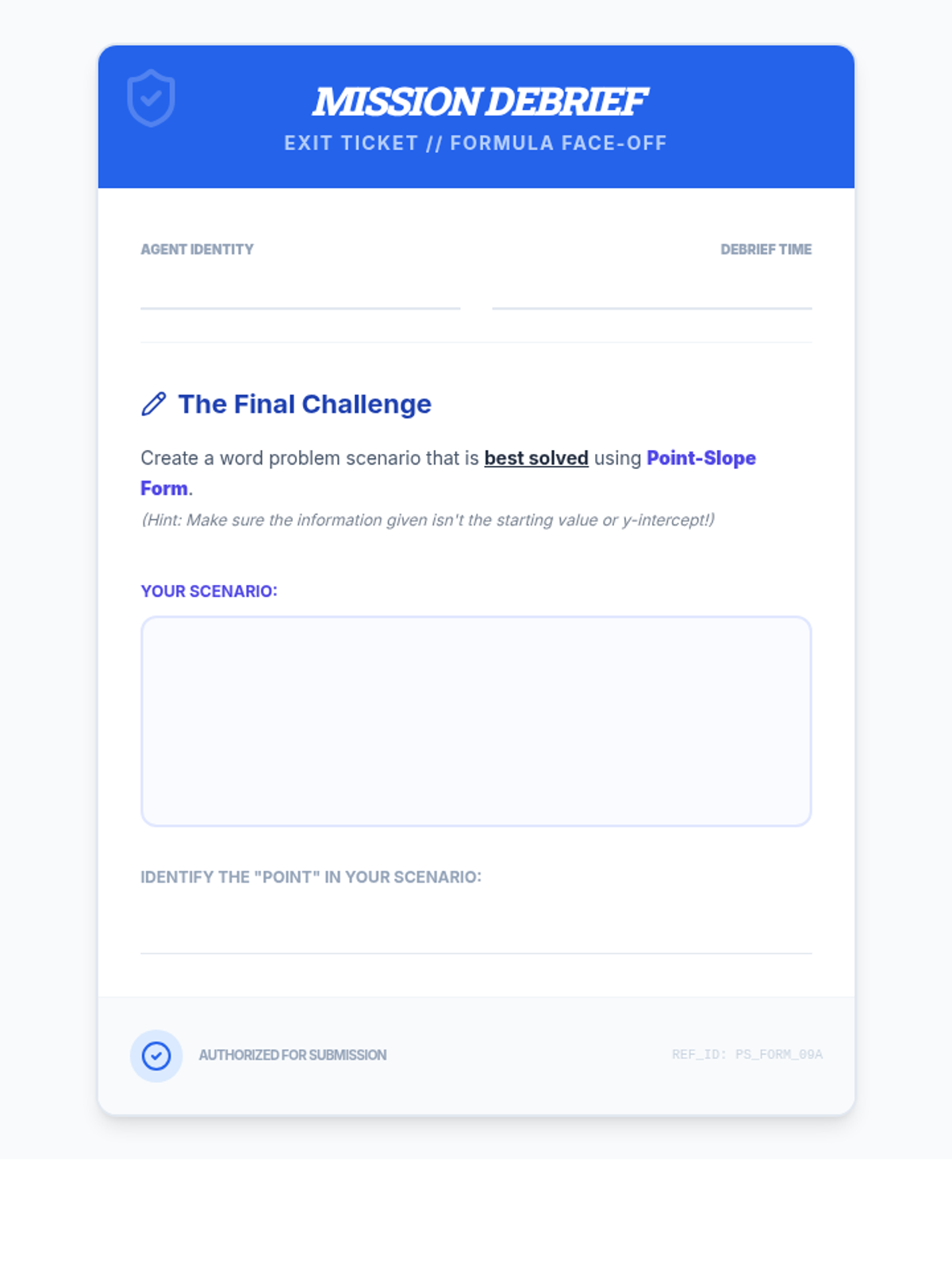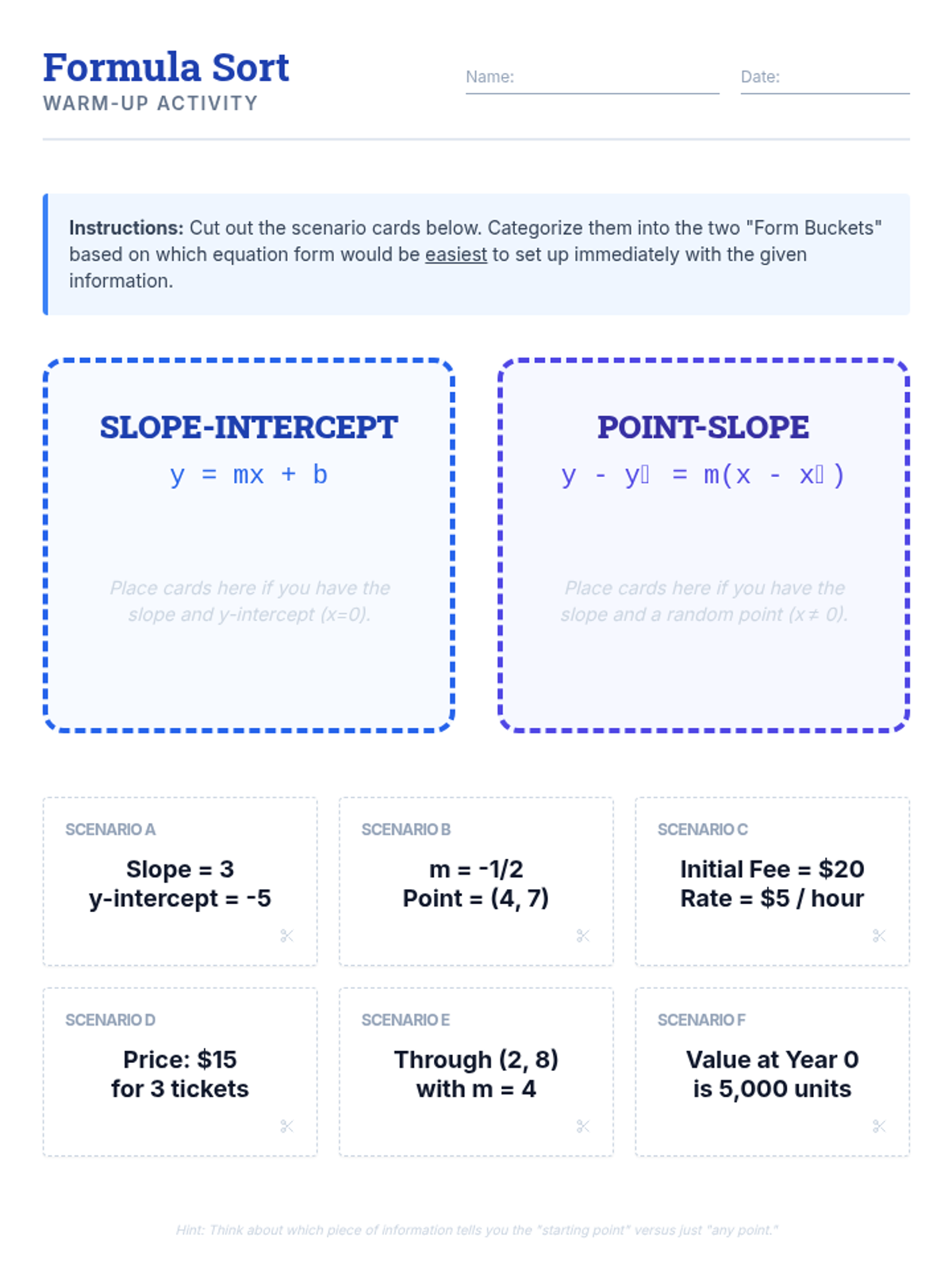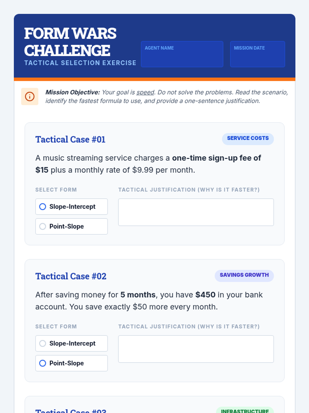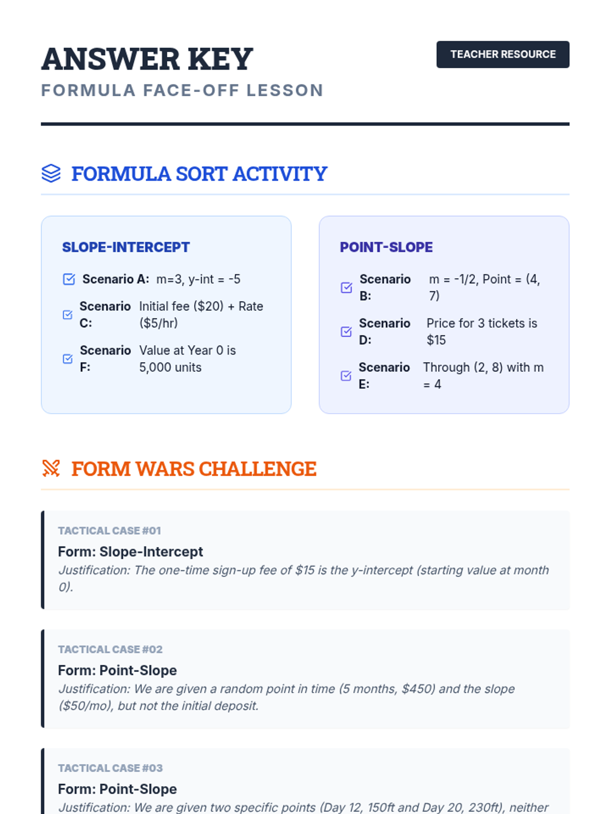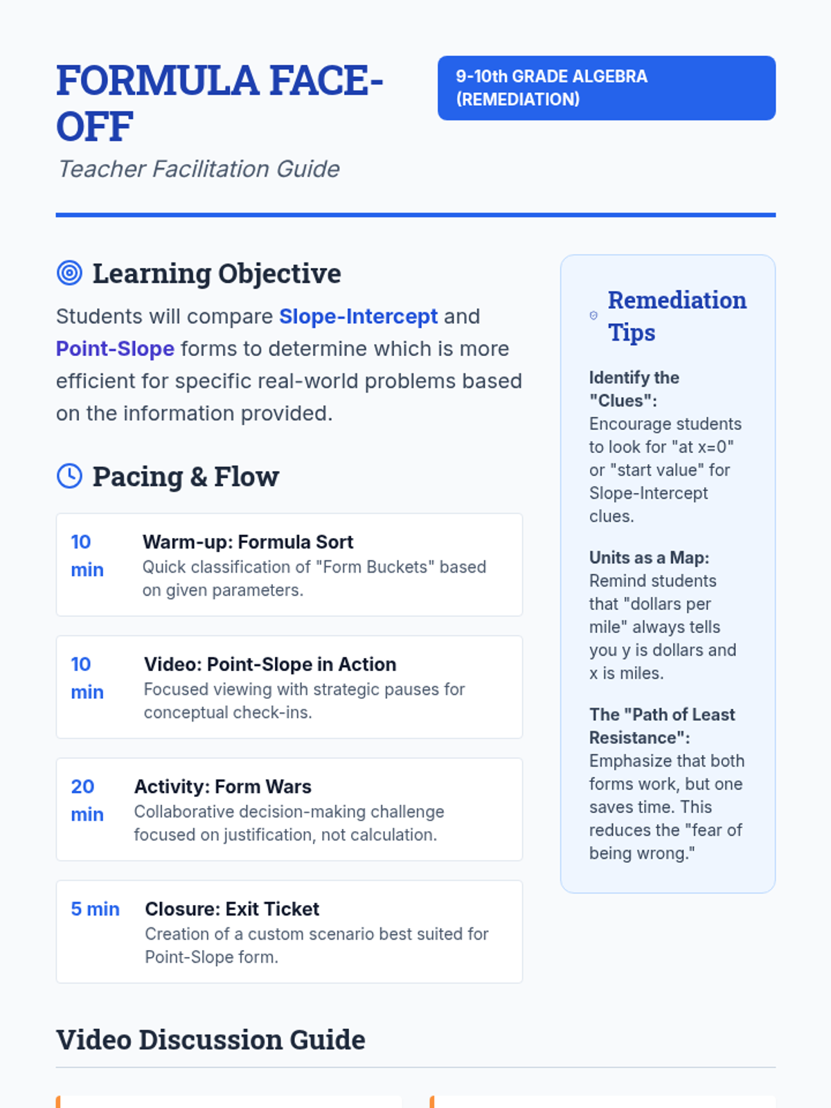 A remediation-focused algebra lesson where students evaluate when to use Slope-Intercept vs. Point-Slope form through the lens of efficiency and real-world data. Students engage with a video-led discussion, a sorting activity, and a decision-making 'Form Wars' challenge.