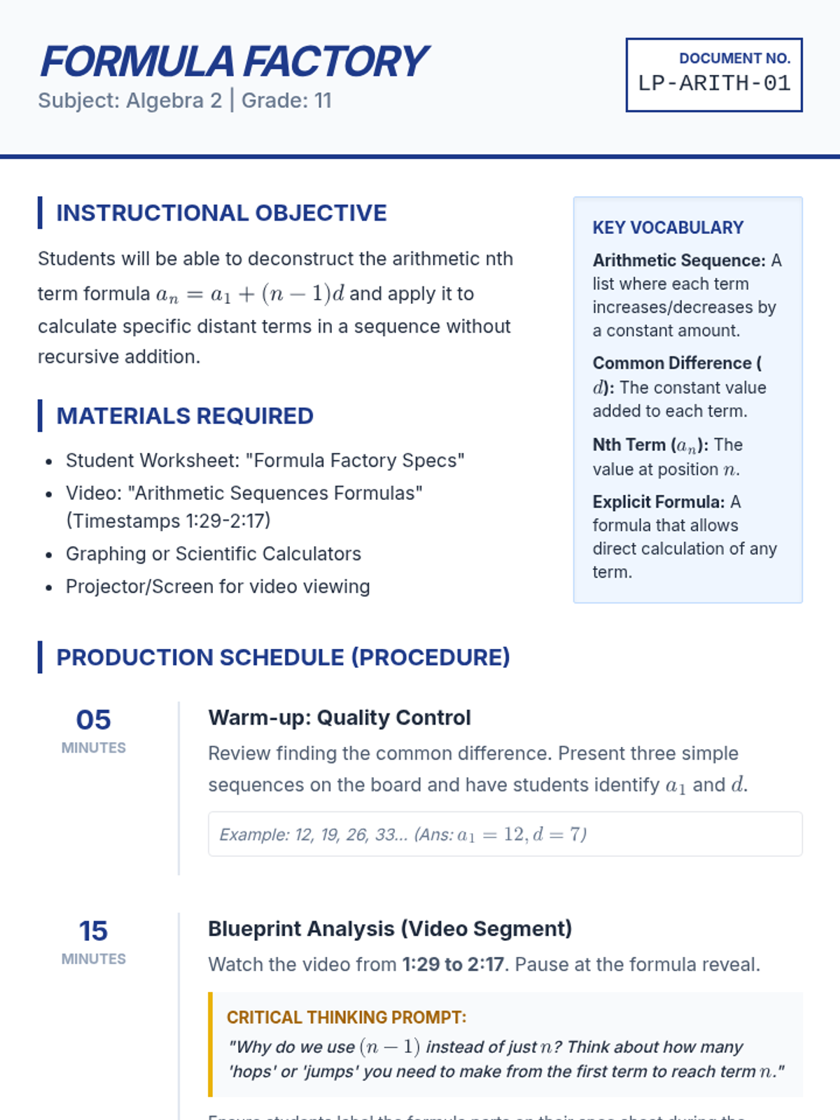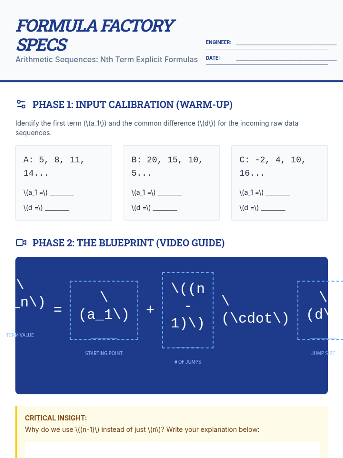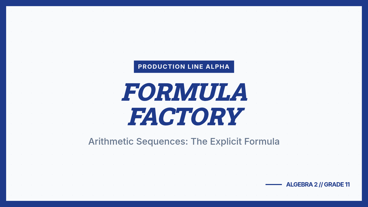 An 11th Grade Algebra 2 lesson focusing on the nth term formula for arithmetic sequences. Students will deconstruct the explicit formula, analyze its components using a video guide, and apply it to find distant terms in the 'Formula Factory' activity.