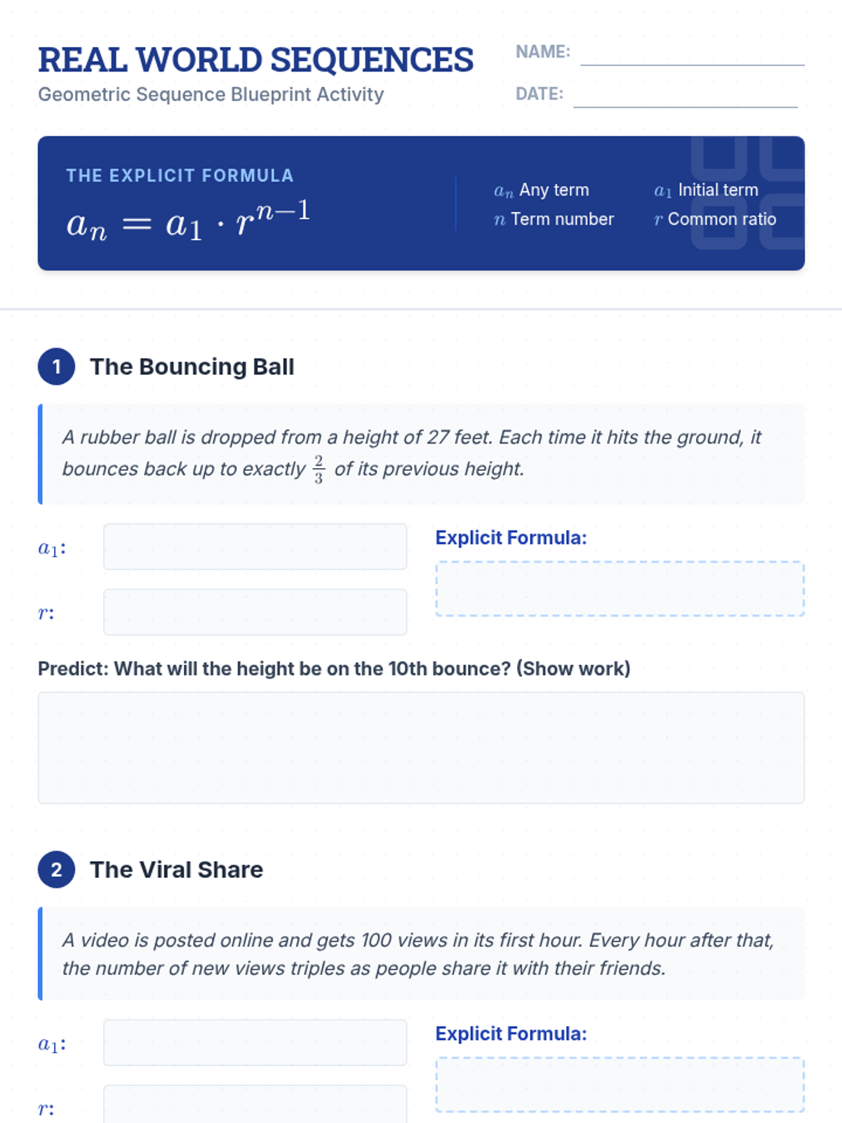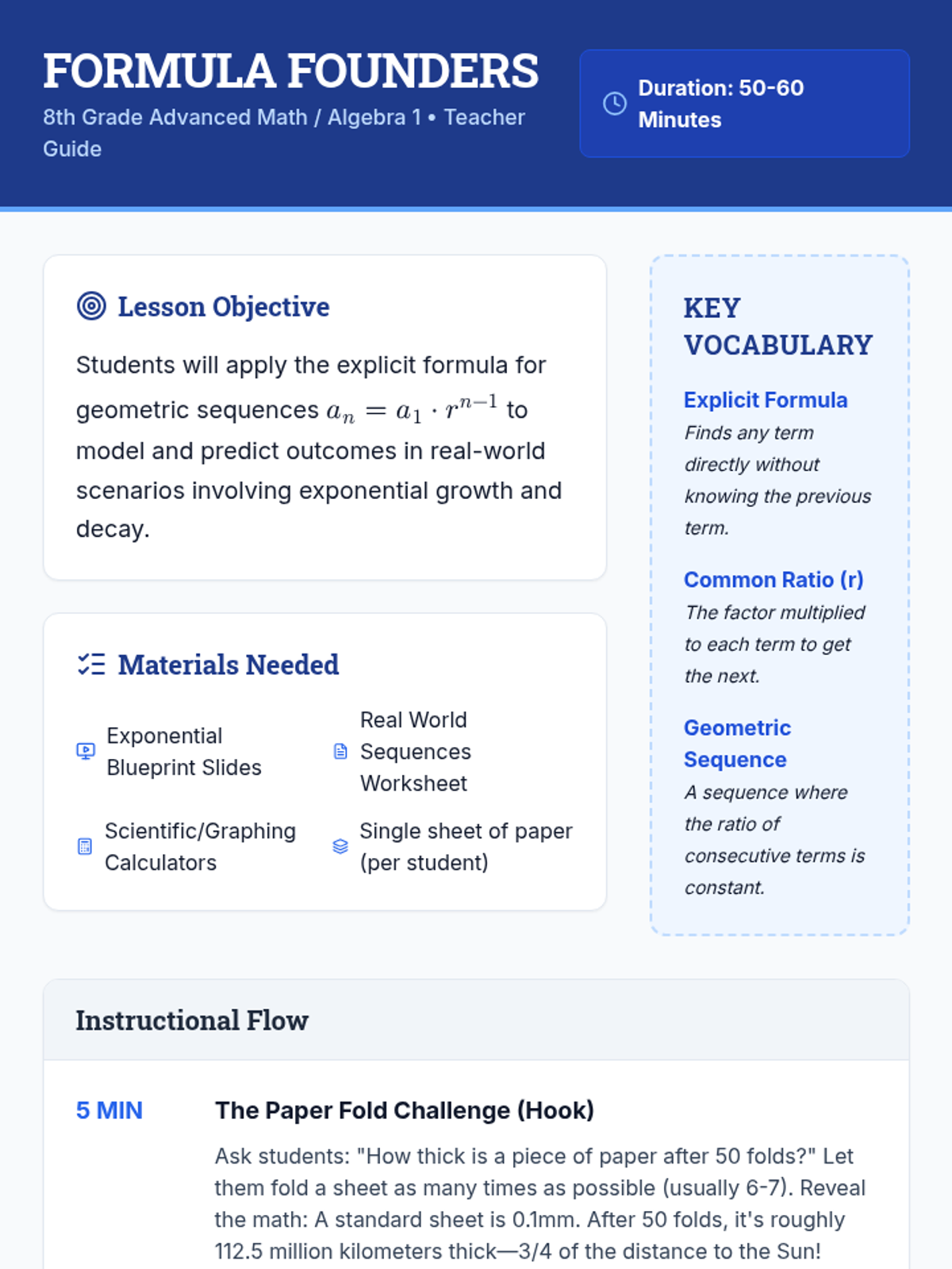 Students explore geometric sequences through a paper-folding hook, a conceptual video on explicit formulas, and real-world application problems involving growth and decay.