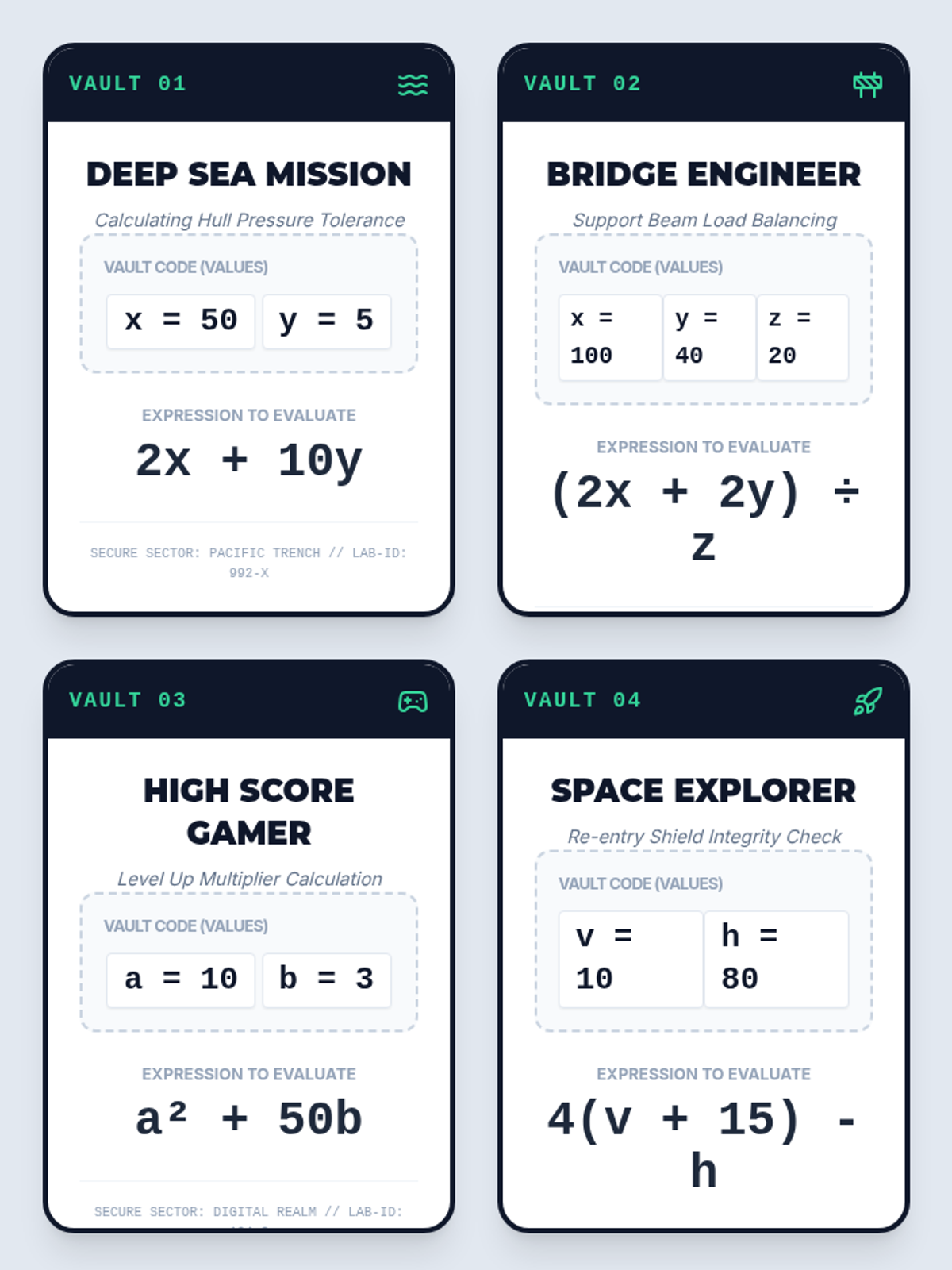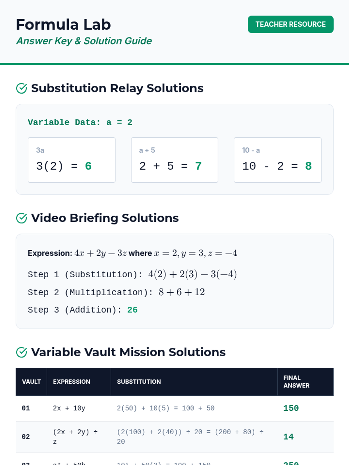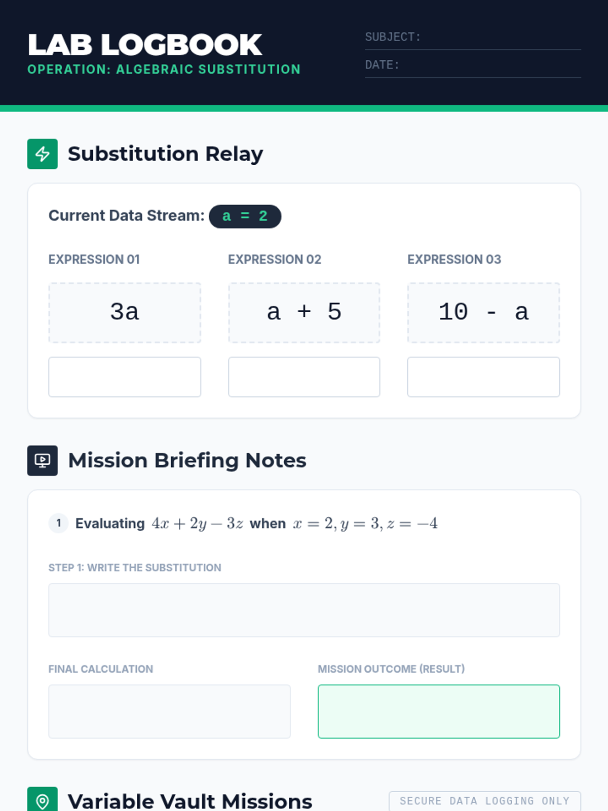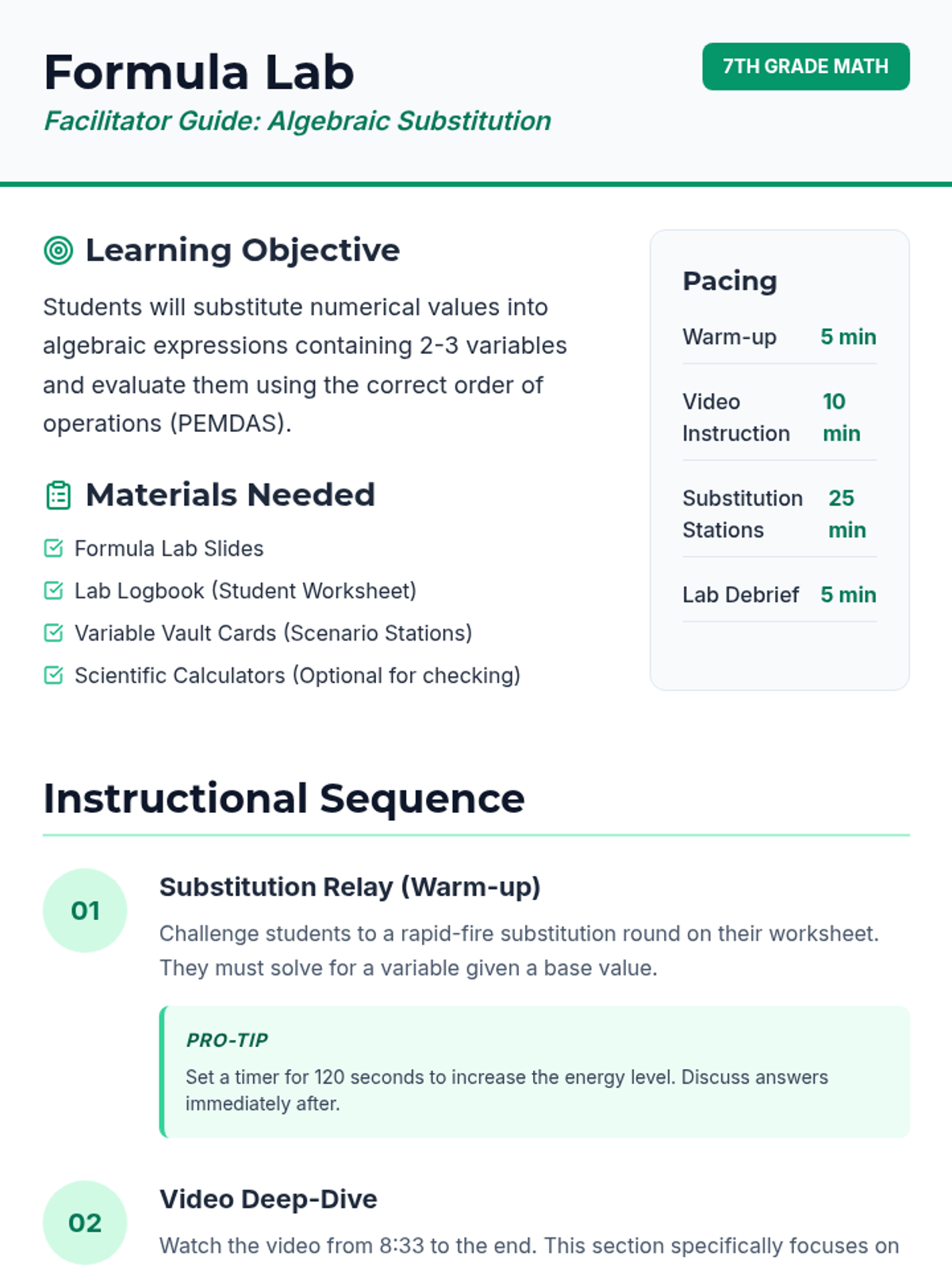 Students will master algebraic substitution by evaluating expressions with 2-3 variables. The lesson features a hands-on 'Substitution Stations' activity where students apply math to real-world role-play scenarios.